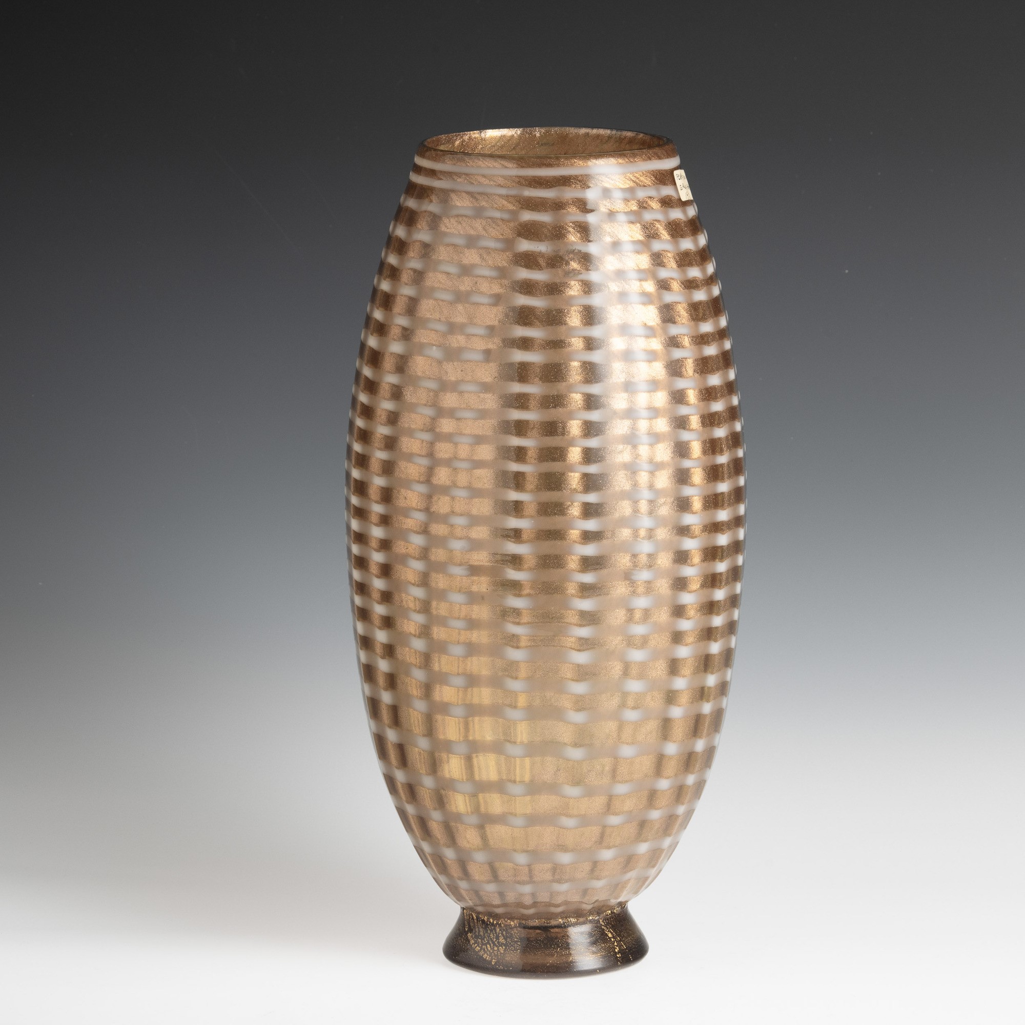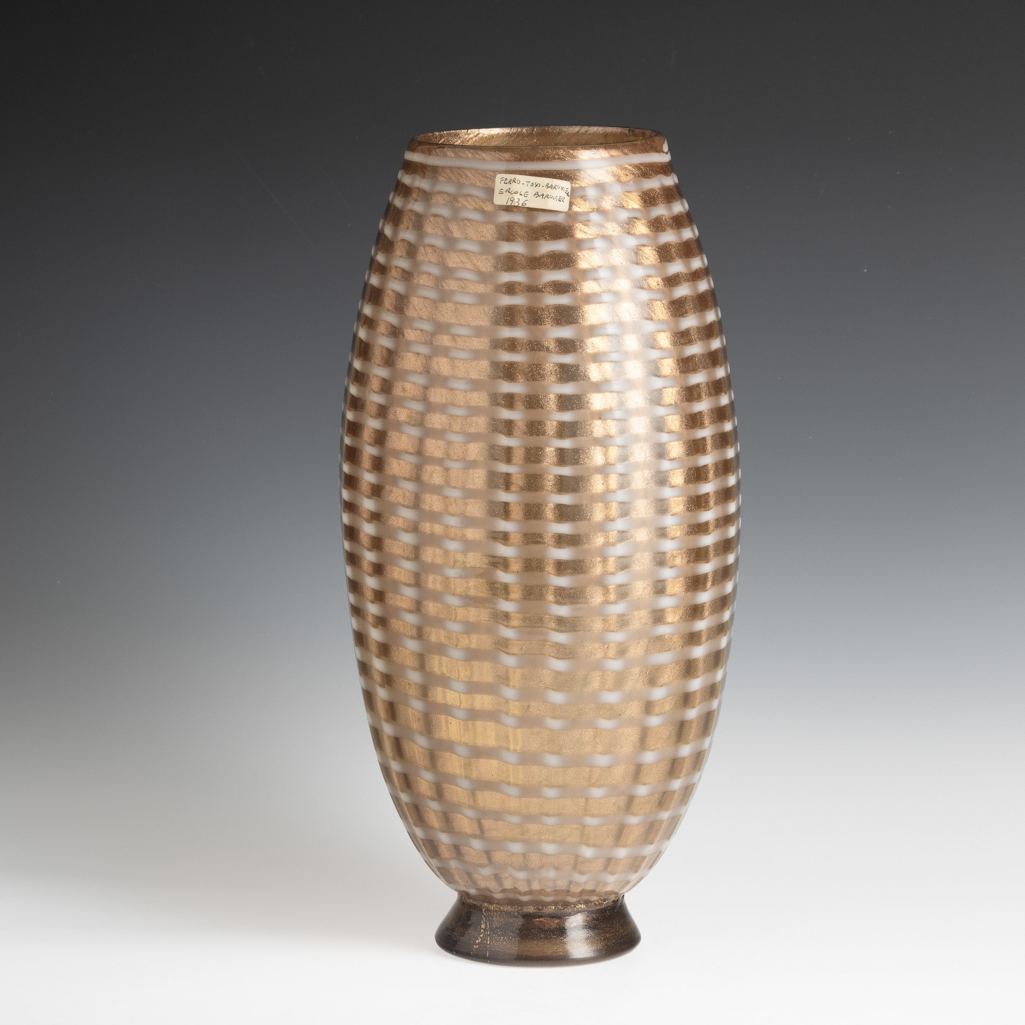 Ovoid blown glass vase on truncated cone foot with decoration of aventurine and 'lattimo' (milky) cane ribbing.