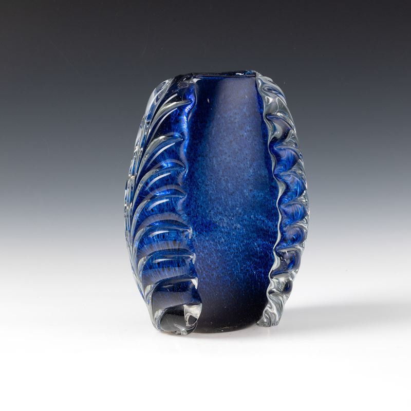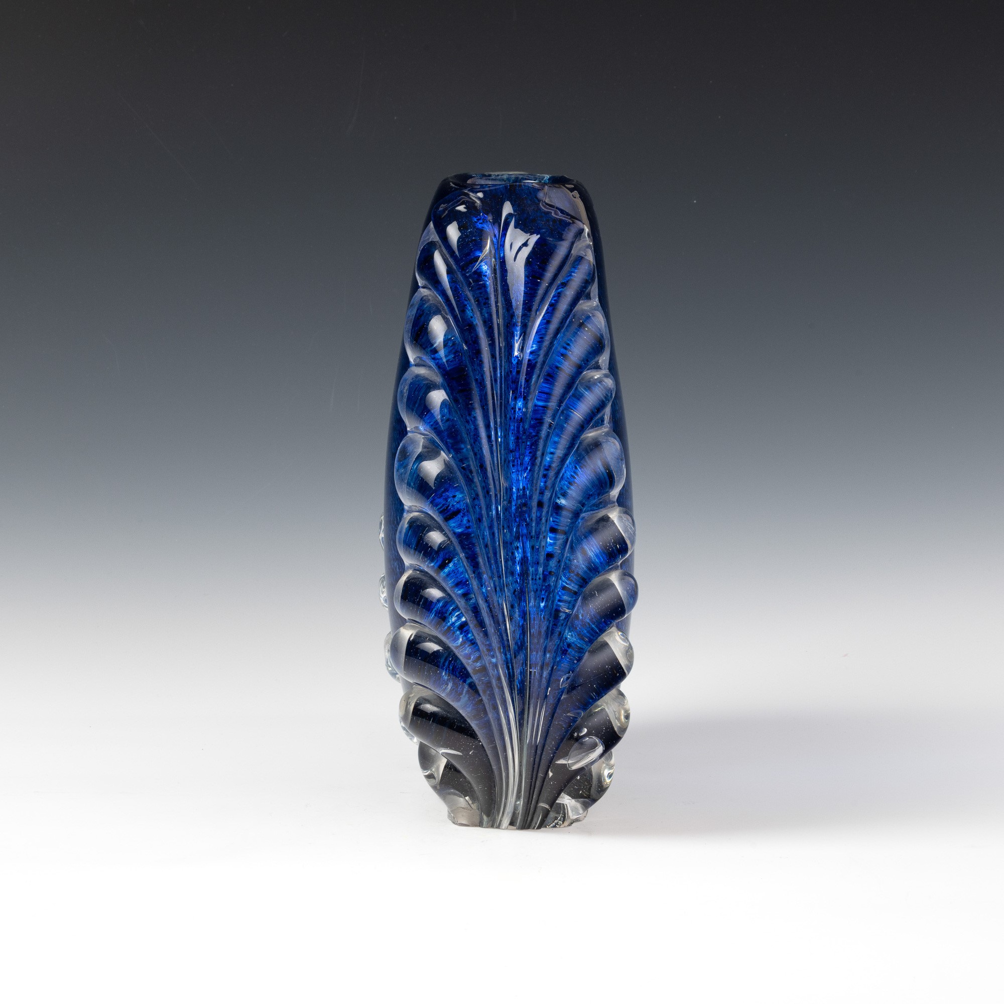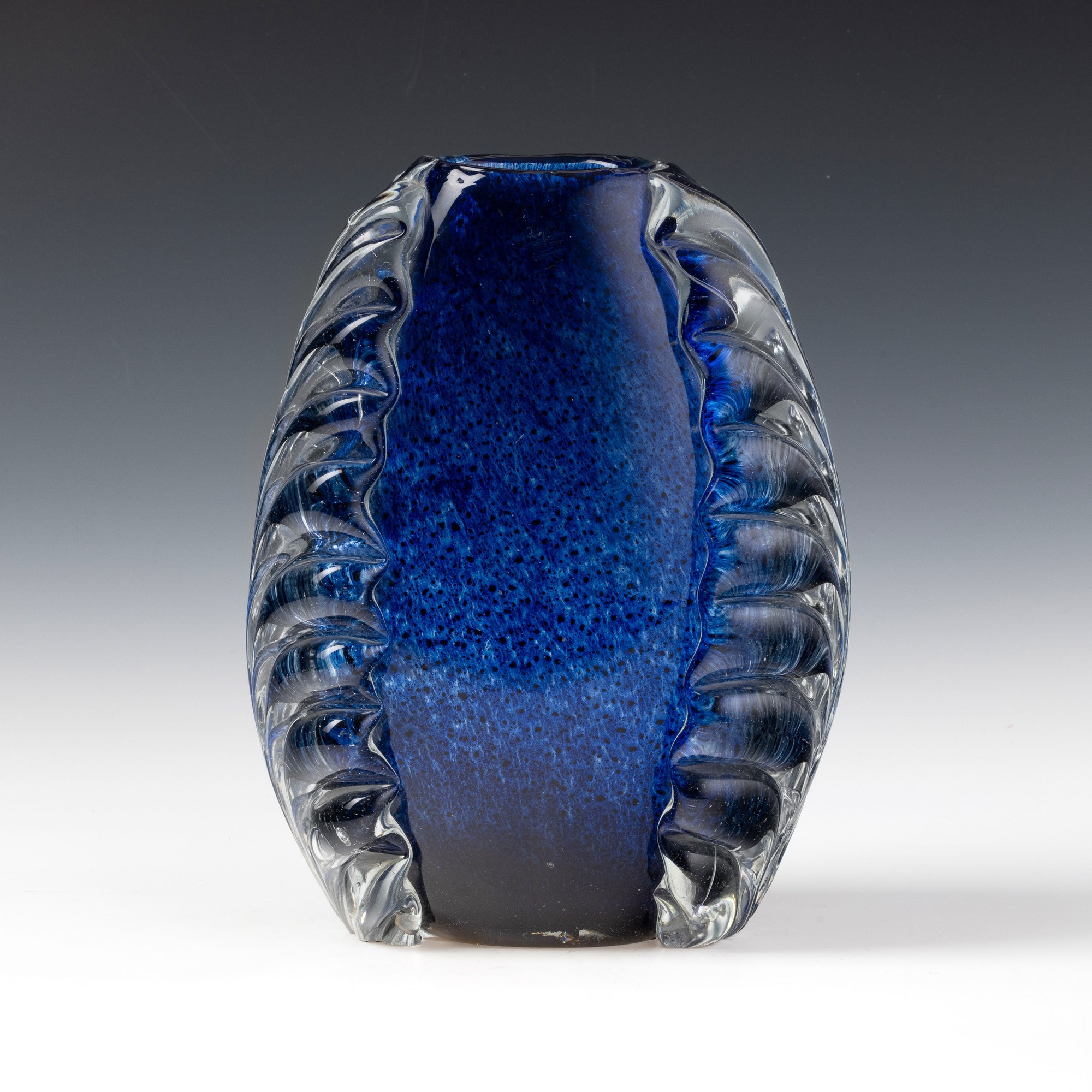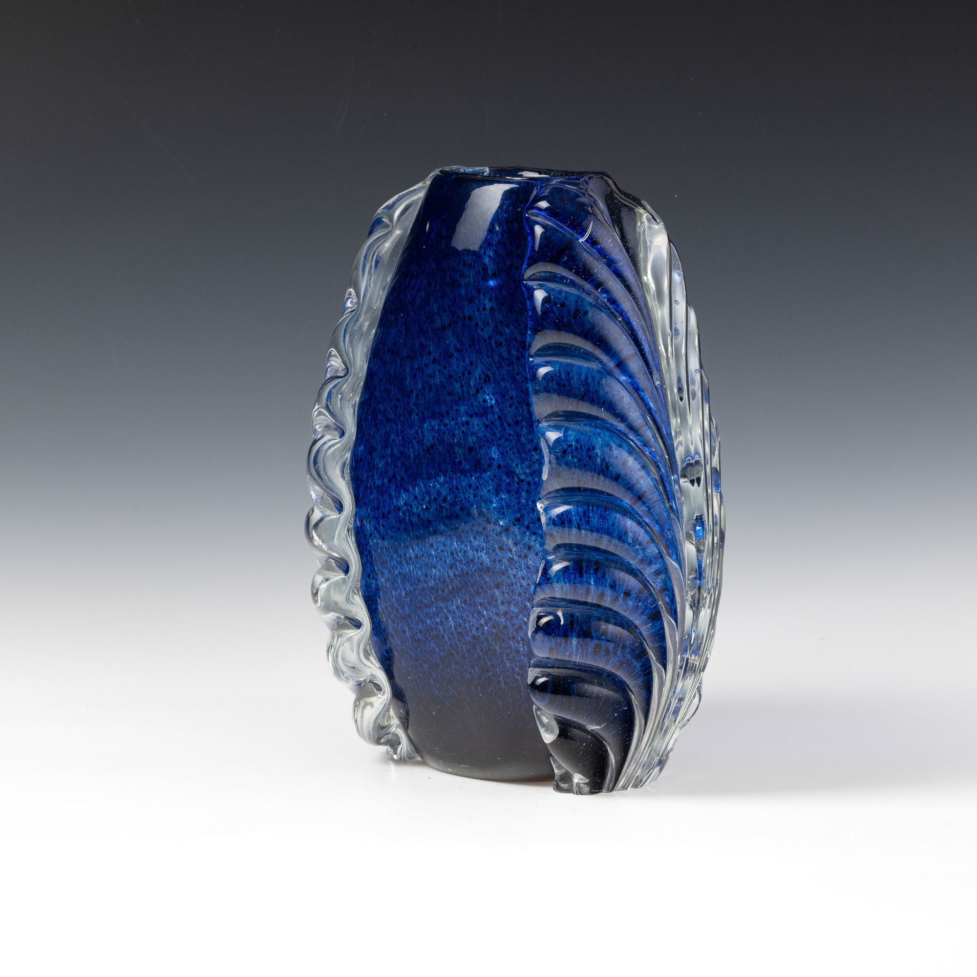 Large Zaffiro series ovoid vase in polychrome powder heavy blue glass decorated with large applied leaves in heat-moulded clear glass.