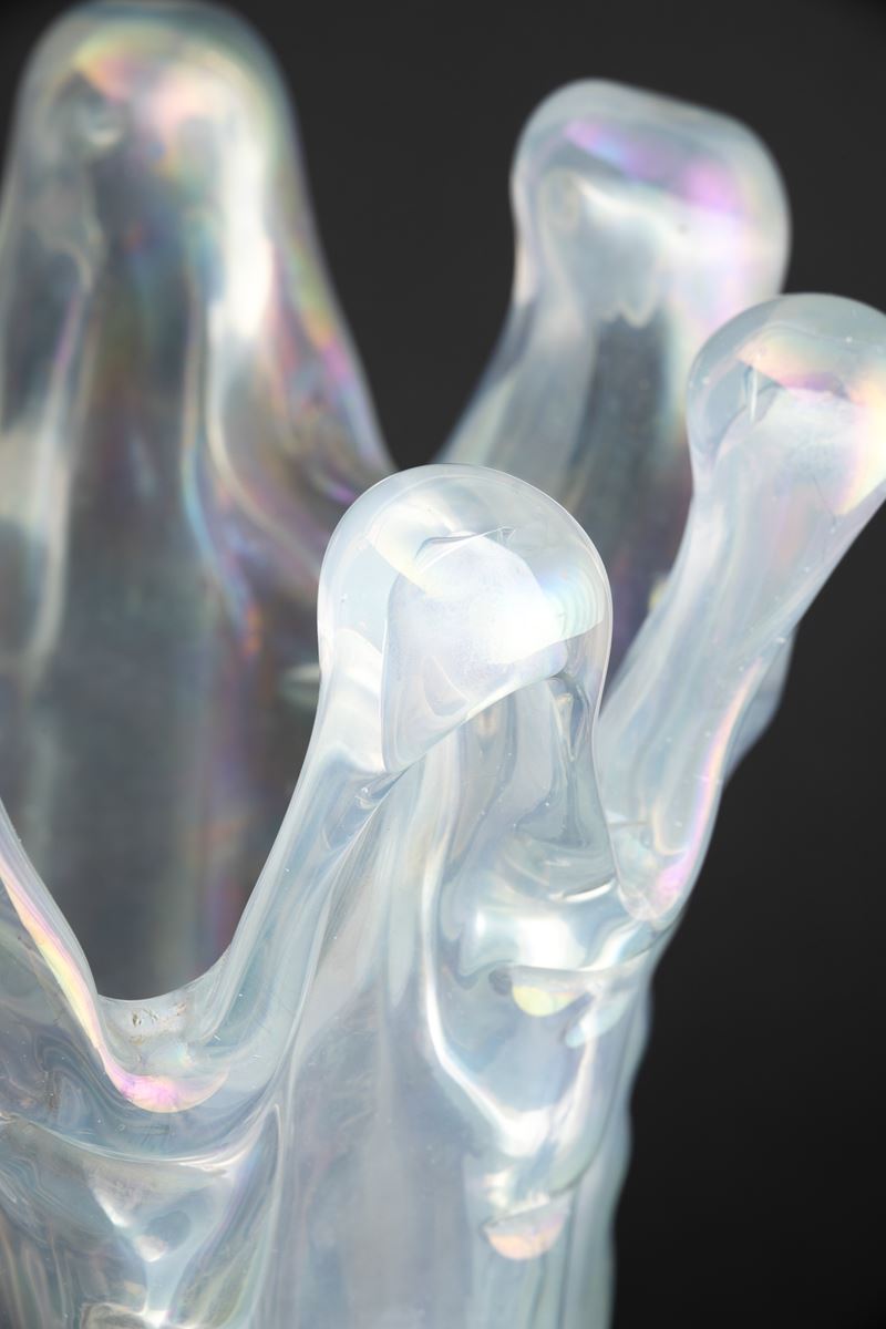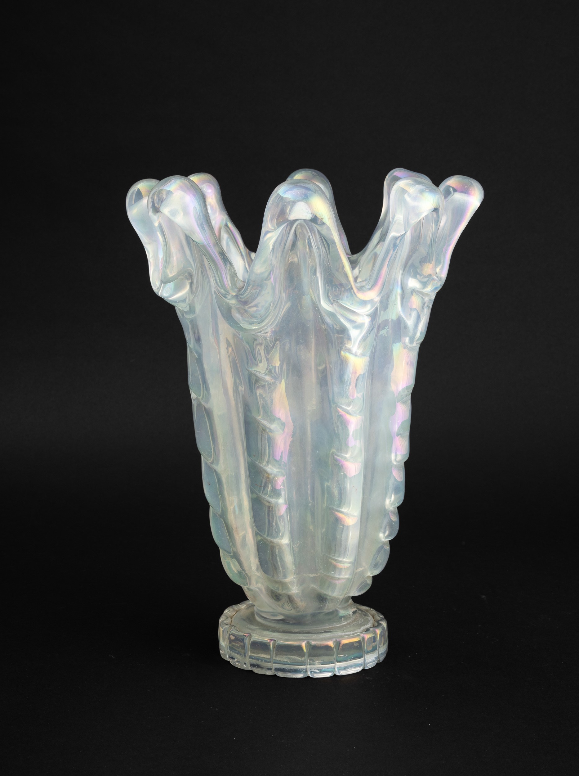 Large A Grosse Costolature series vase in heavy iridescent glass with crested mouth on round solid glass base.