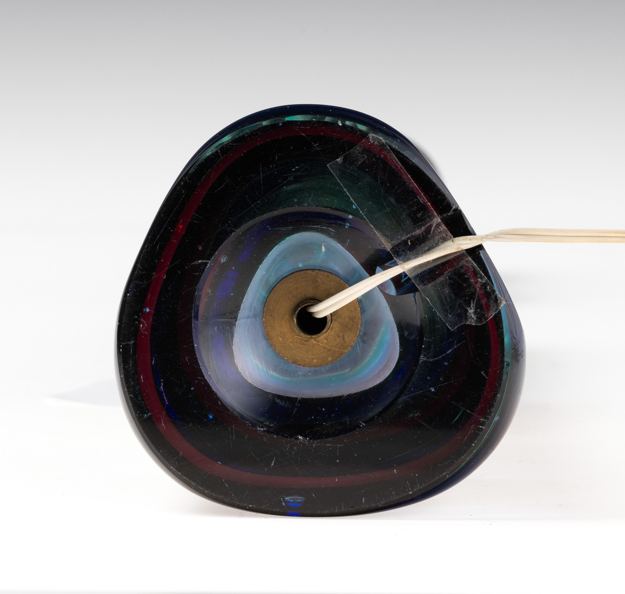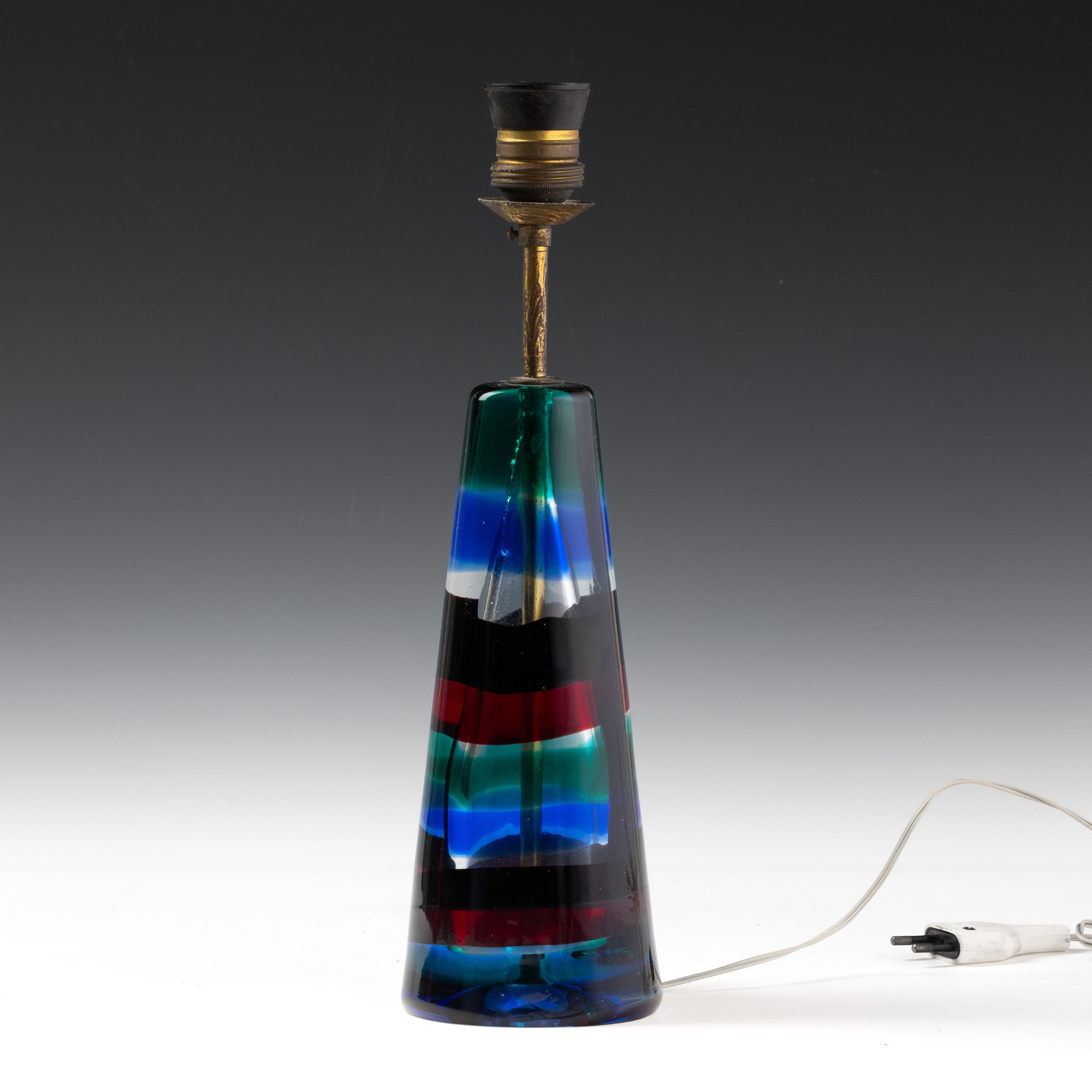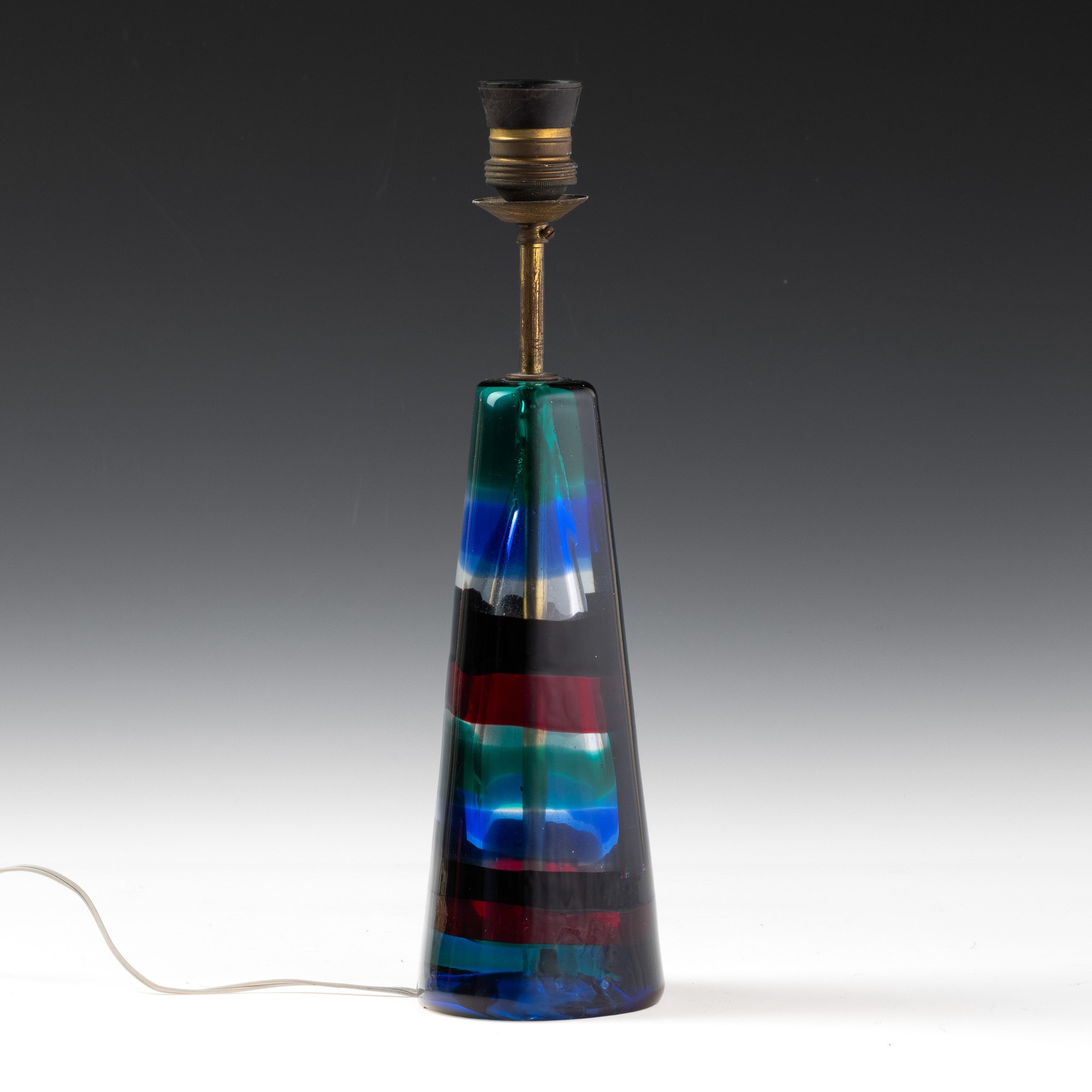 Truncated pyramid shape lamp base with triangular section in heavy glass decorated with polychrome sommerso bands.