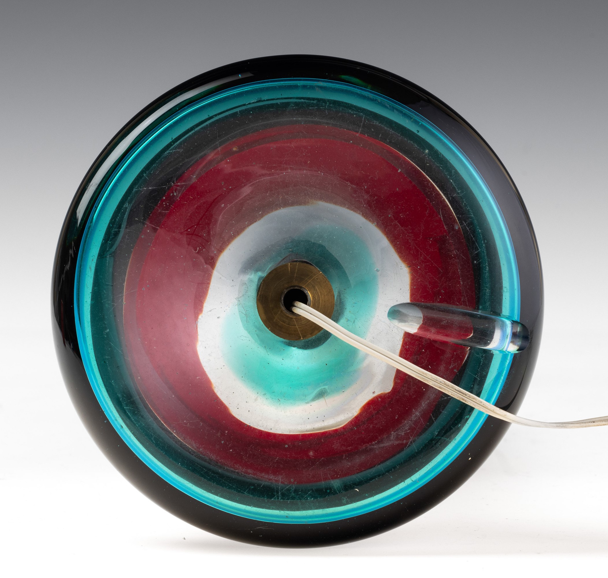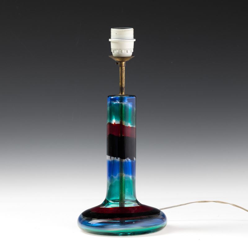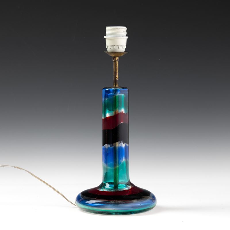 Club-shape lamp base in heavy glass decorated with polychrome sommerso bands.