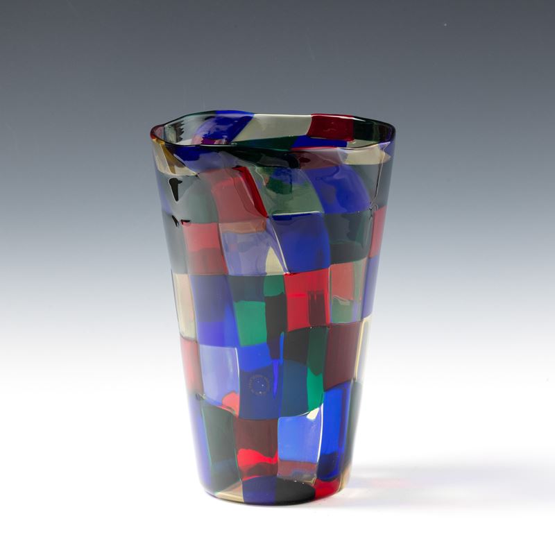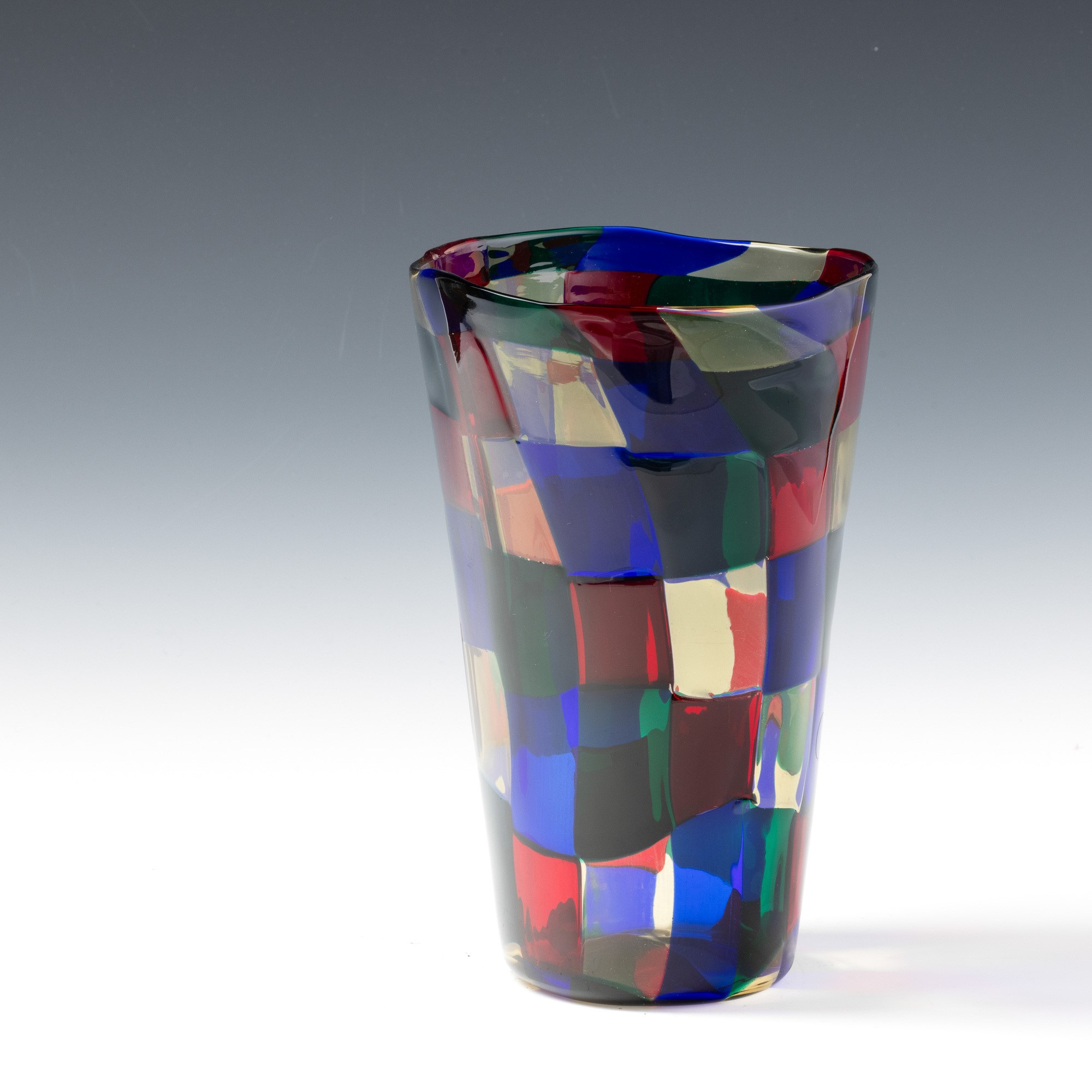 Pezzati series truncated cone vase in blown glass decorated with multicoloured tiles in the Parigi version.