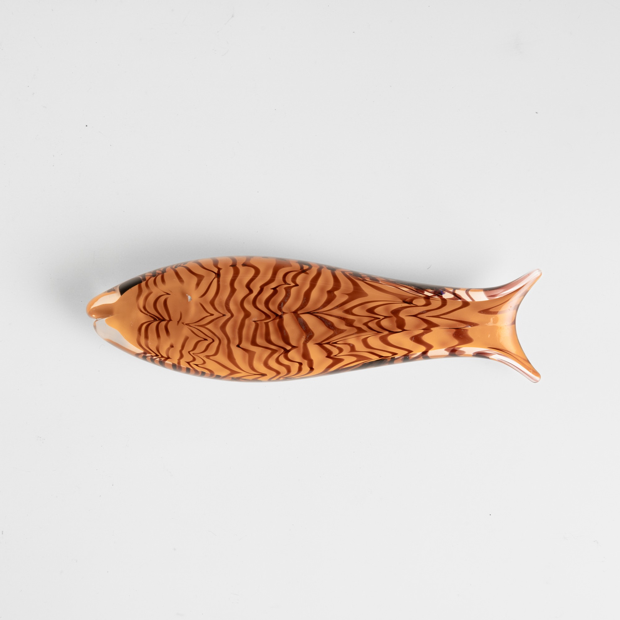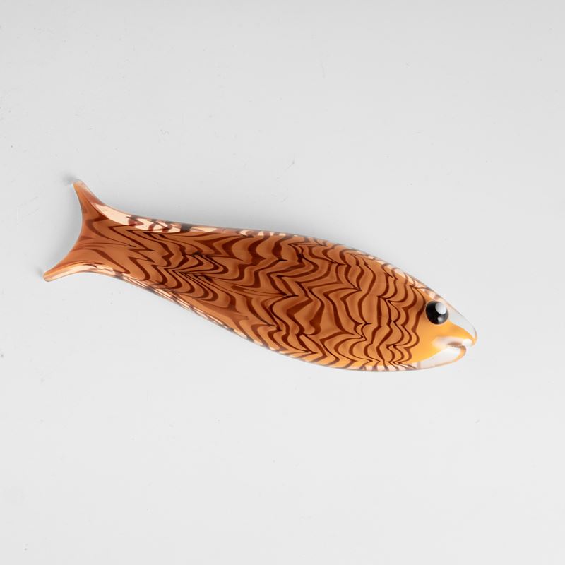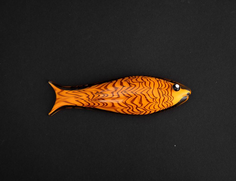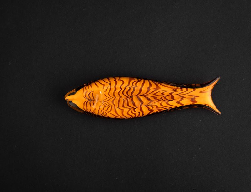 Fish ornament in orange glass cased in straw-colour glass with amethyst cane 'fenicio' decoration.