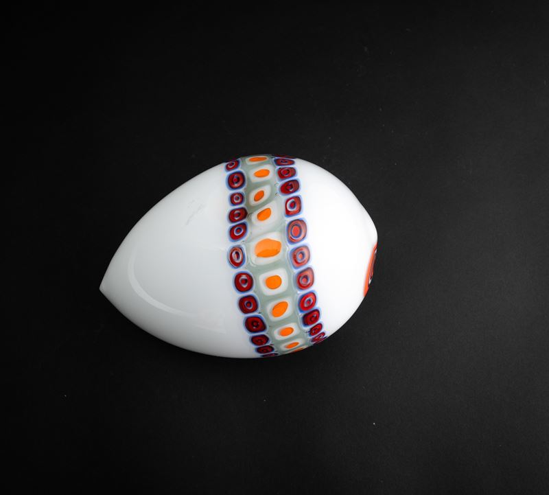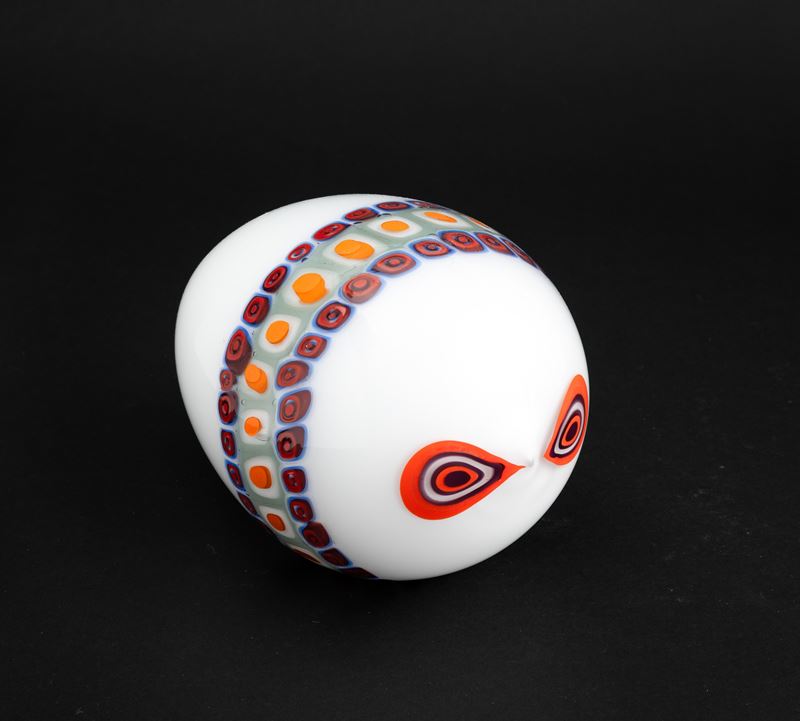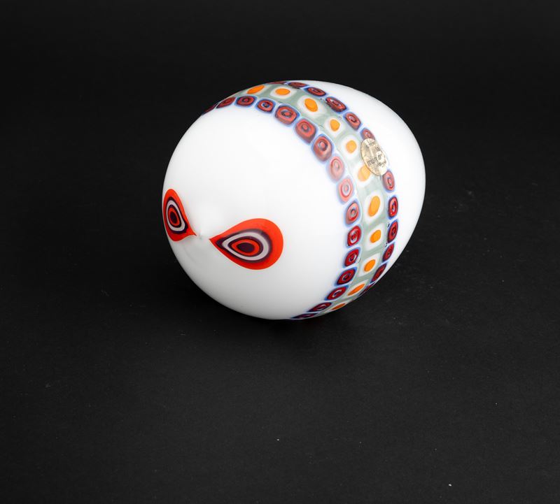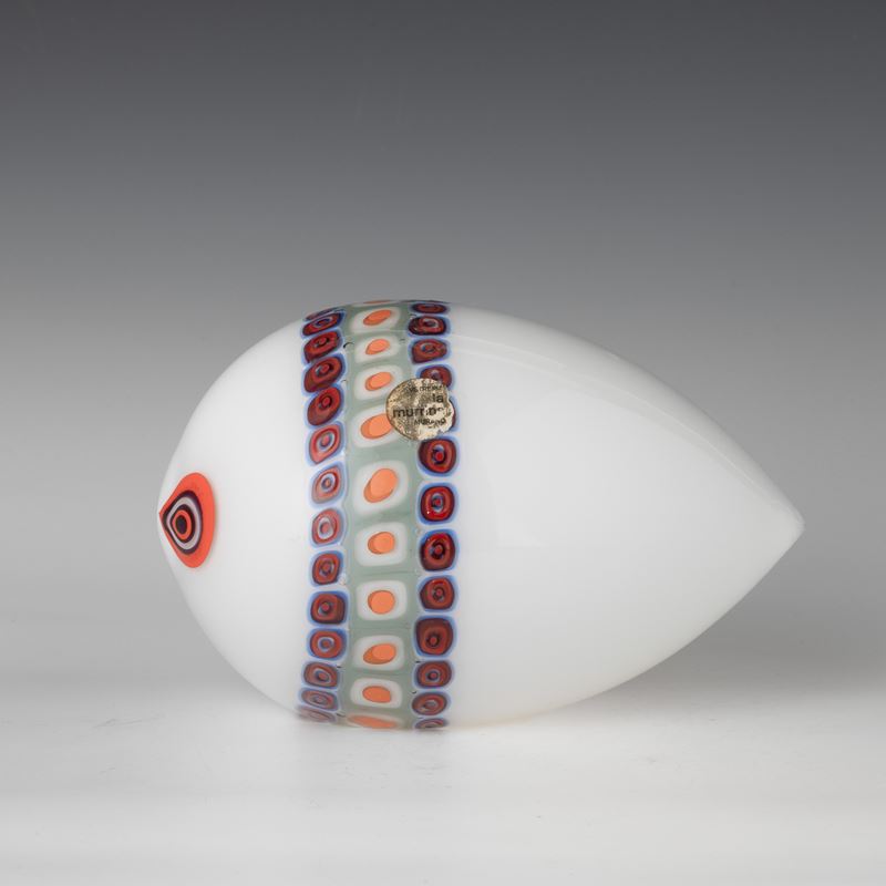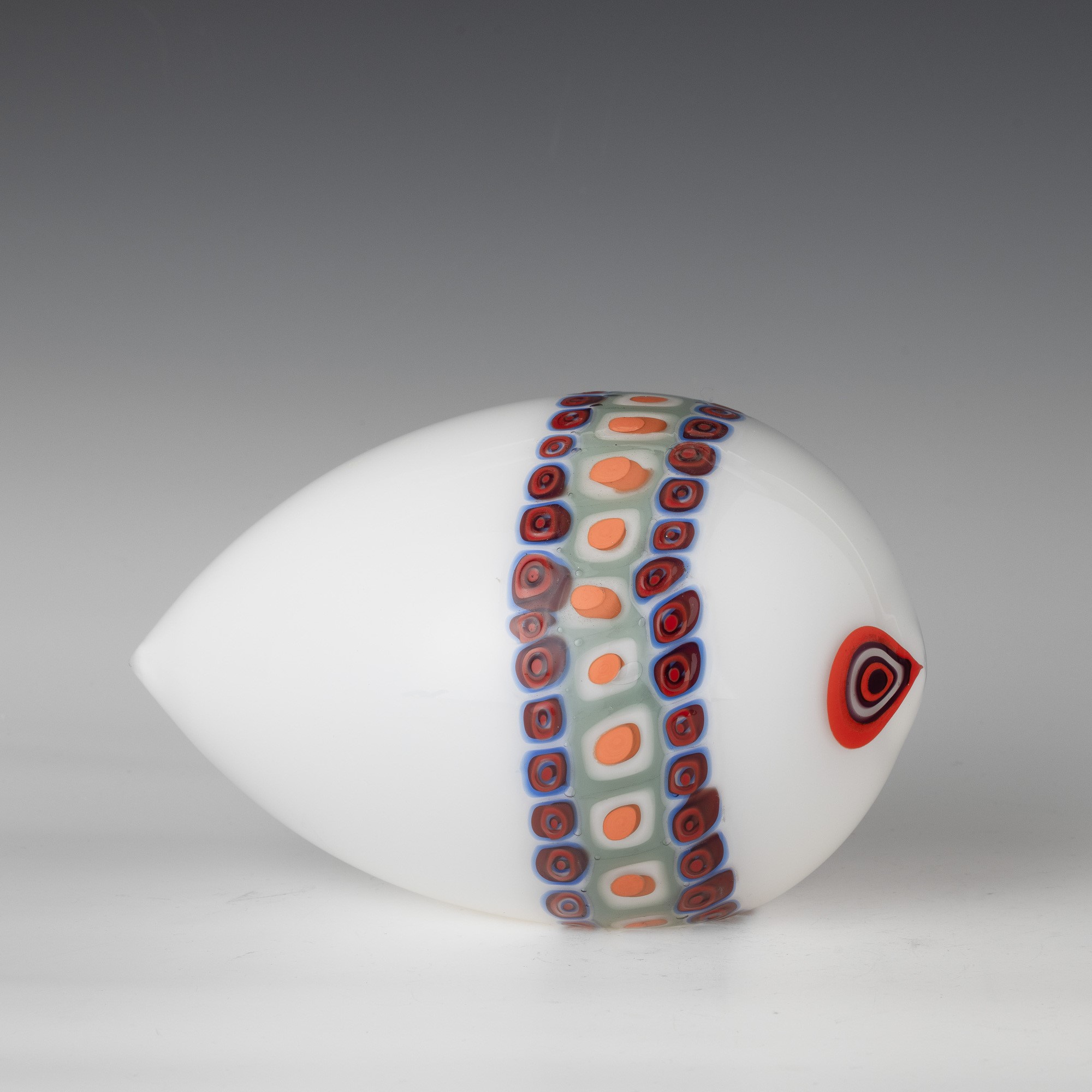Stylised fish ornament in 'lattimo' (milky) glass decorated with polychrome murrine band.