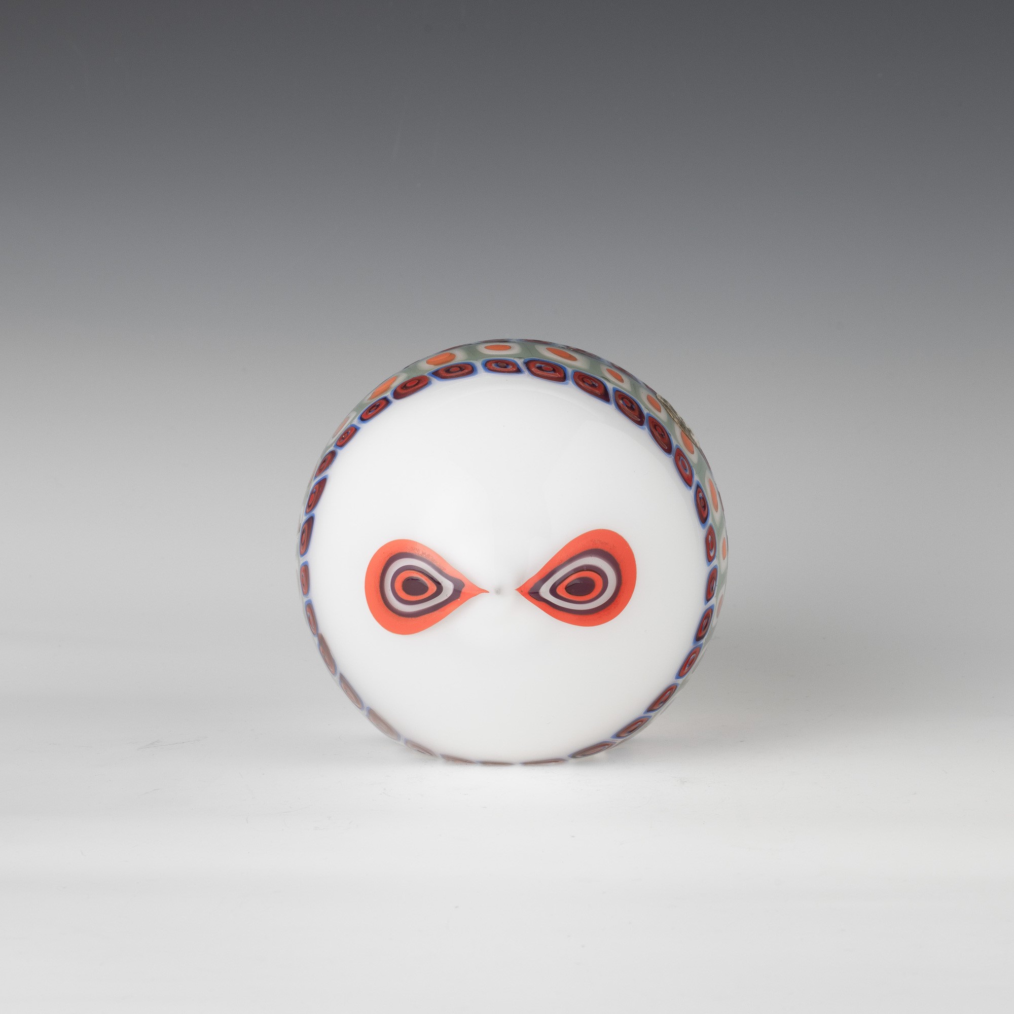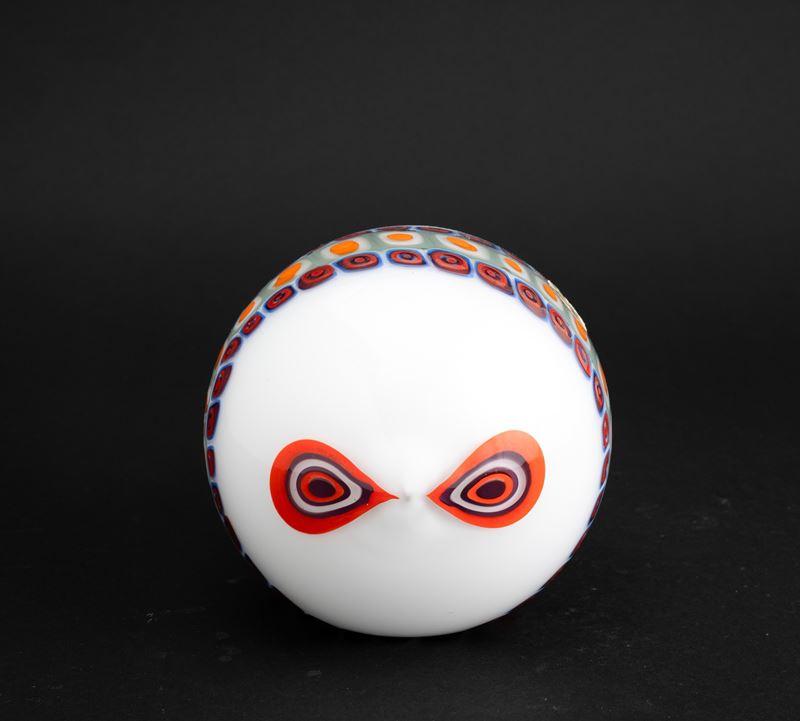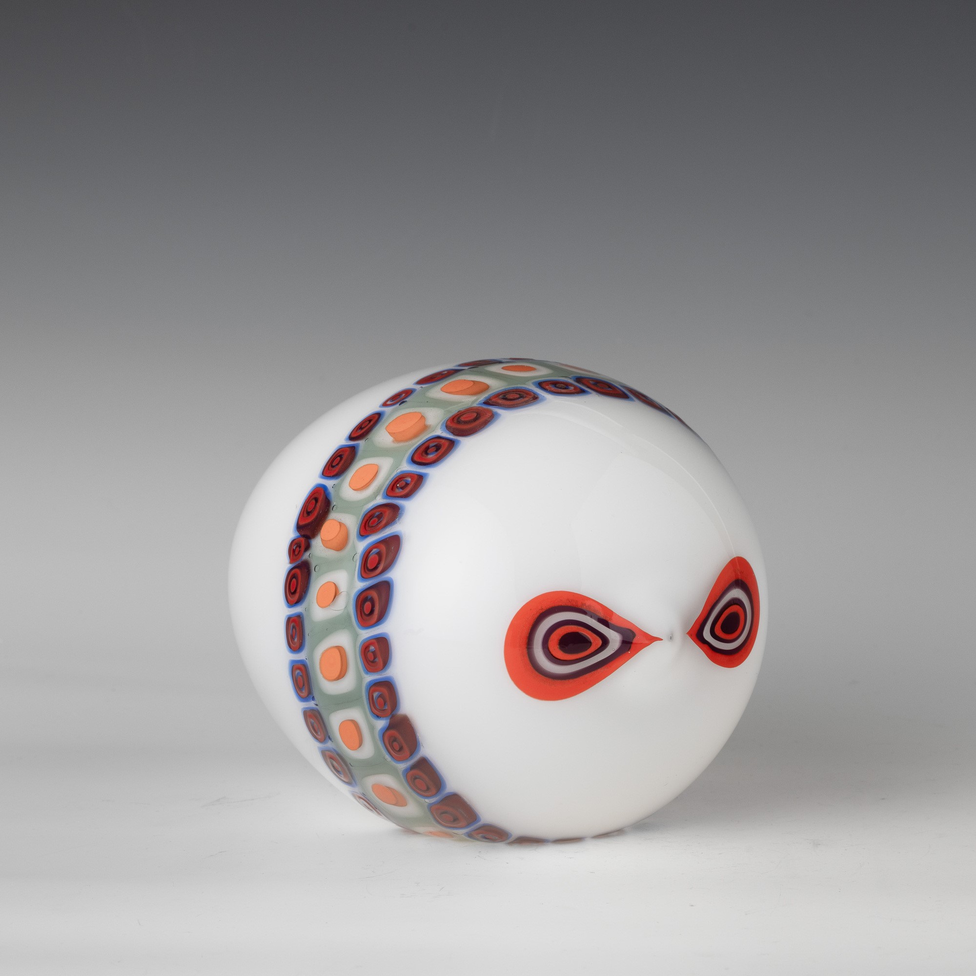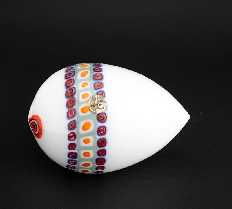 Stylised fish ornament in 'lattimo' (milky) glass decorated with polychrome murrine band.
