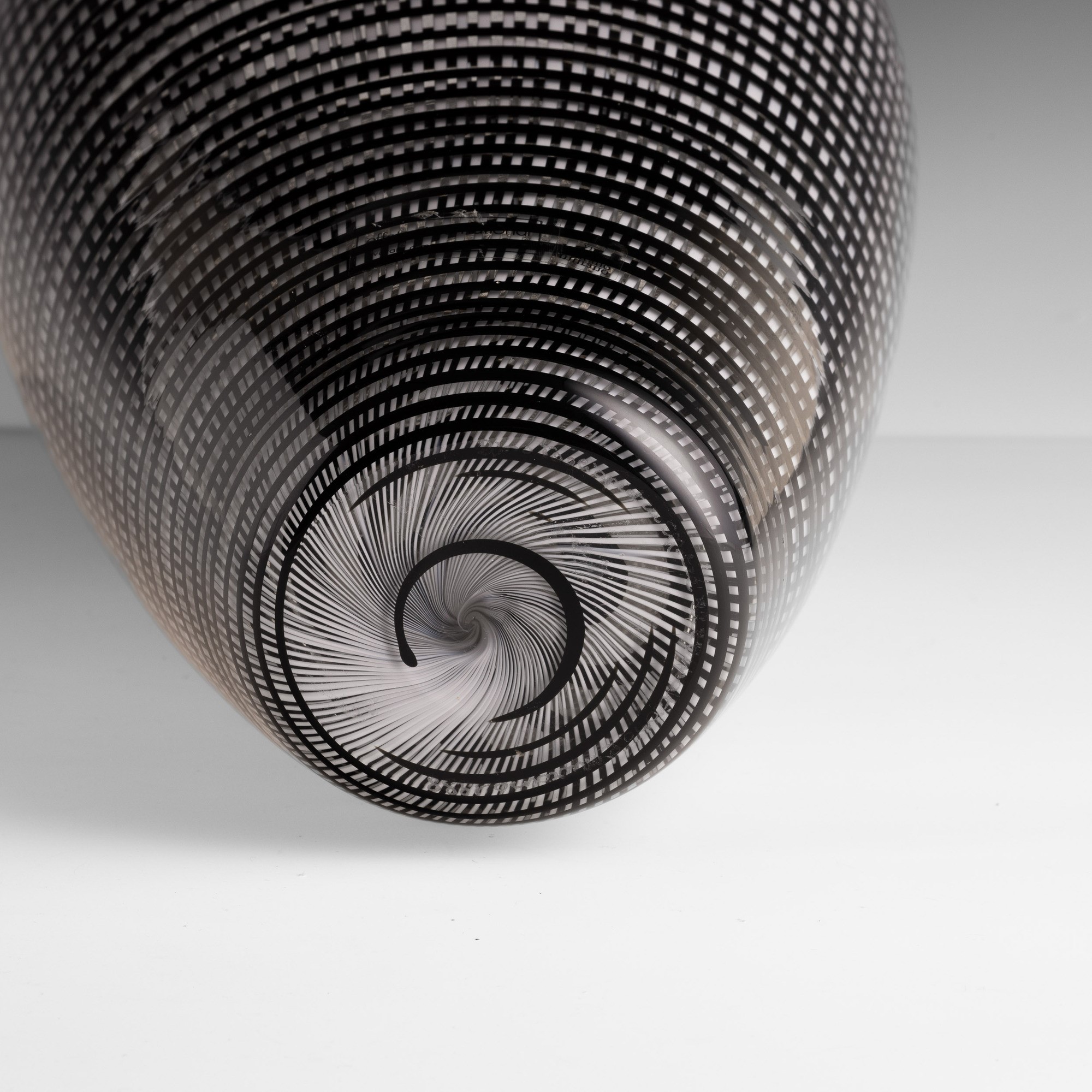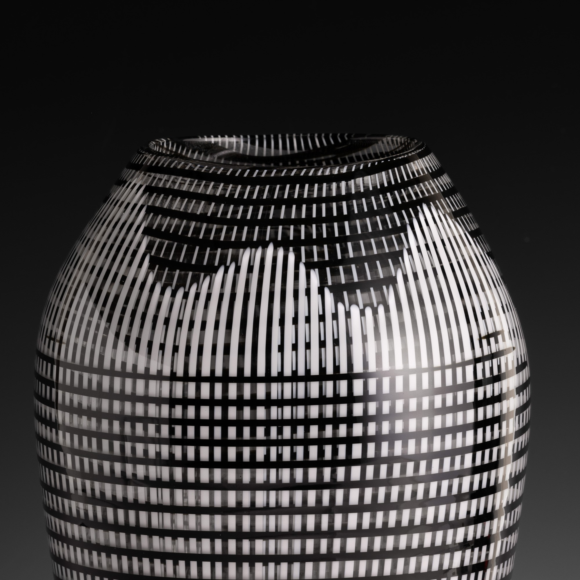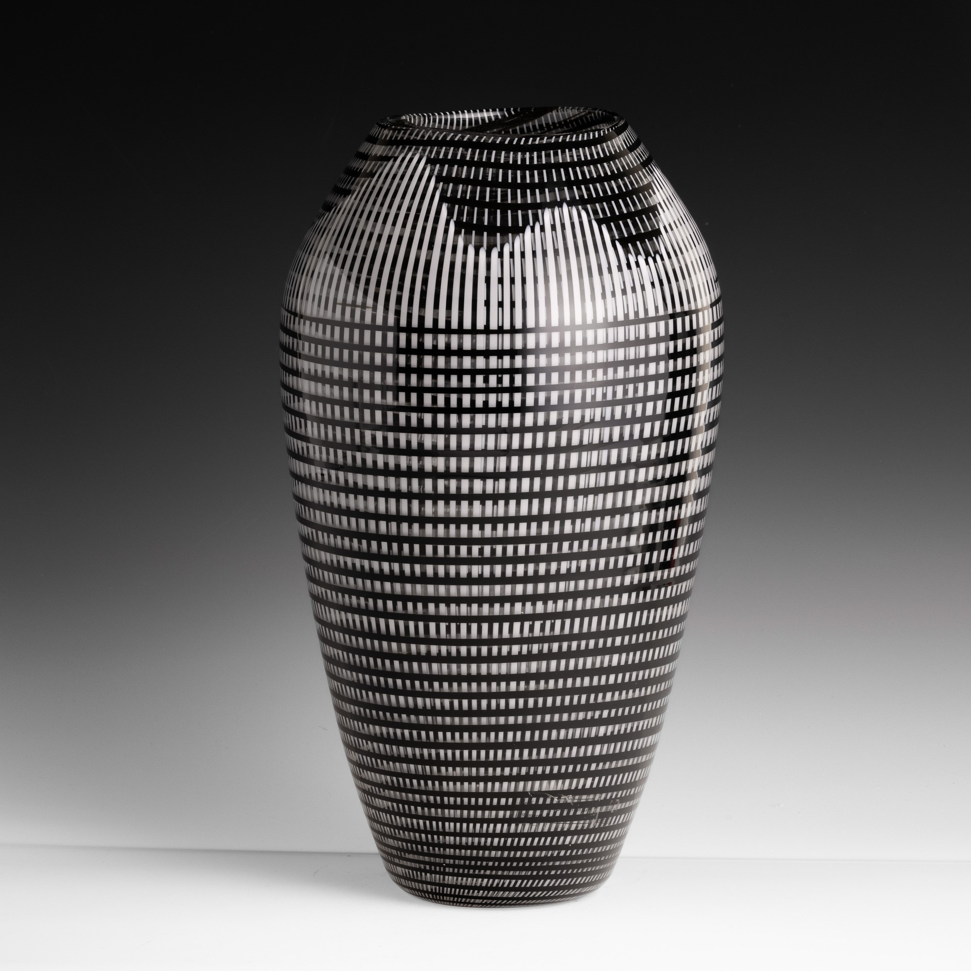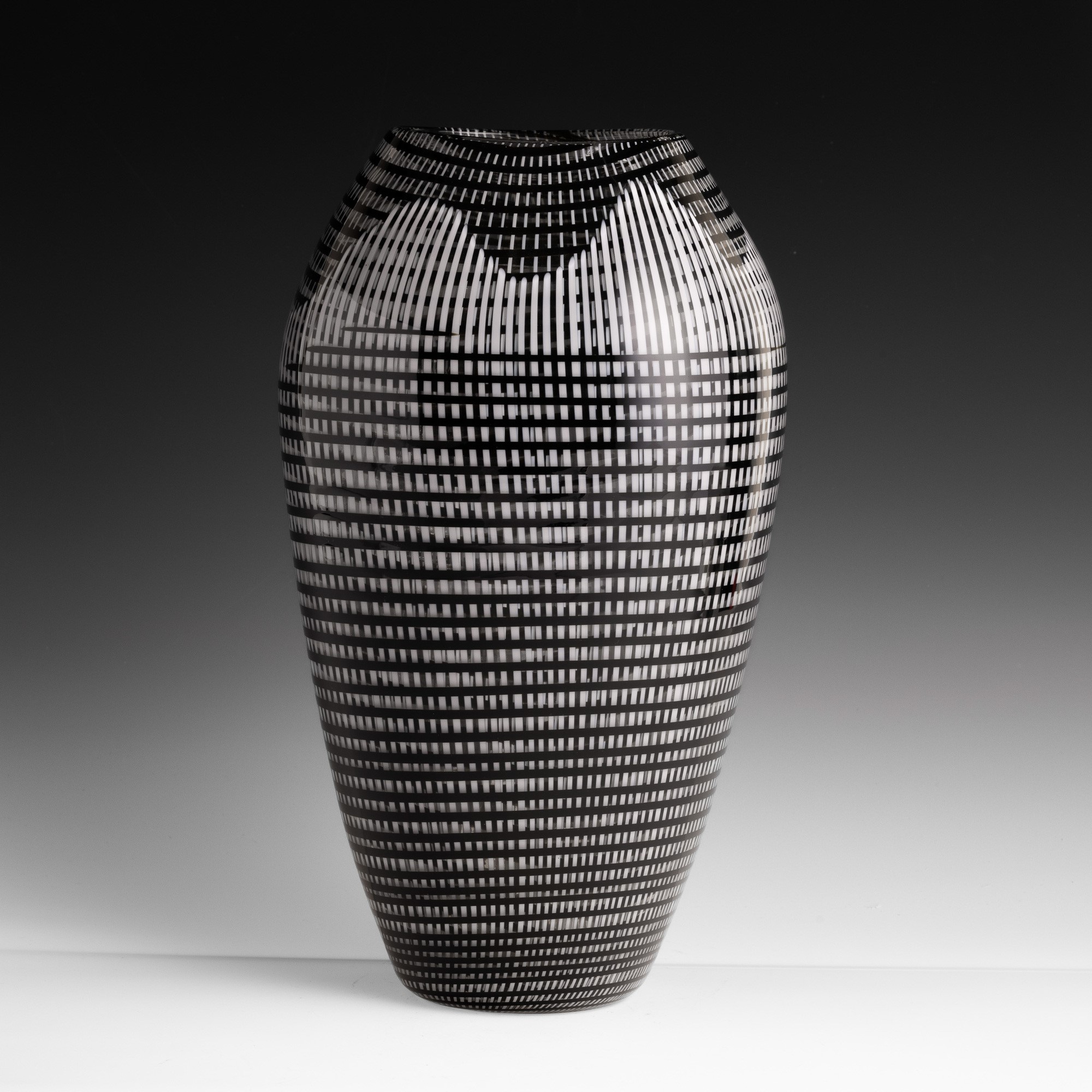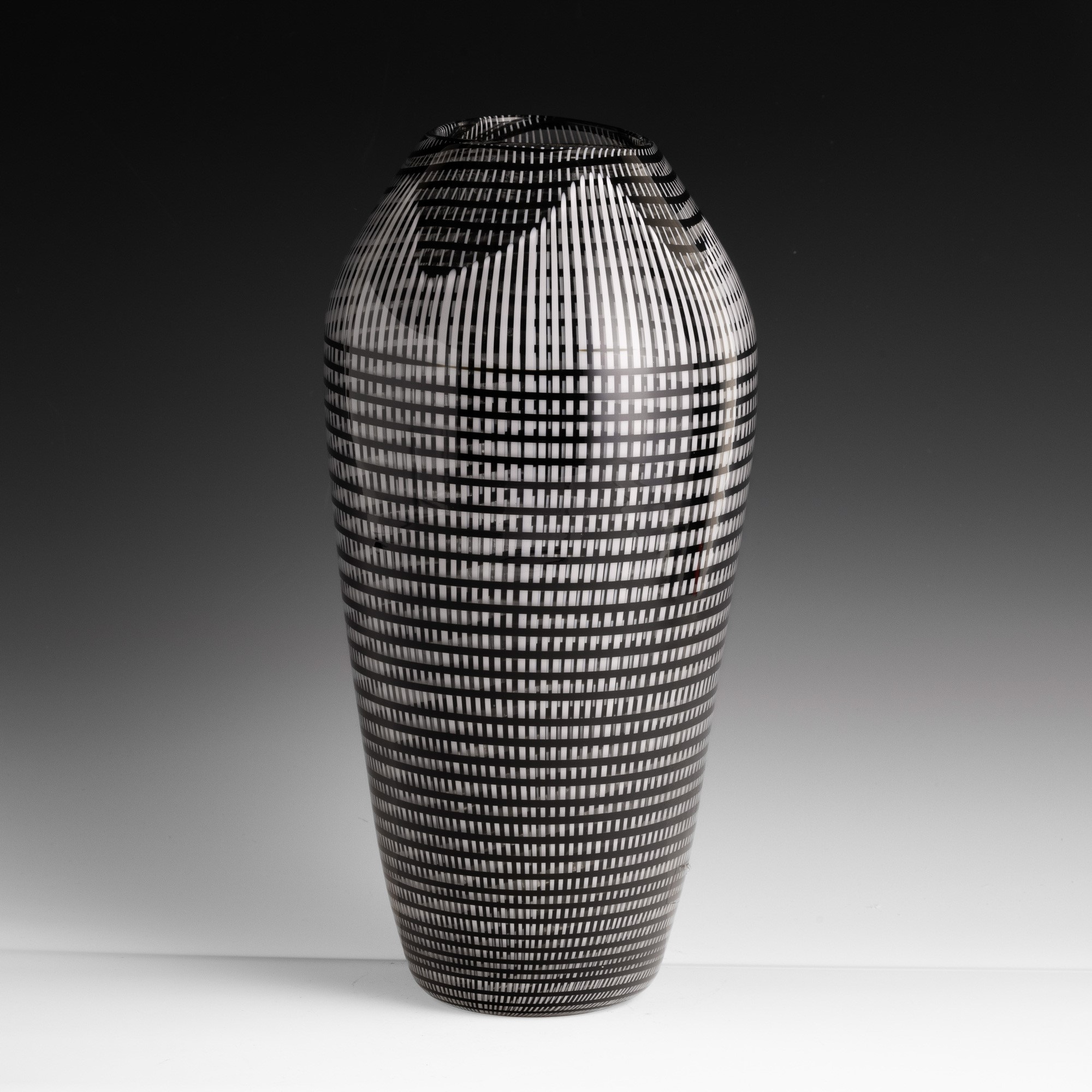Large oval section vase in blown glass decorated with woven black and 'lattimo' (milky) canes.