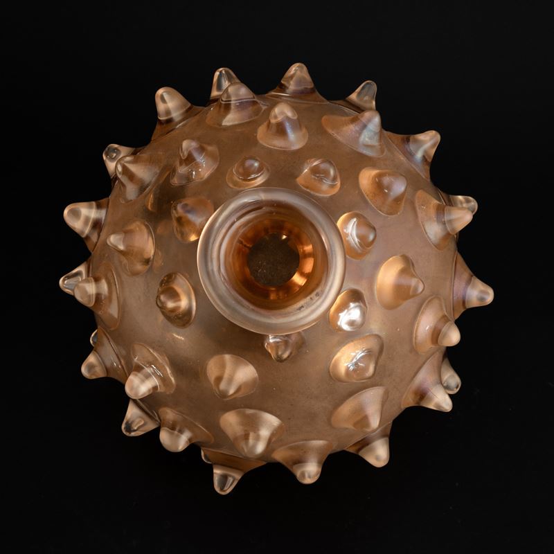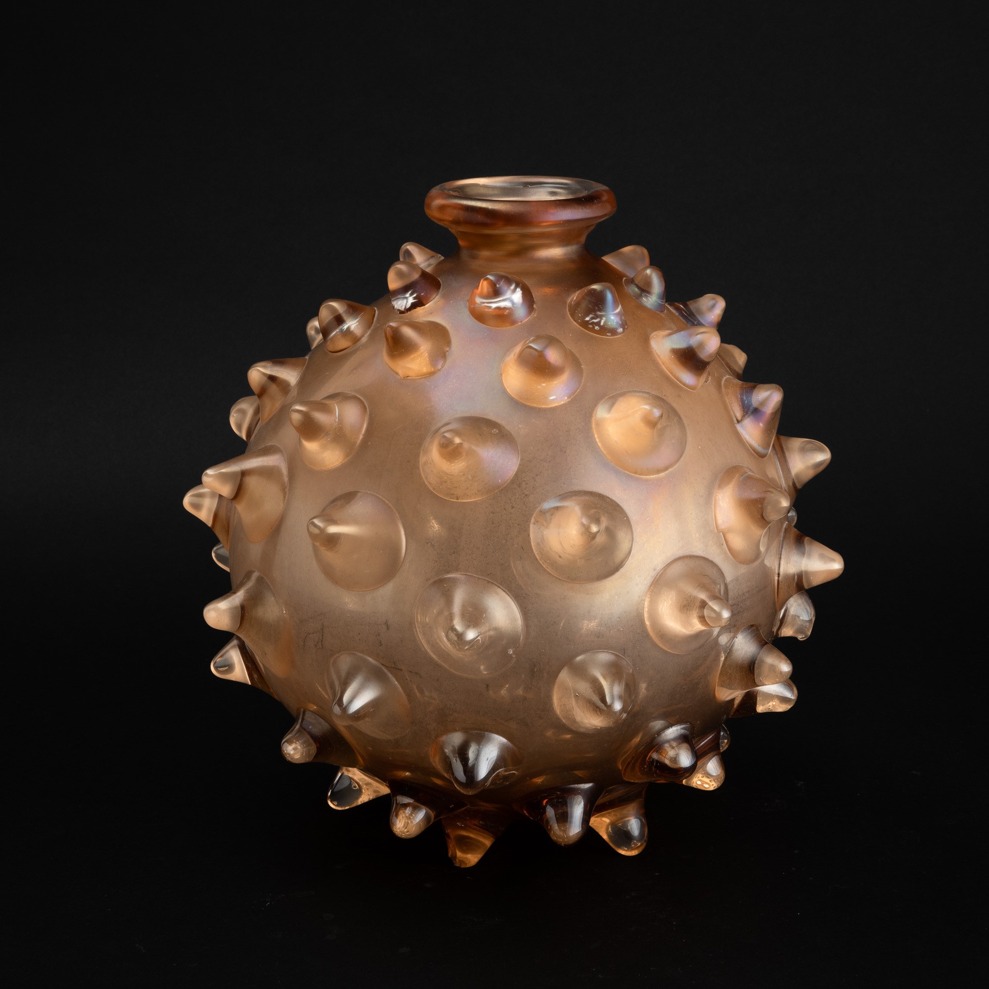 Mine vase in rose-colour blown glass decorated with even pointed applications. Surface iridescent throughout.