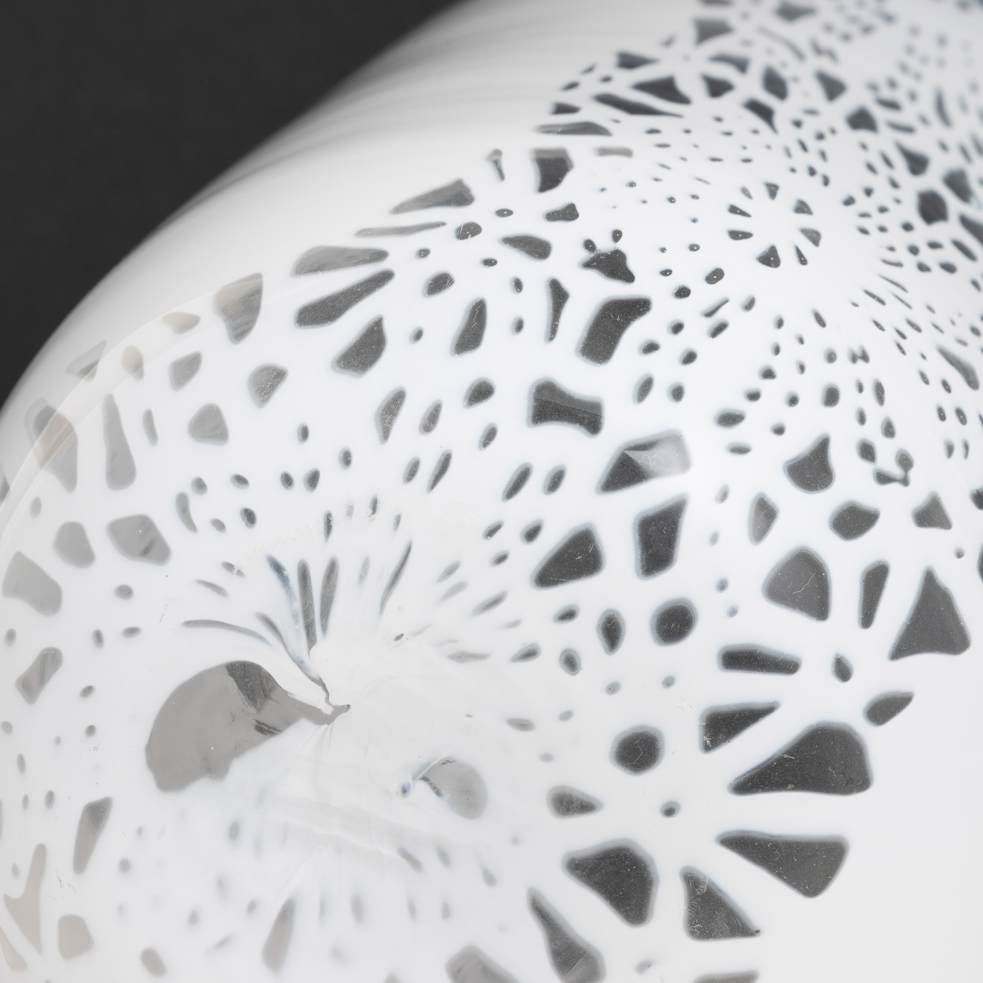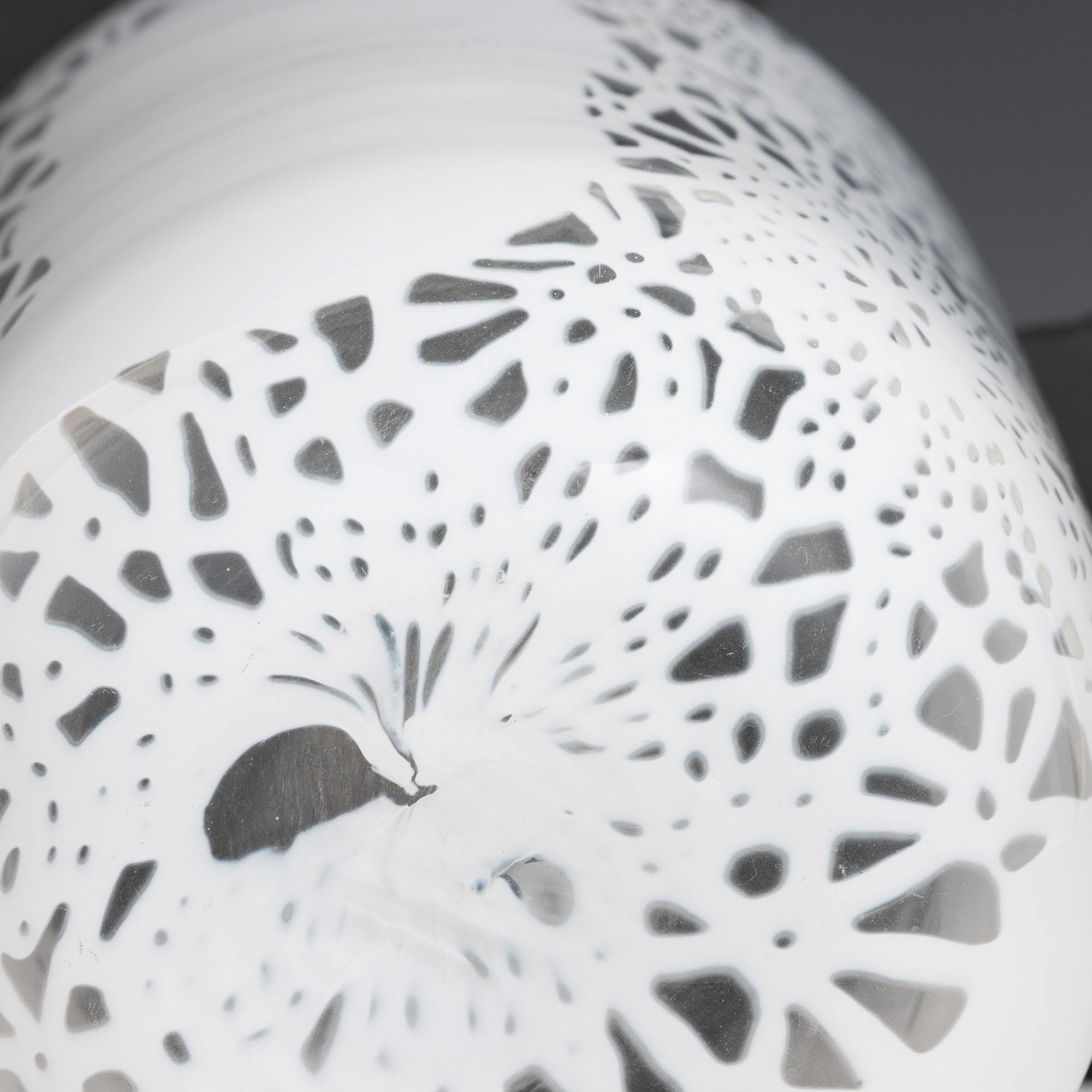 Merletti series cylindrical section vase in 'lattimo' (milky) blown glass decorated with large murrines.