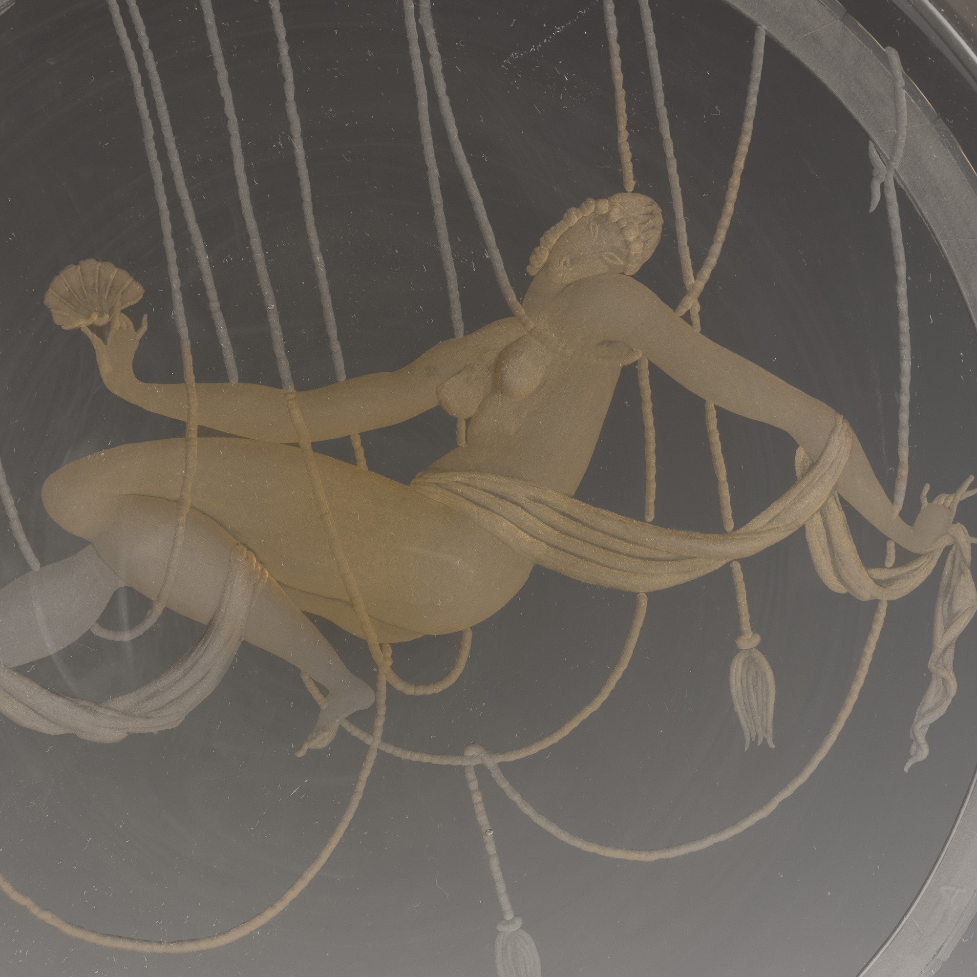 Large dish in 'incalmo' blown glass with engraving of a woman on ropes, from a design by Gio Ponti for Richard Ginori.