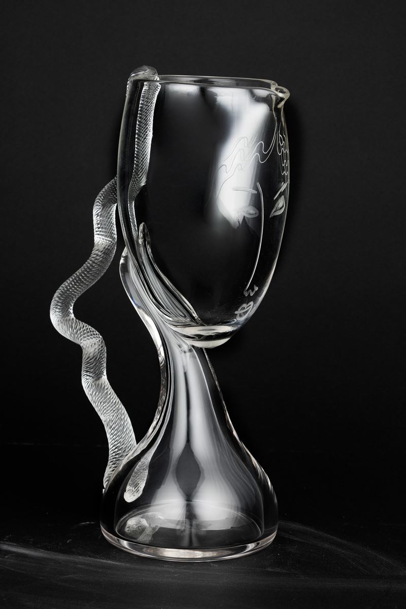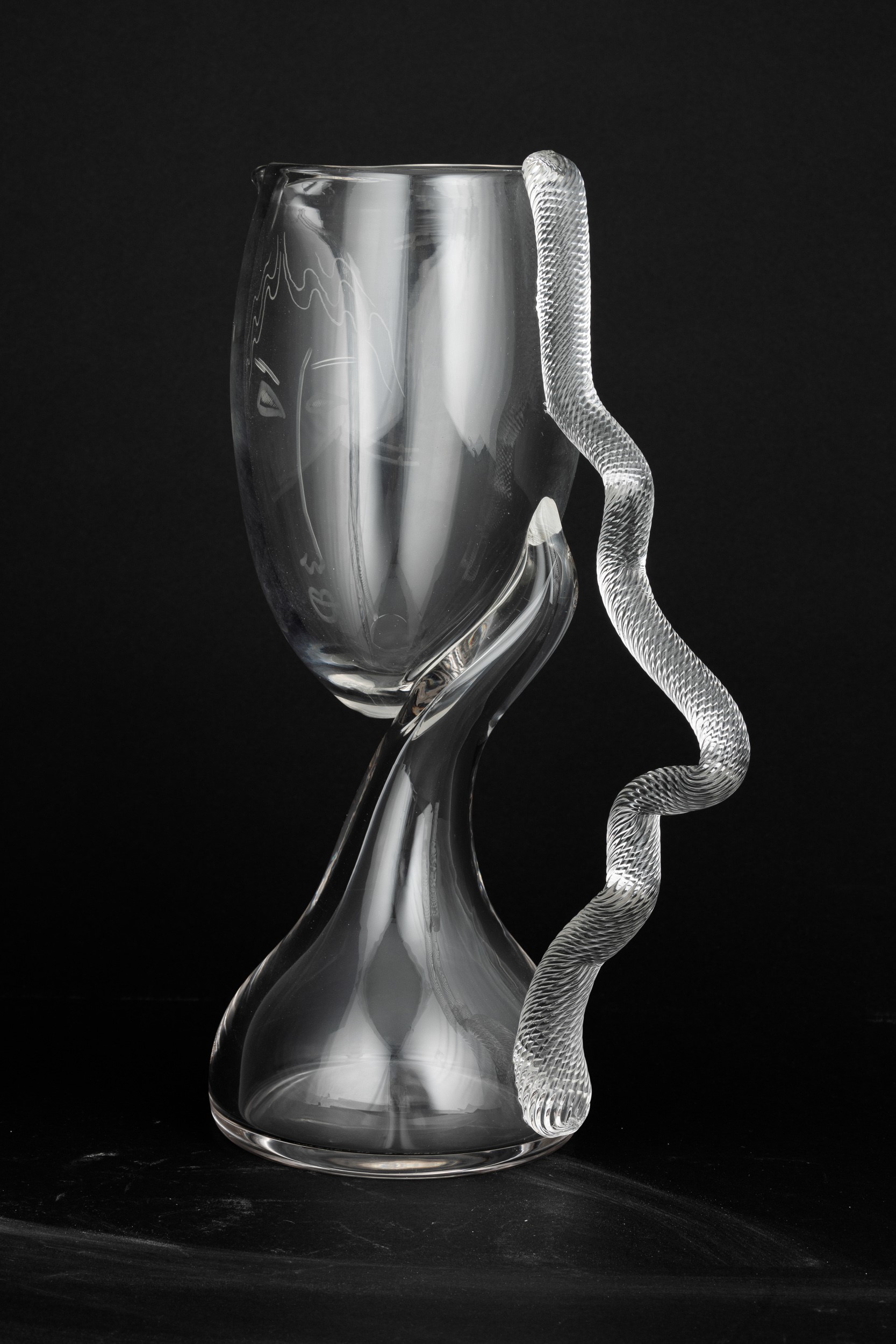 Modì series carafe vase in blown glass with engraved face.