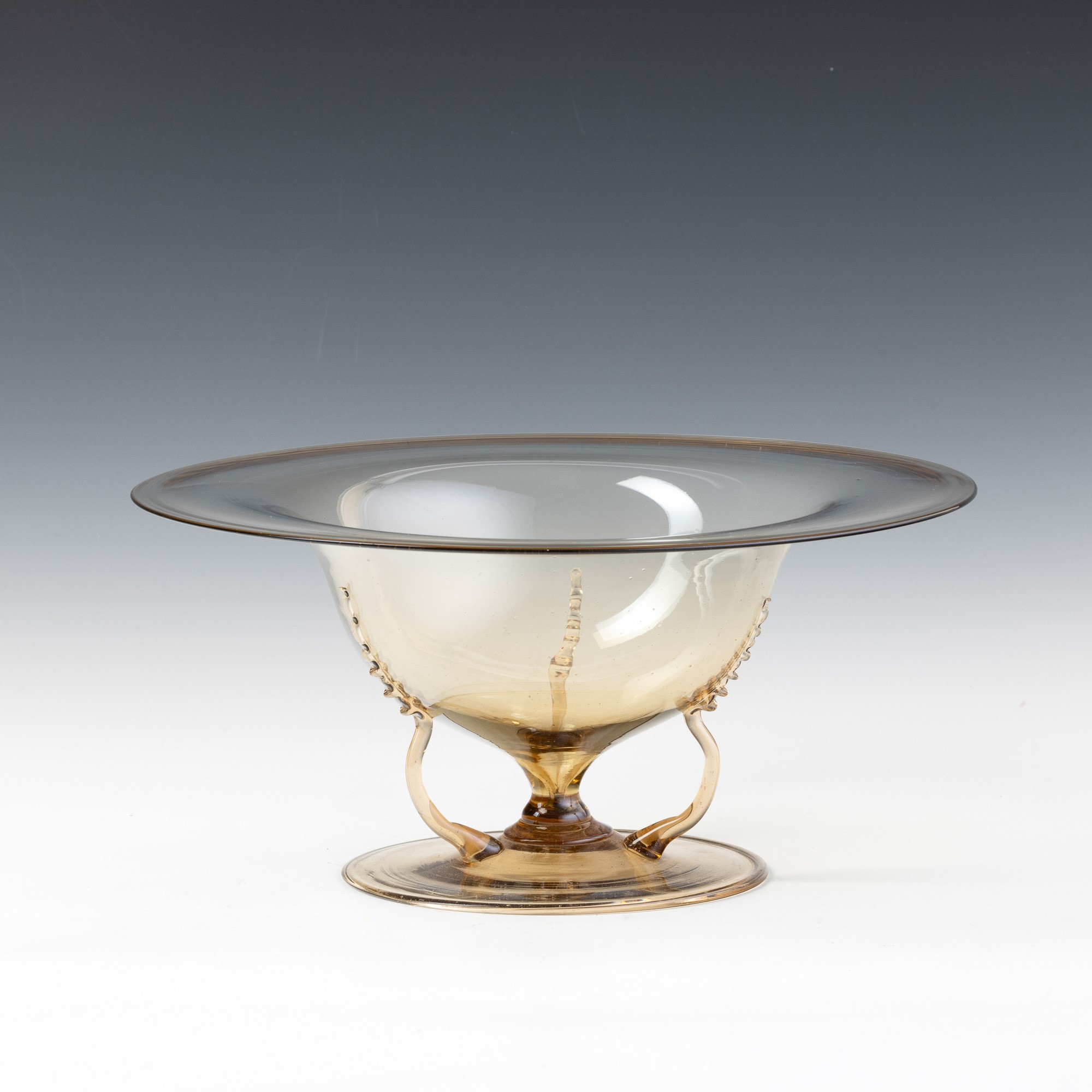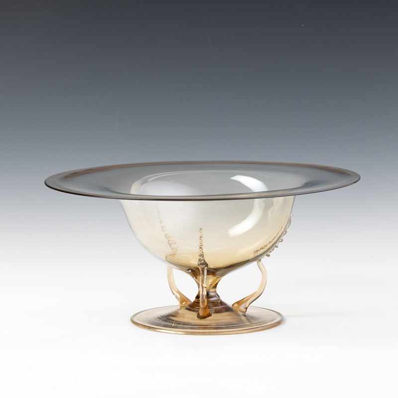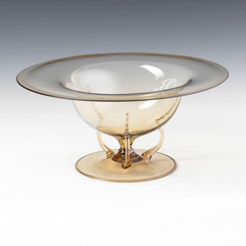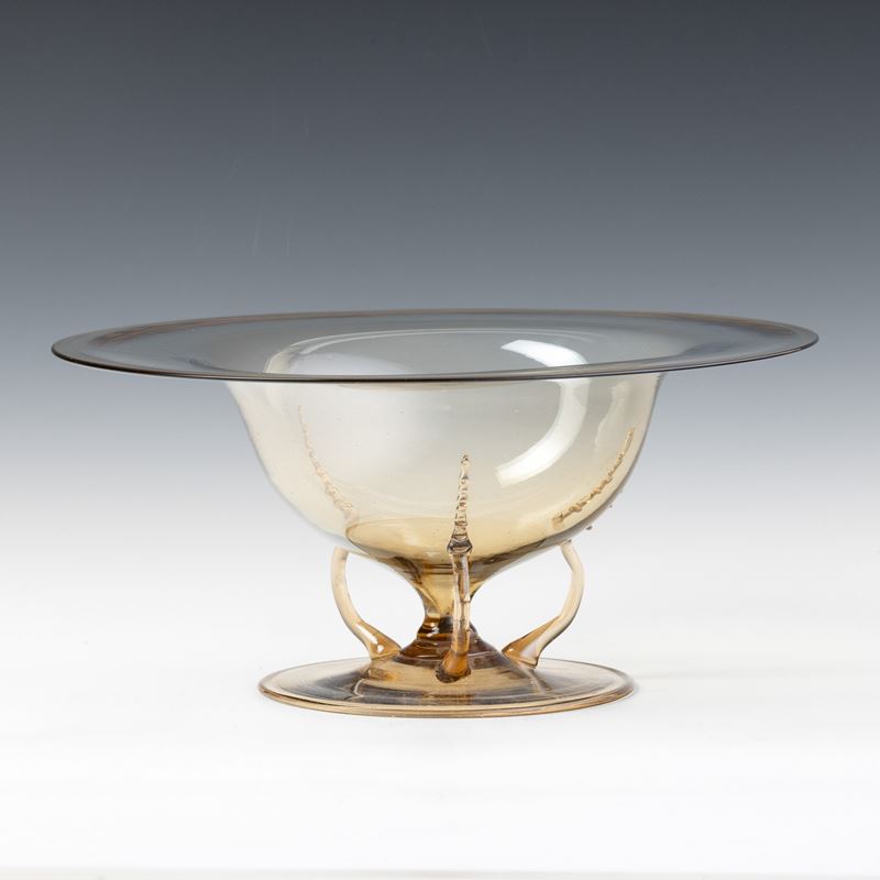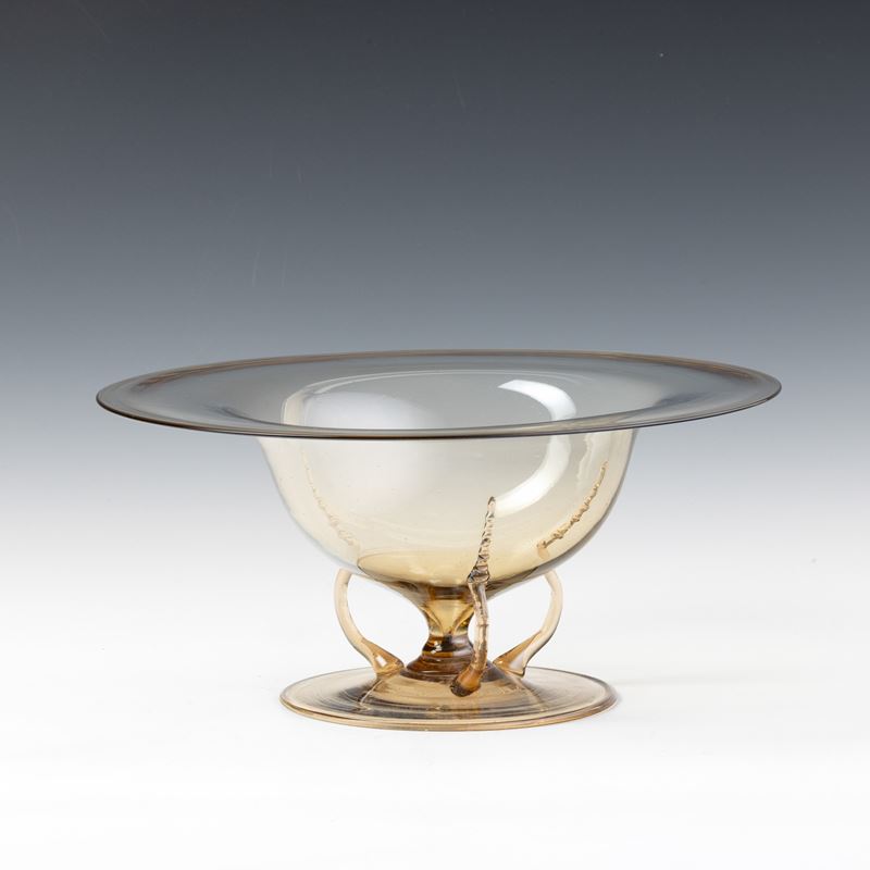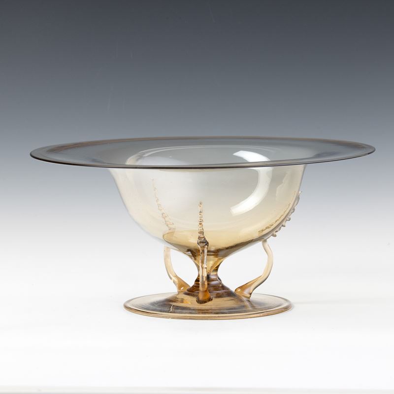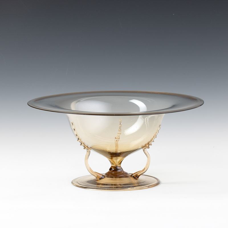 Bowl with flared neck in straw-colour blown glass on round foot and with snake-shaped applied handles.