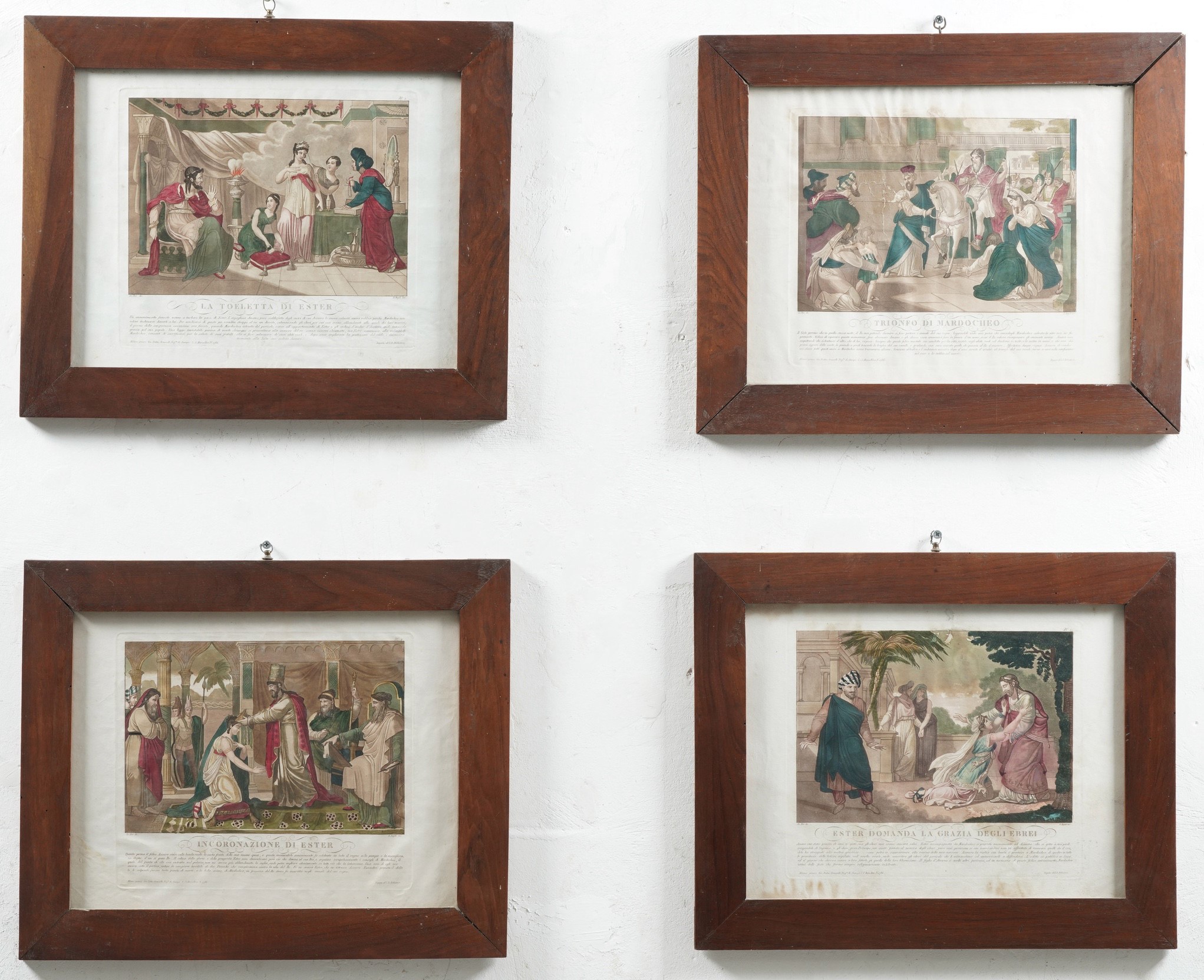 Quattro stampe colorate con episodi della storia di Ester. Entro cornici