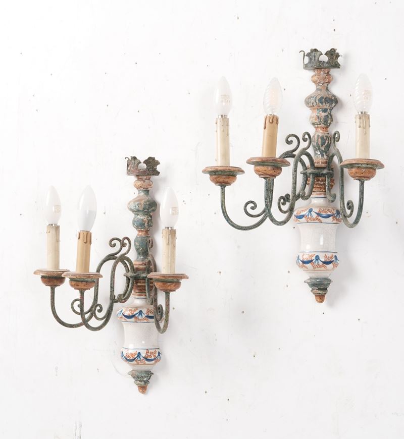 Coppia di appliques a tre luci con corpo in maiolica policroma