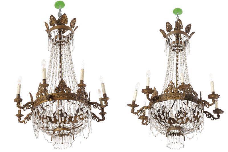Coppia di lampadari a mongolfiera in metallo dorato e vetro. XIX secolo