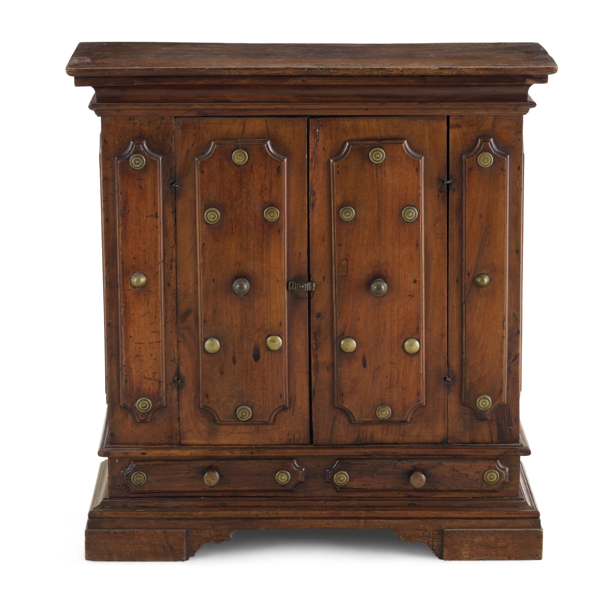 Fronte con due sportelli incorniciati ed intagliati a rilievo bugnato, cappello con cornice modanata e piedi a ciabatta. Sul fronte e sugli sportelli inserti circolari e semisferici in bronzo fuso e dorato