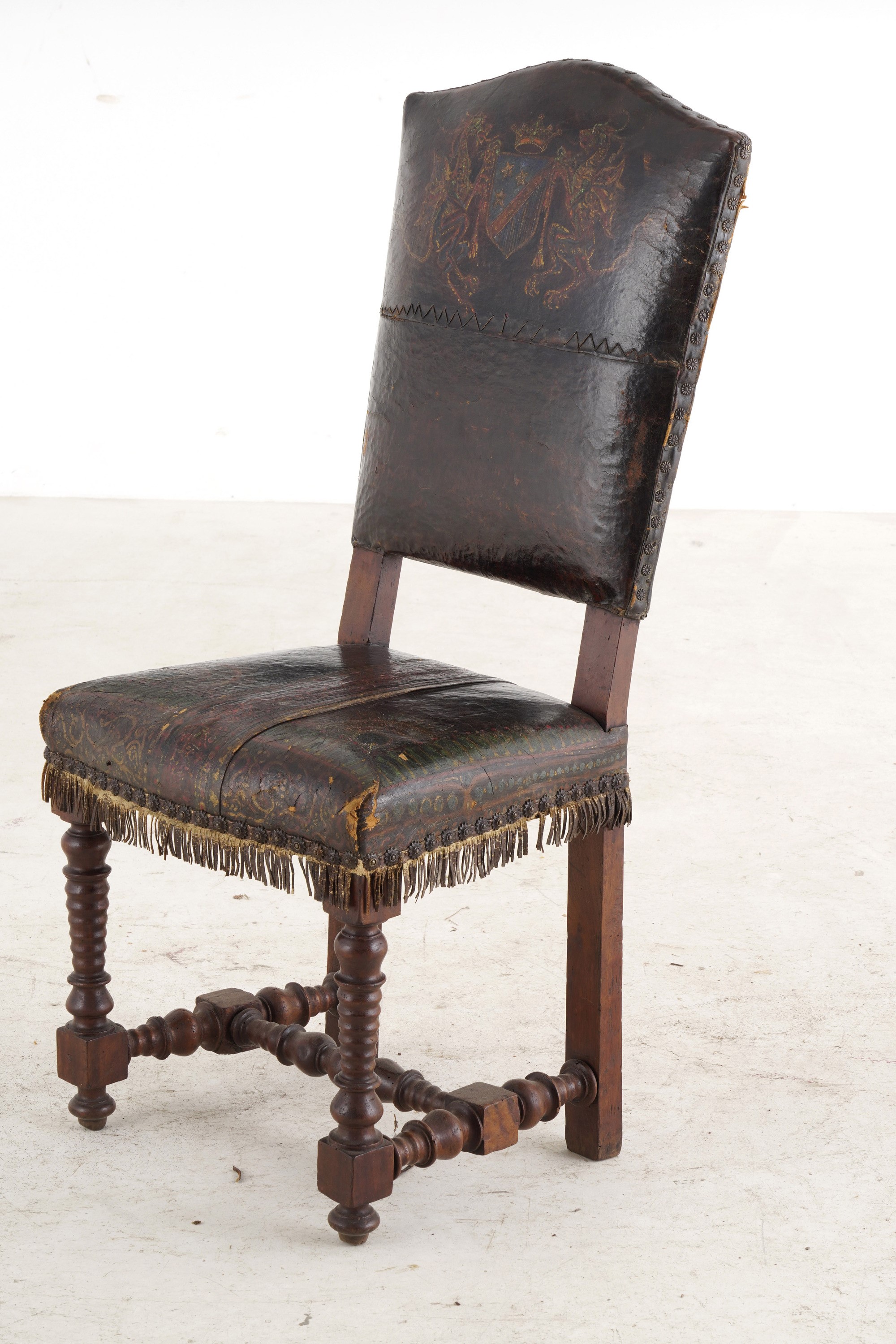 seduta e schienale in pelle decorata con stemma (difetti)