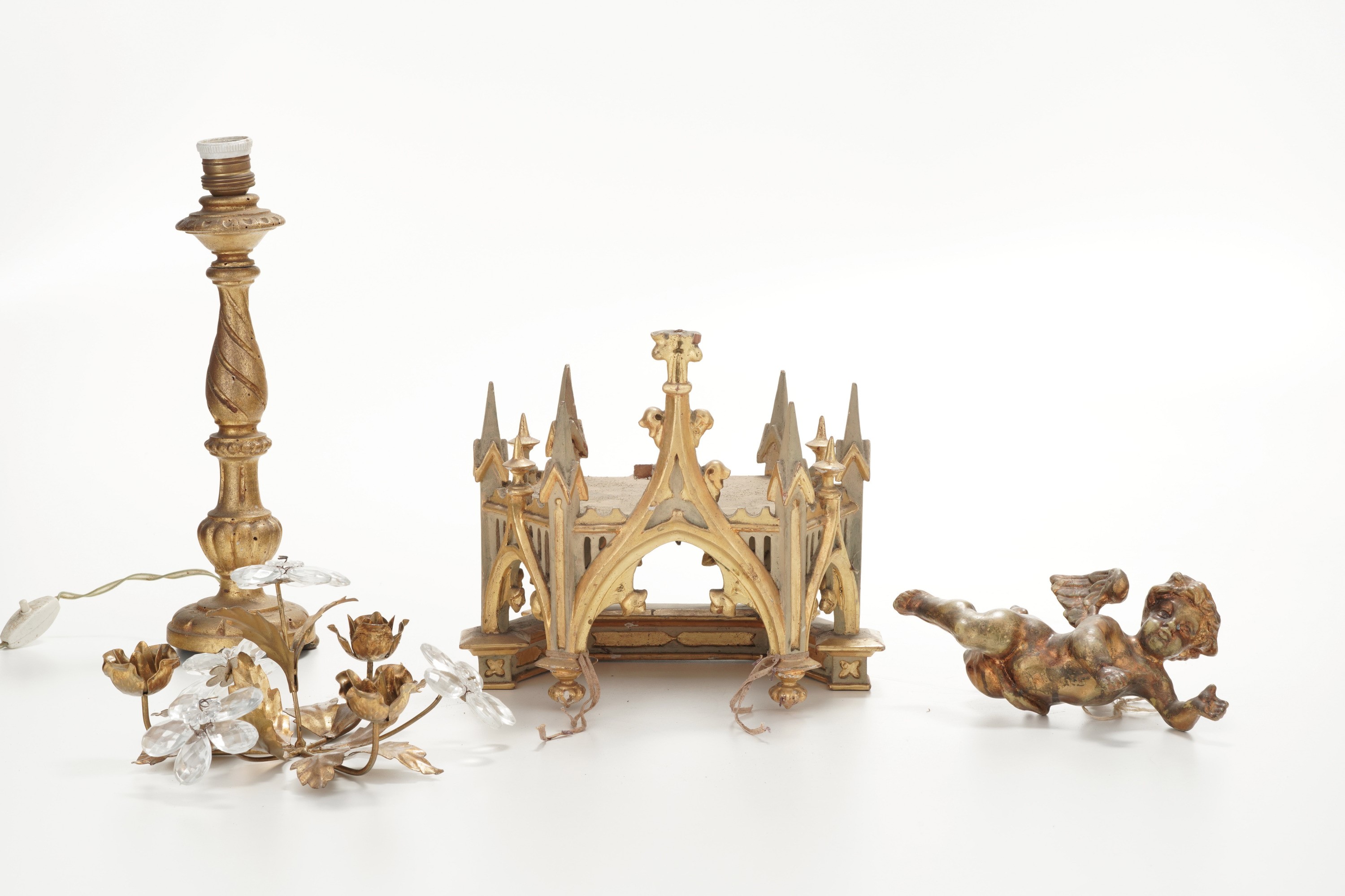 Gruppo di oggetti in legno intagliato e dorato tra cui candeliere montato a lampada, angioletto ed elemento architettonico