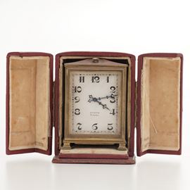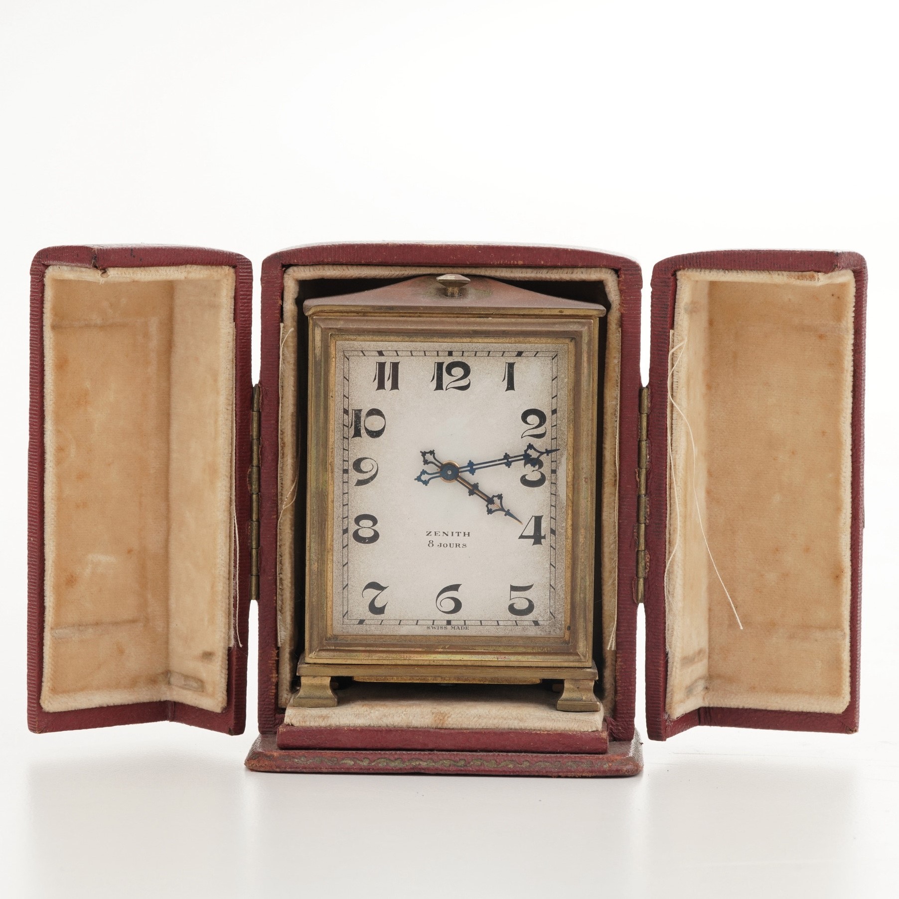 In metallo dorato, quadrante bianco con numeri arabi e firma "Zenith 8 hours"; entro custodia.