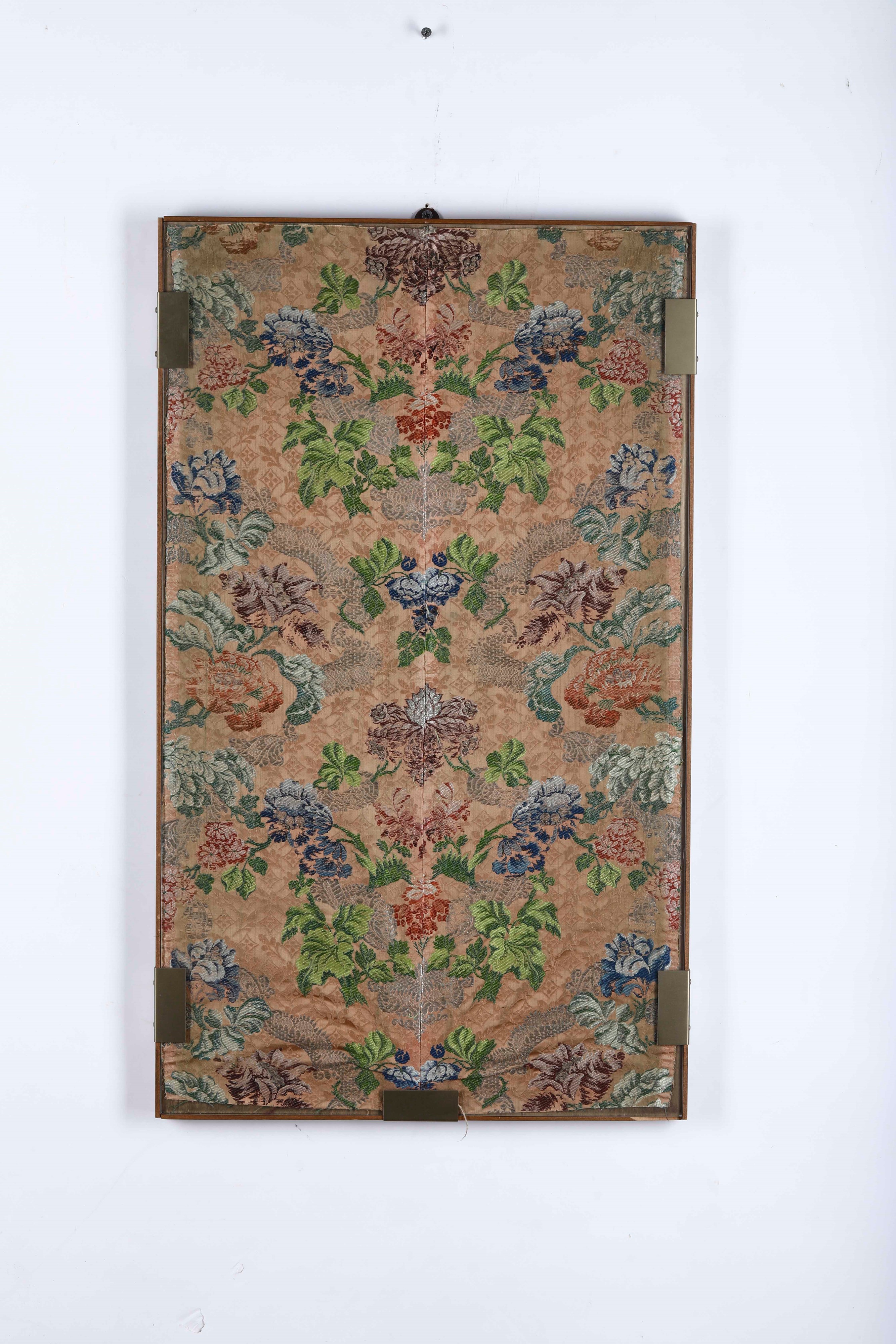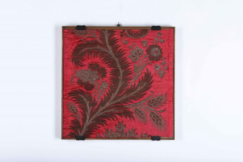 uno broccato di damasco Francia metà XVIII secolo cm 85x50, uno cm 57x42, uno in velluto rosso con fili metallici cm 38x38, uno cm 52x44, uno cm 53x34, uno cm 39x26