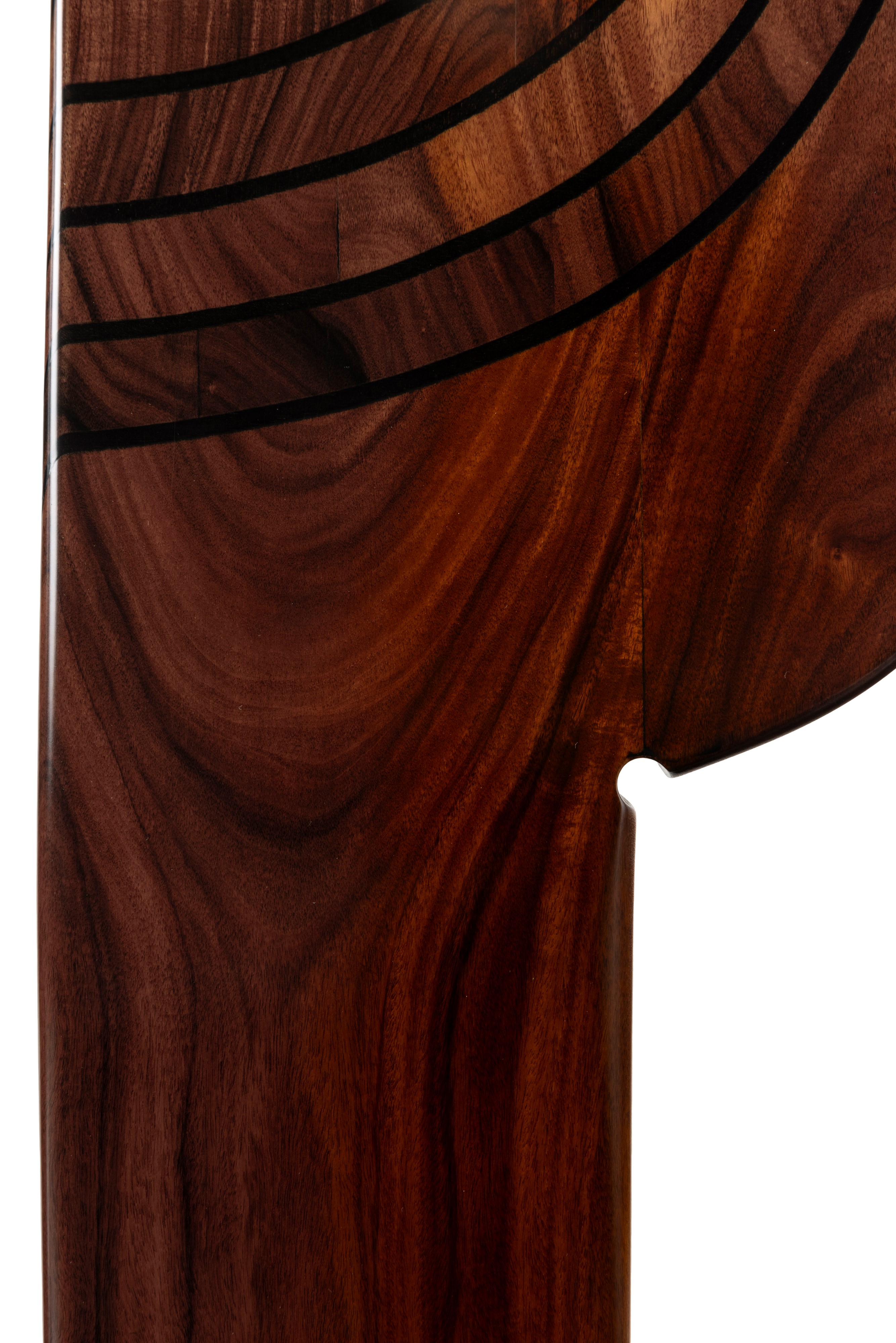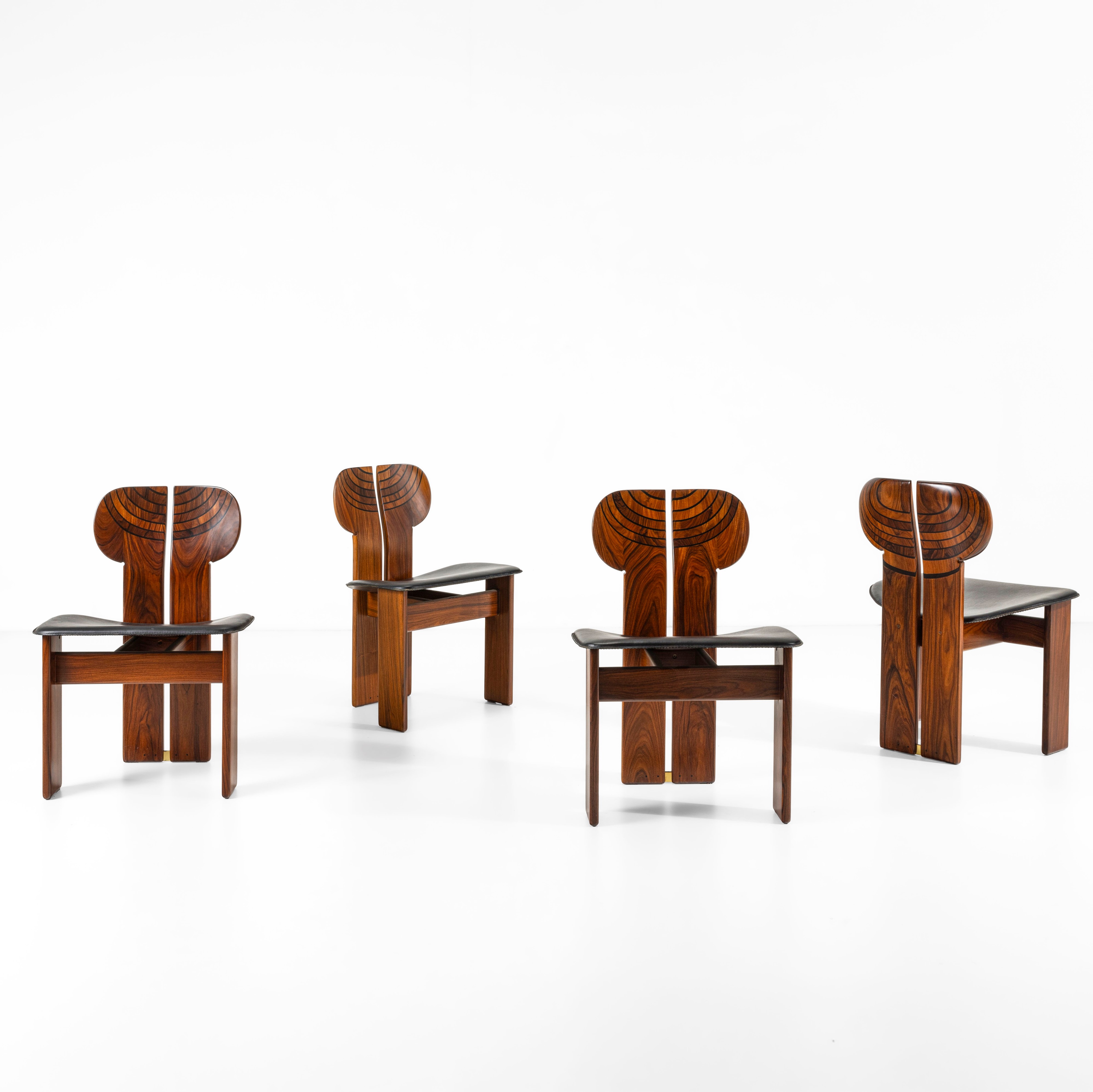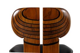 Struttura in legno in diverse essenze e seduta in compensato curvato rivestito in finta pelle.