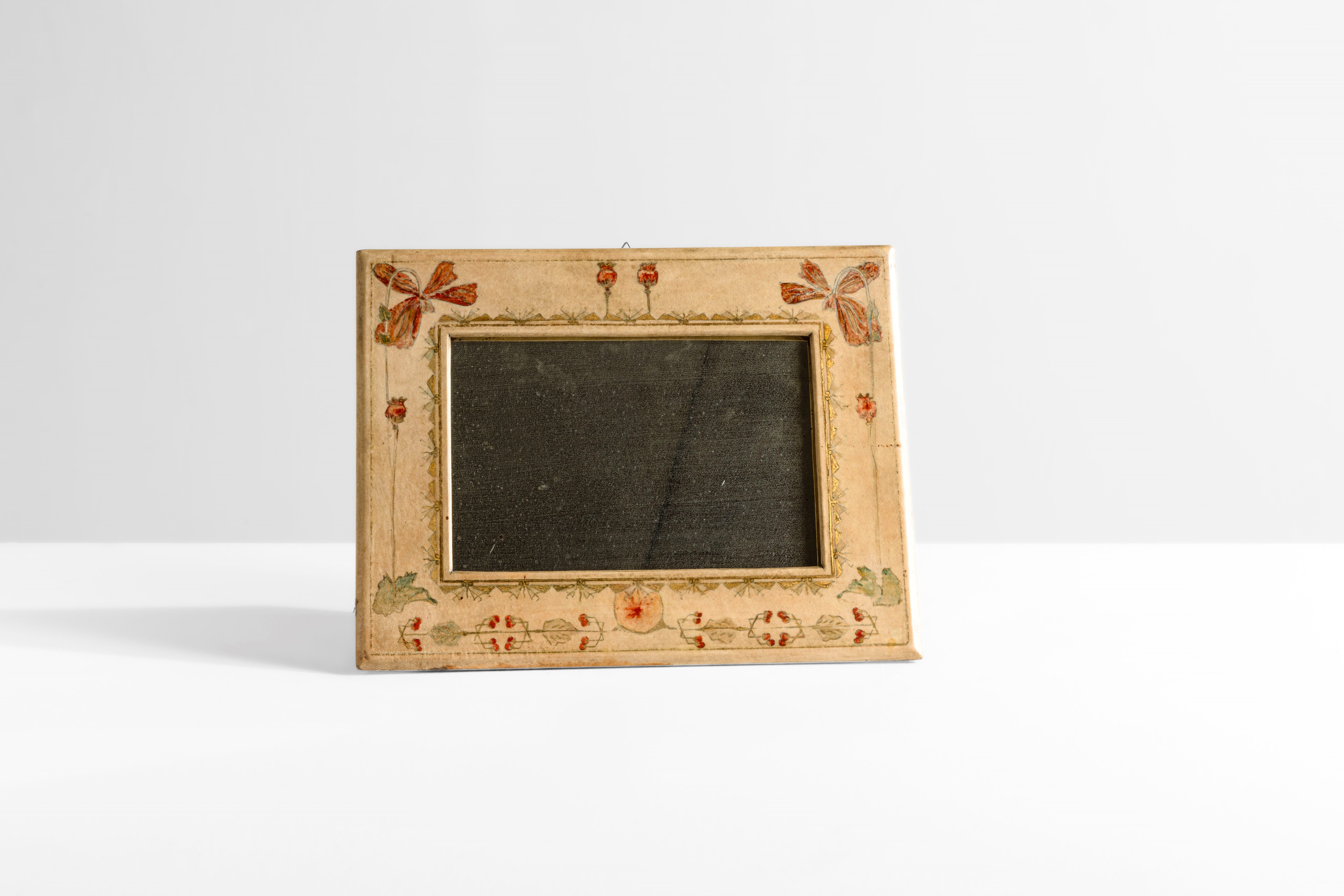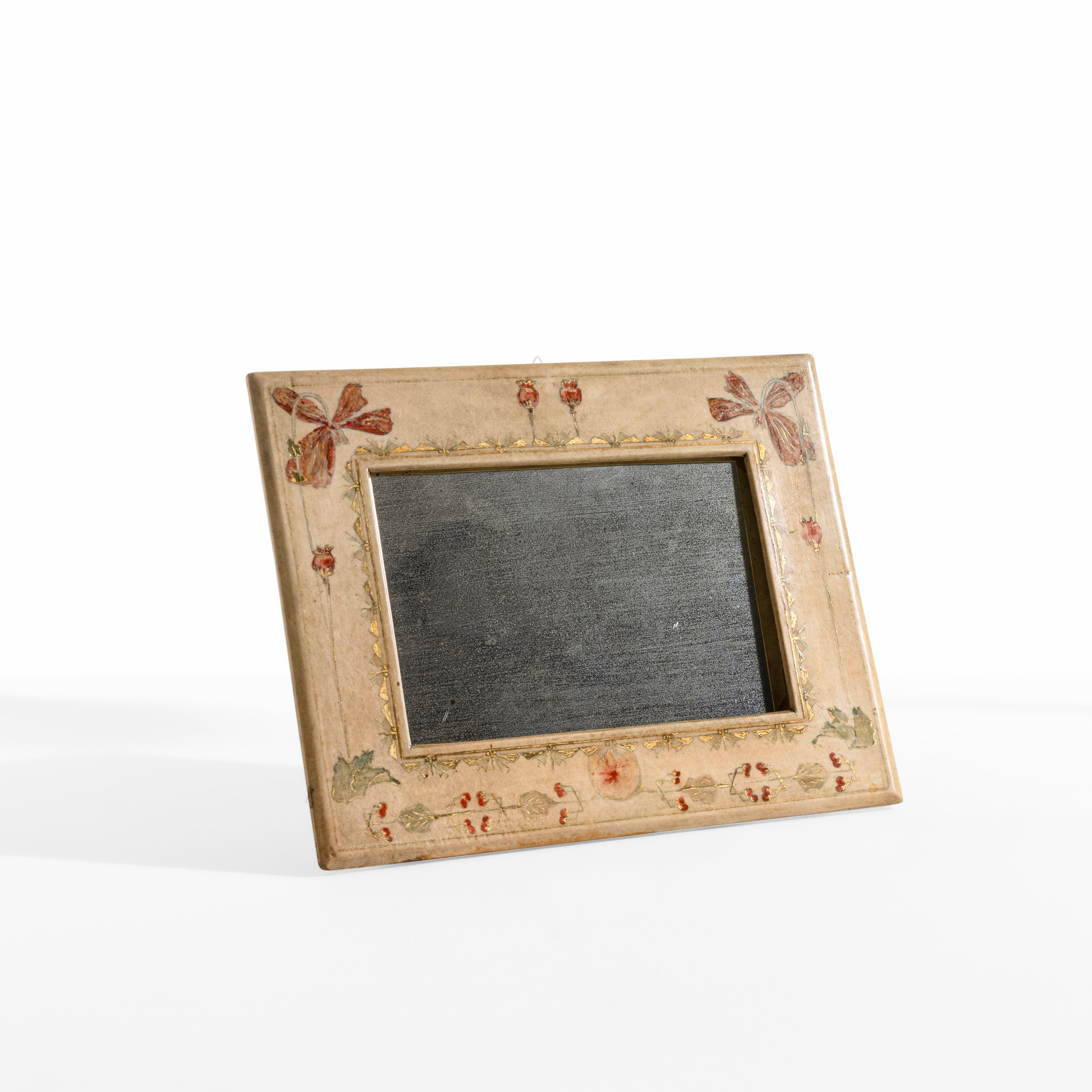 Cornice in legno rivestita in pergamena decorata e dorata.