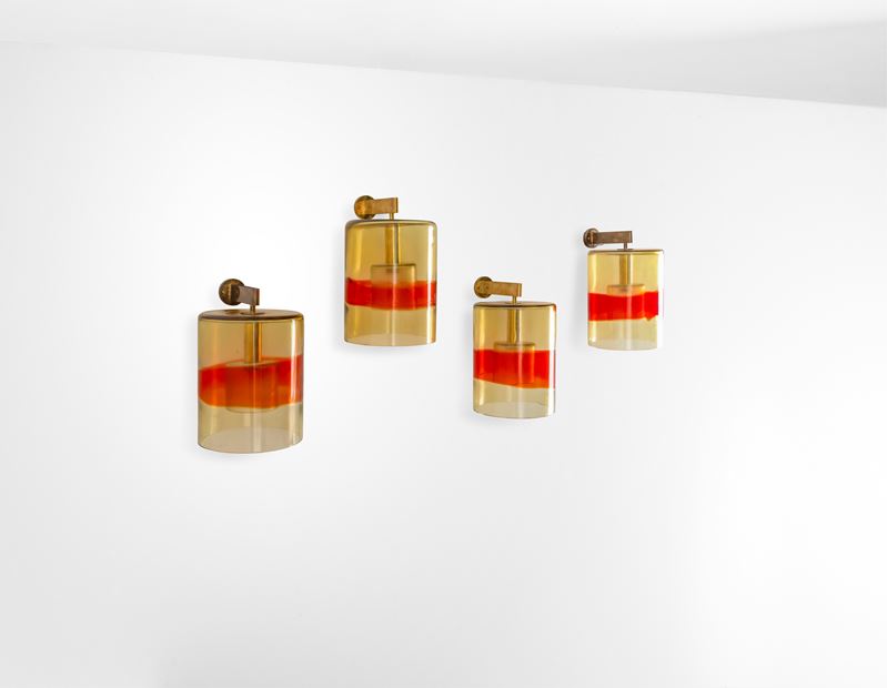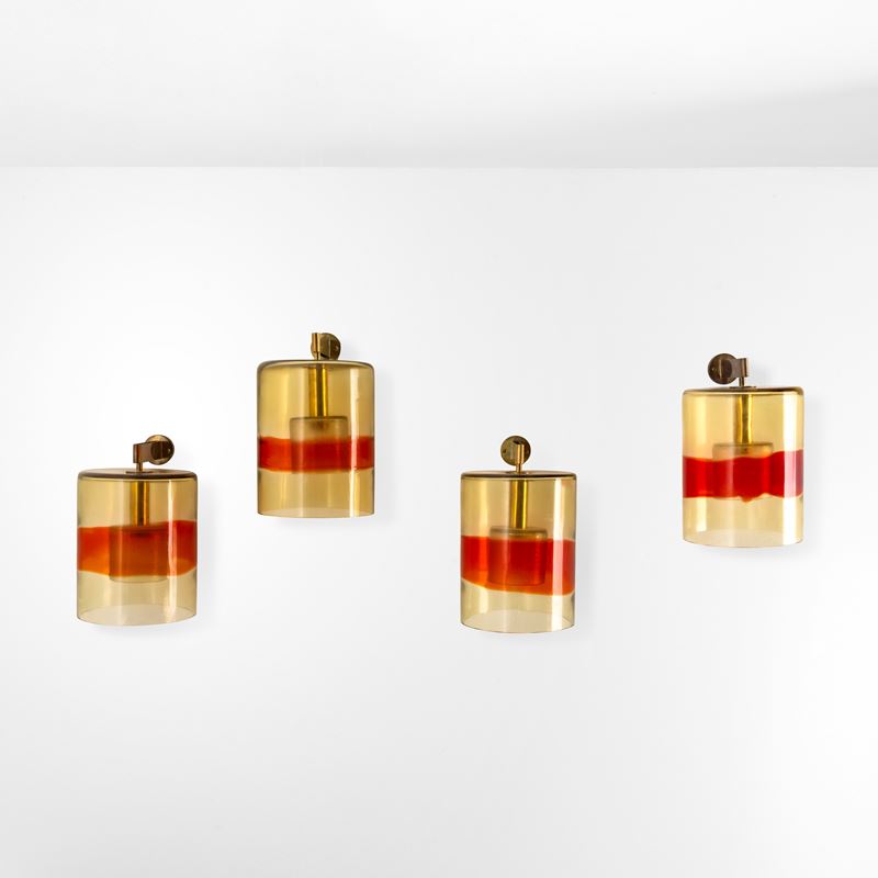 Struttura in ottone con diffusore esterno in vetro di Murano a fasce e diffusore interno in vetro di Murano acidato.