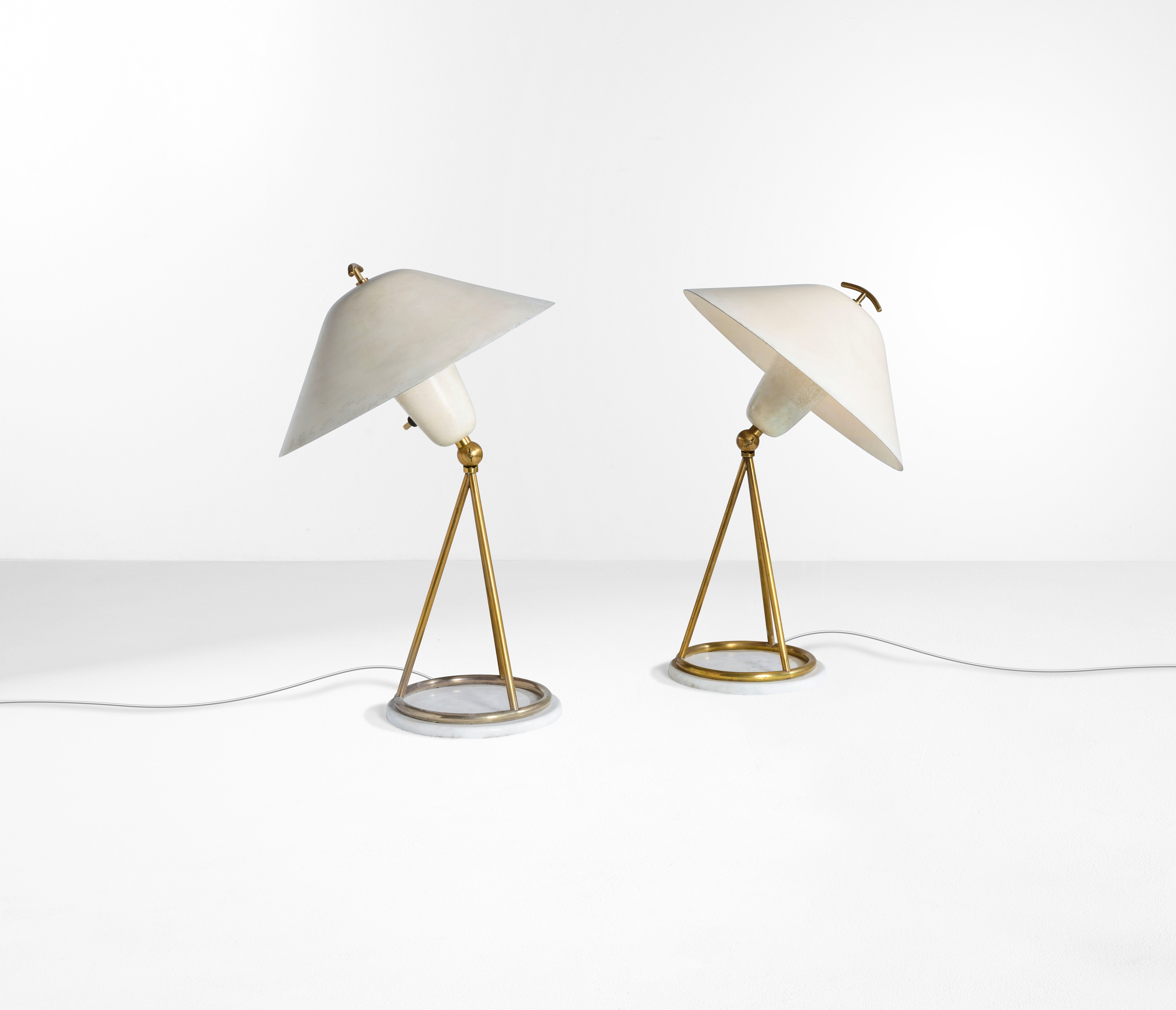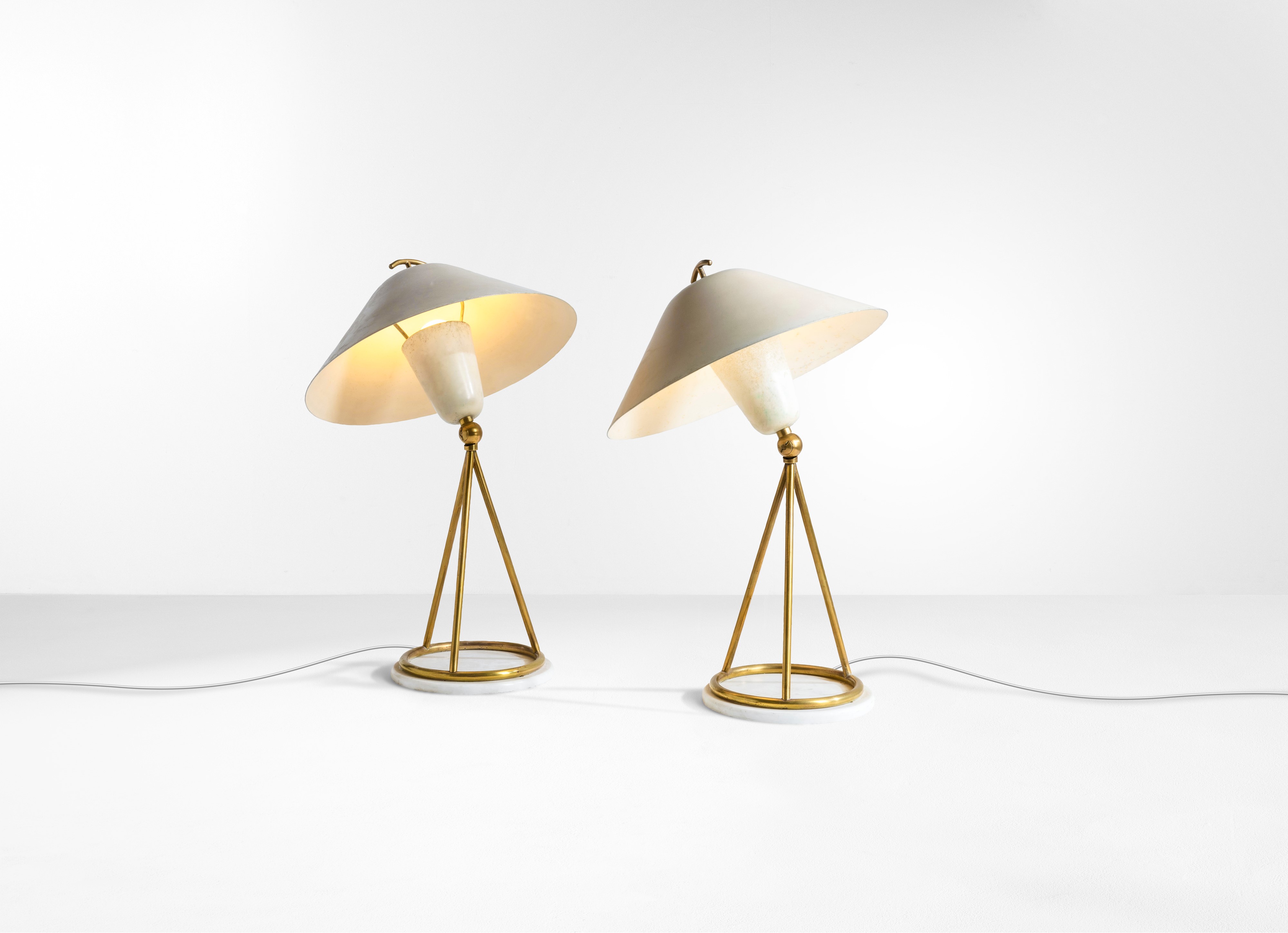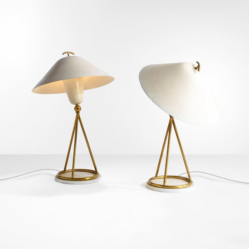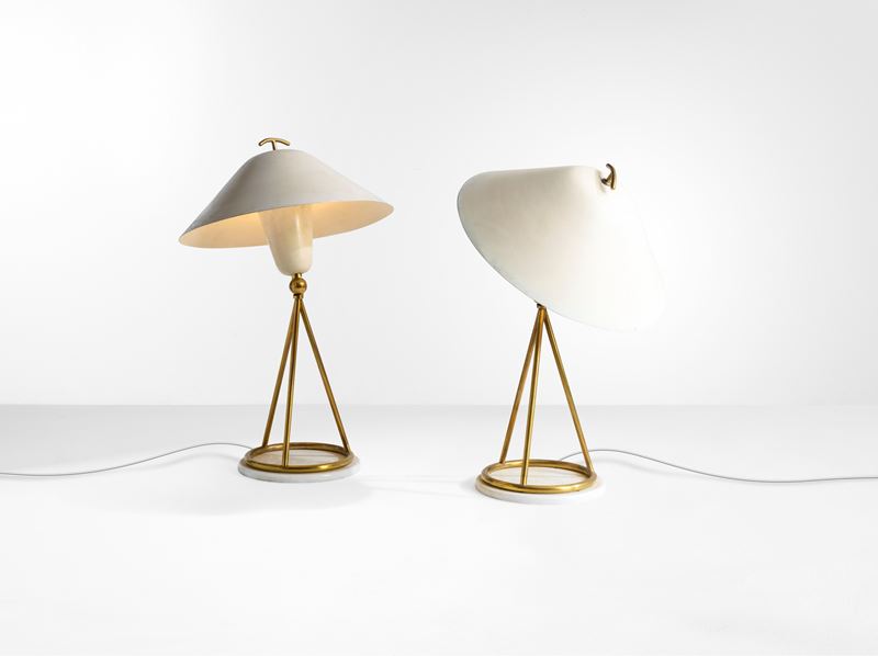 Struttura in ottone e base in marmo, diffusori orientabili in metallo laccato.