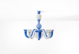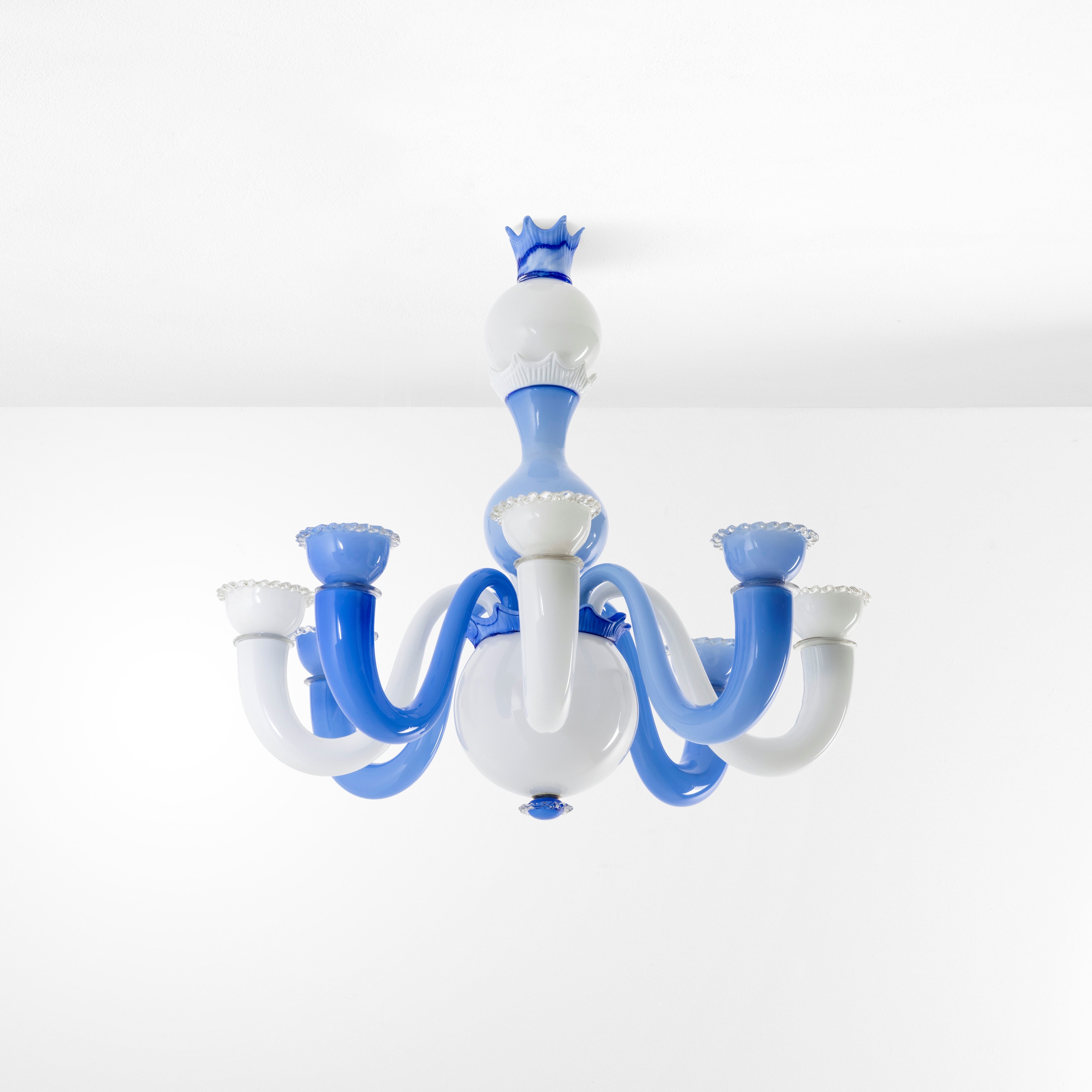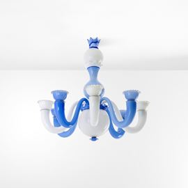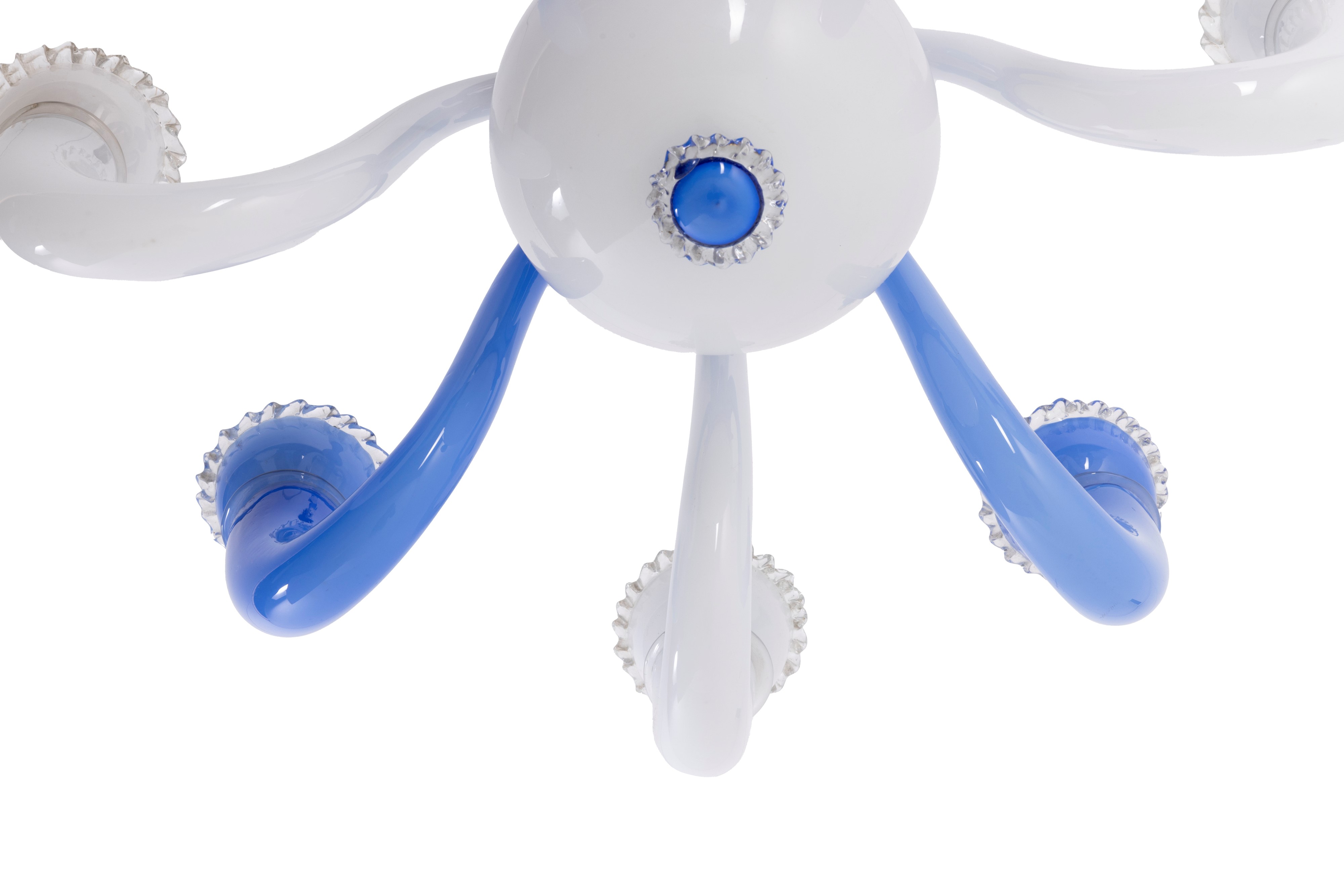 Struttura in metallo e vetro opalino di Murano soffiato e colorato.