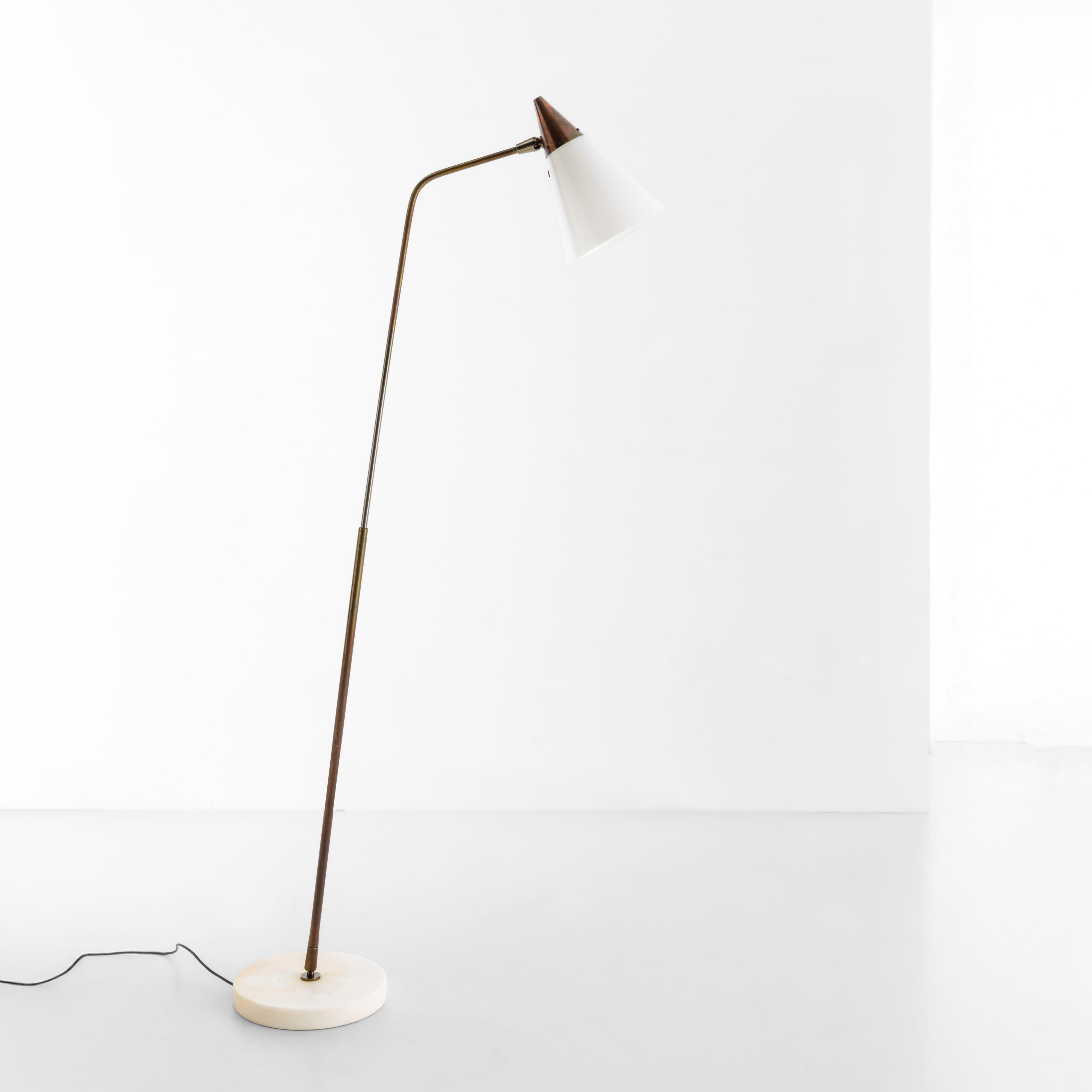 Struttura estensibile in ottone con base in marmo e riflettore in perspex opalino.