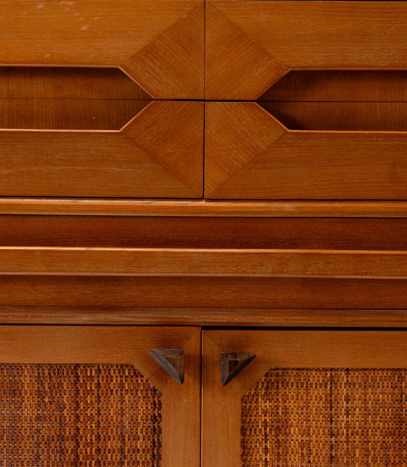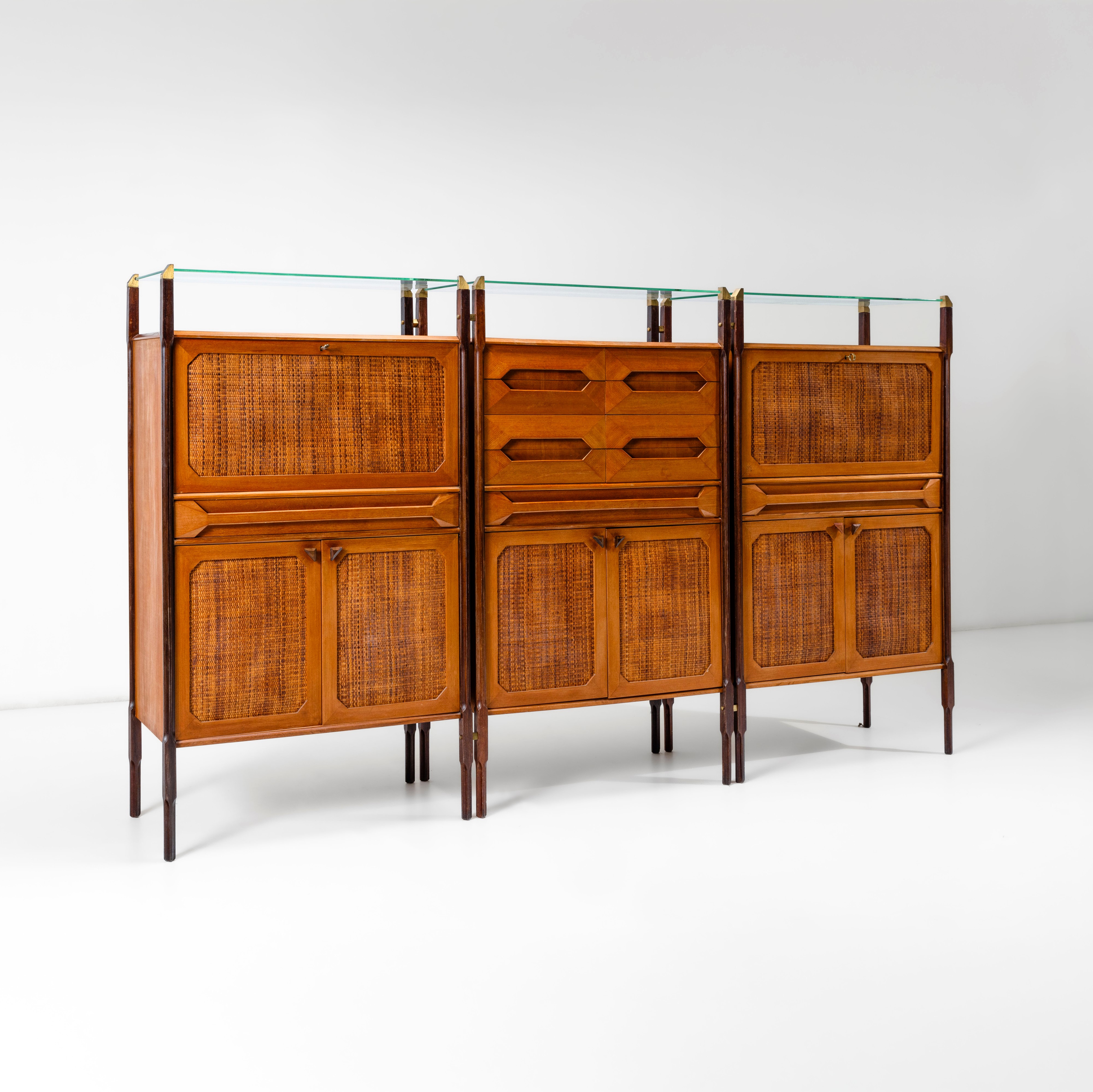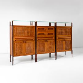 Struttura e sostegni in legno e ante rivestite di vimini. Dettagli in ottone e piano in cristallo.