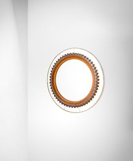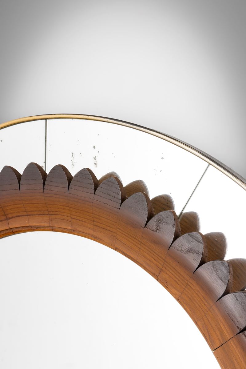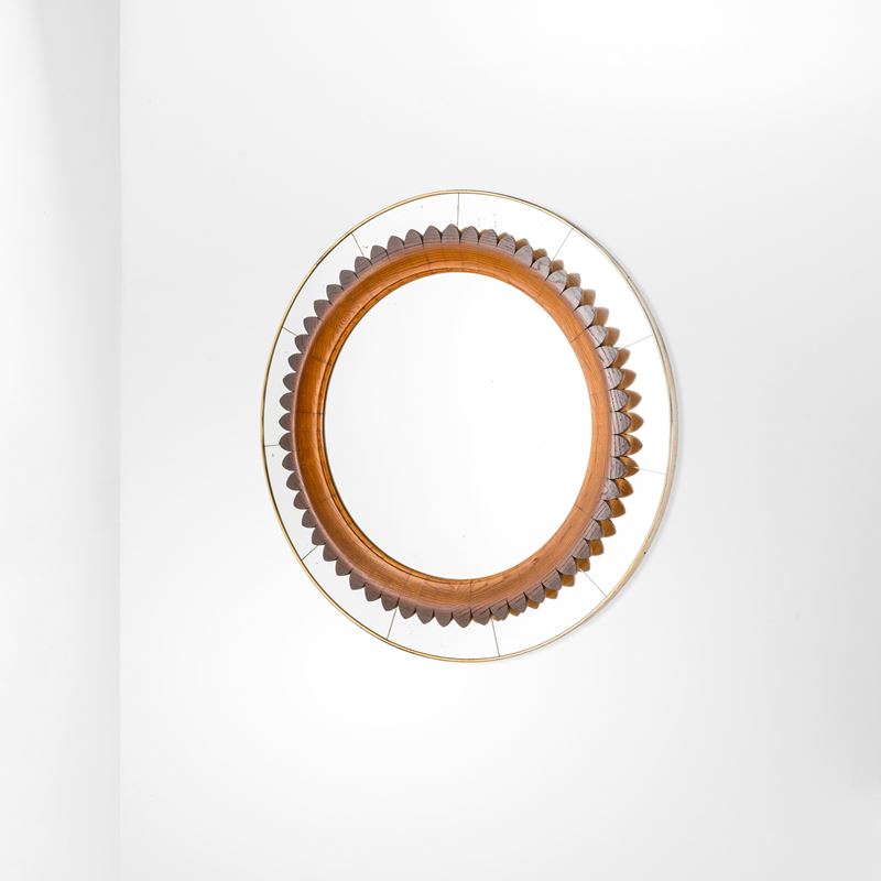 Struttura in legno. Fascia perimetrale in cristallo specchiato ed elemento centrale in cristallo specchiato. Cornice esterna in ottone.