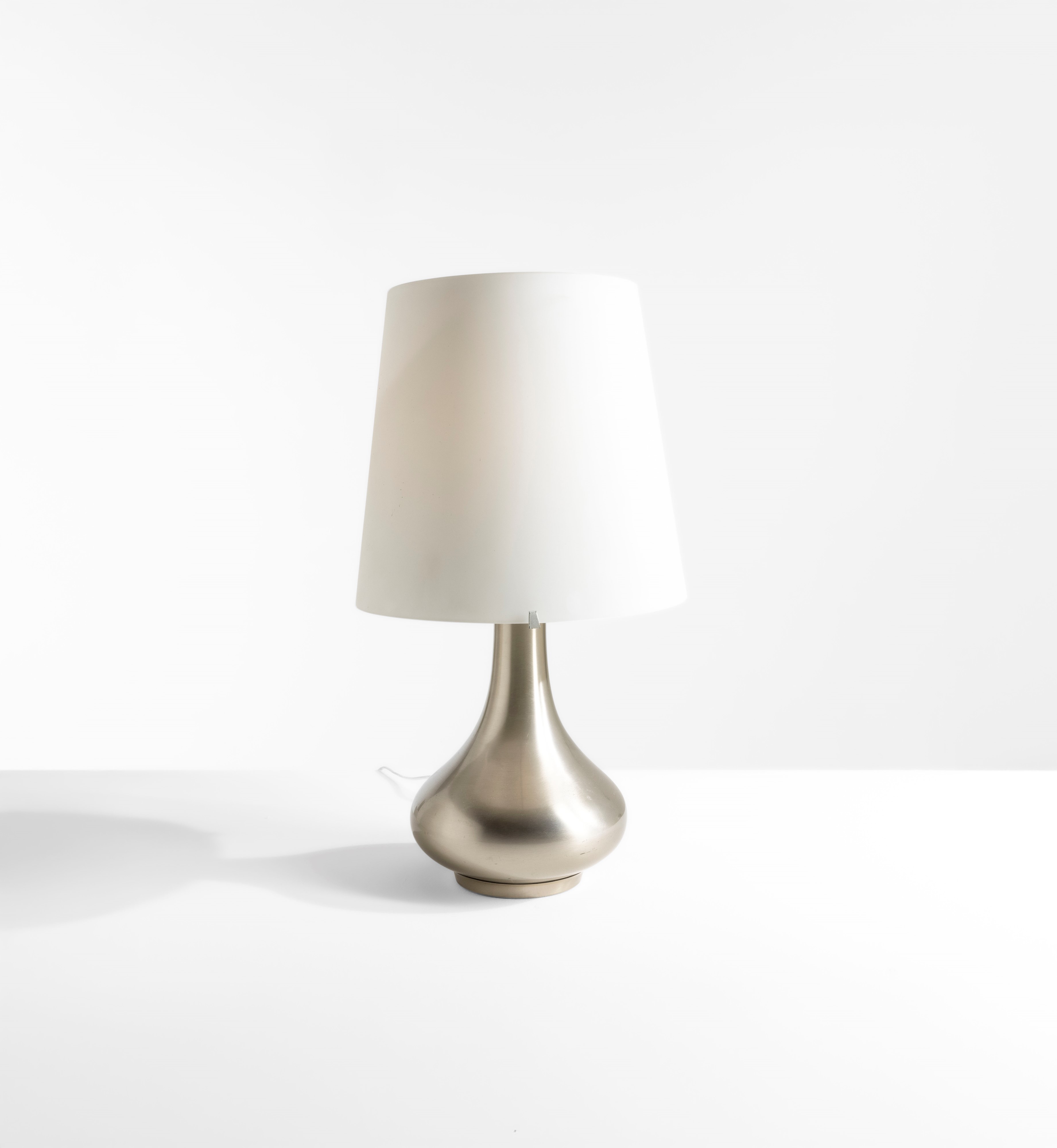 Struttura in metallo nichelato spazzolato e paralume in vetro opalino bianco.