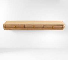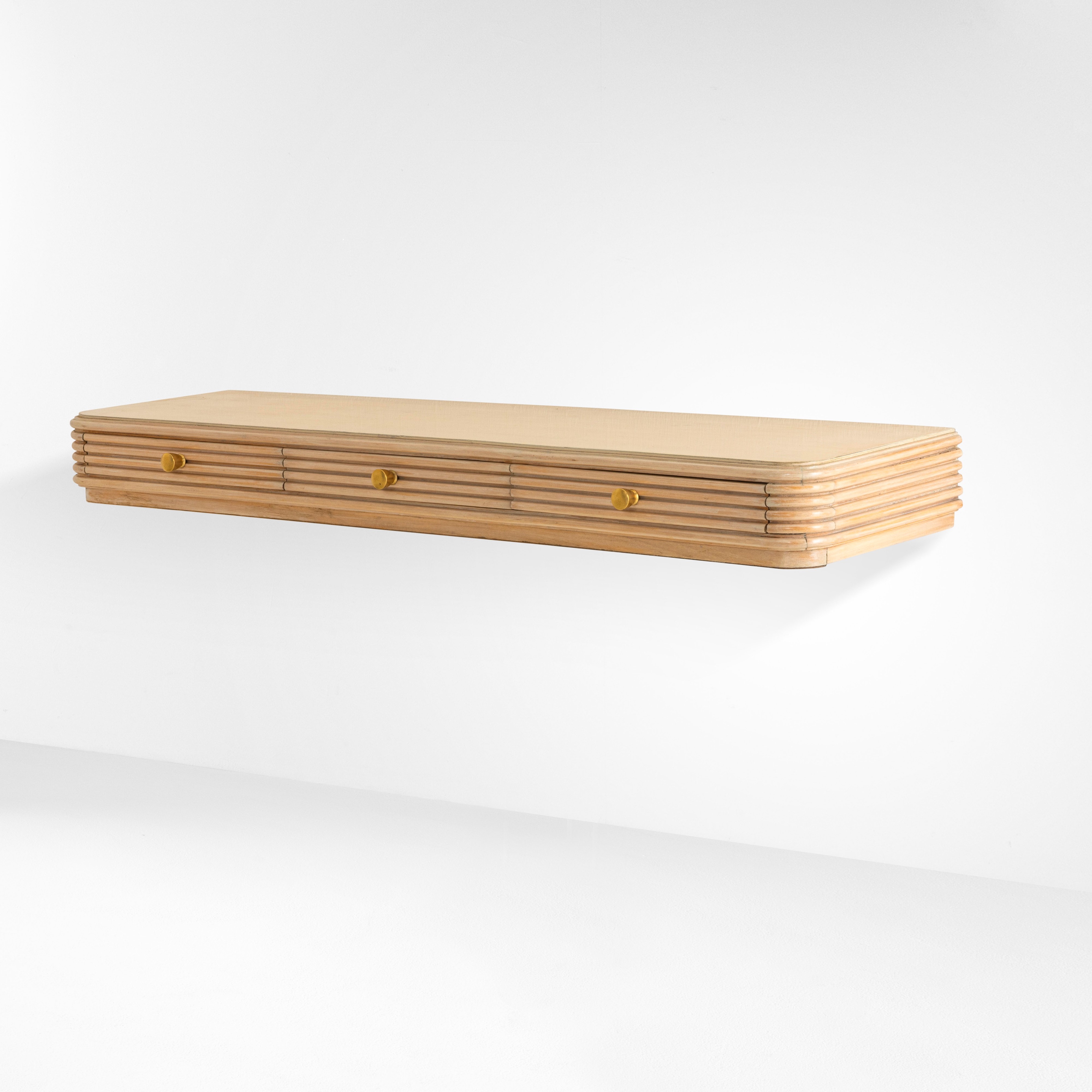 Struttura, piano e cassetti in legno e maniglie in ottone.