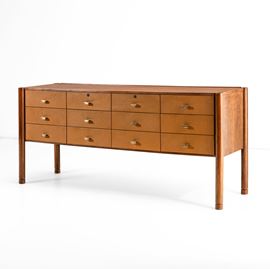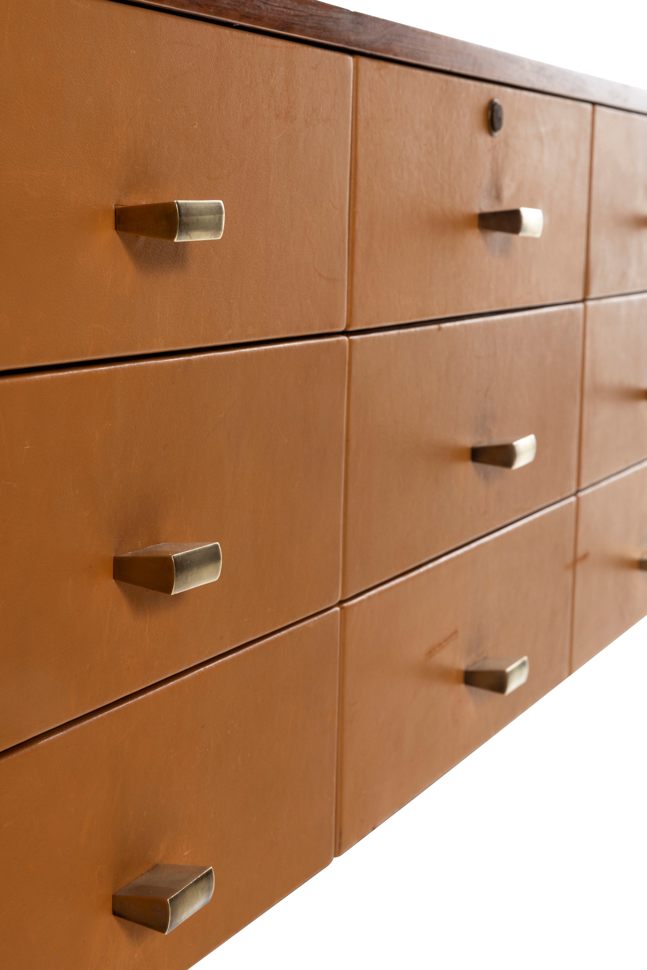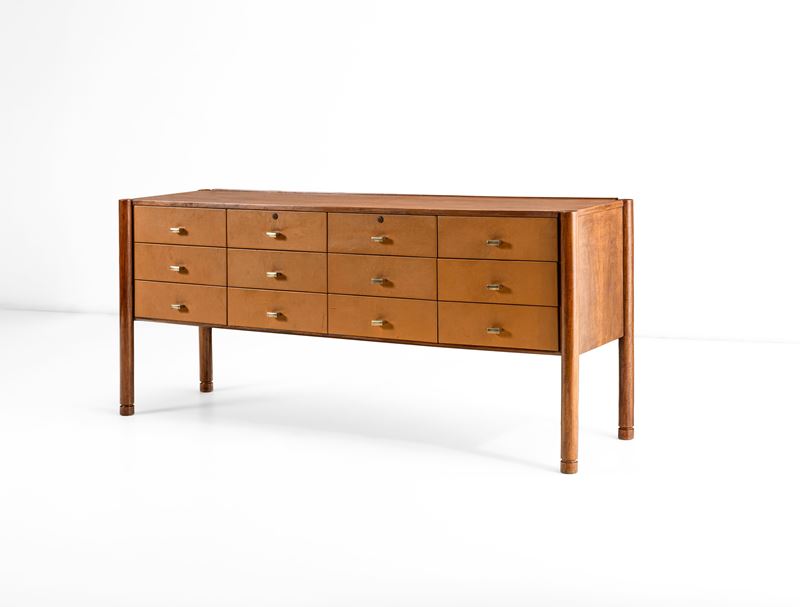 Struttura e sostegni in legno con cassetti rivestiti di pelle. Dettagli e maniglie in ottone.