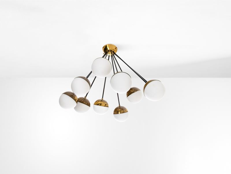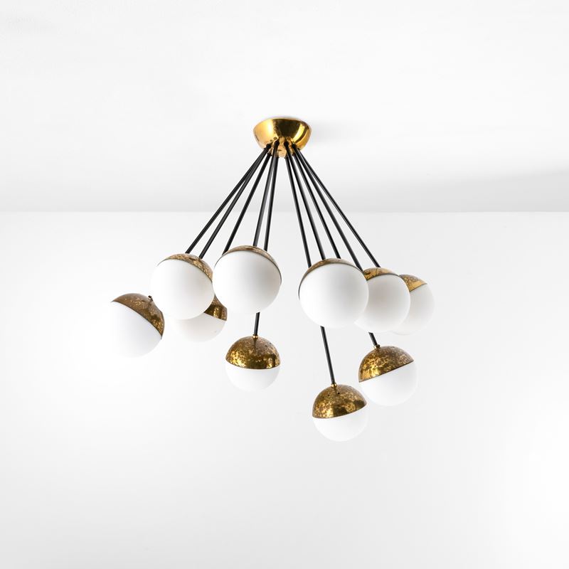 Struttura in ottone e metallo laccato con diffusori in vetro opalino.