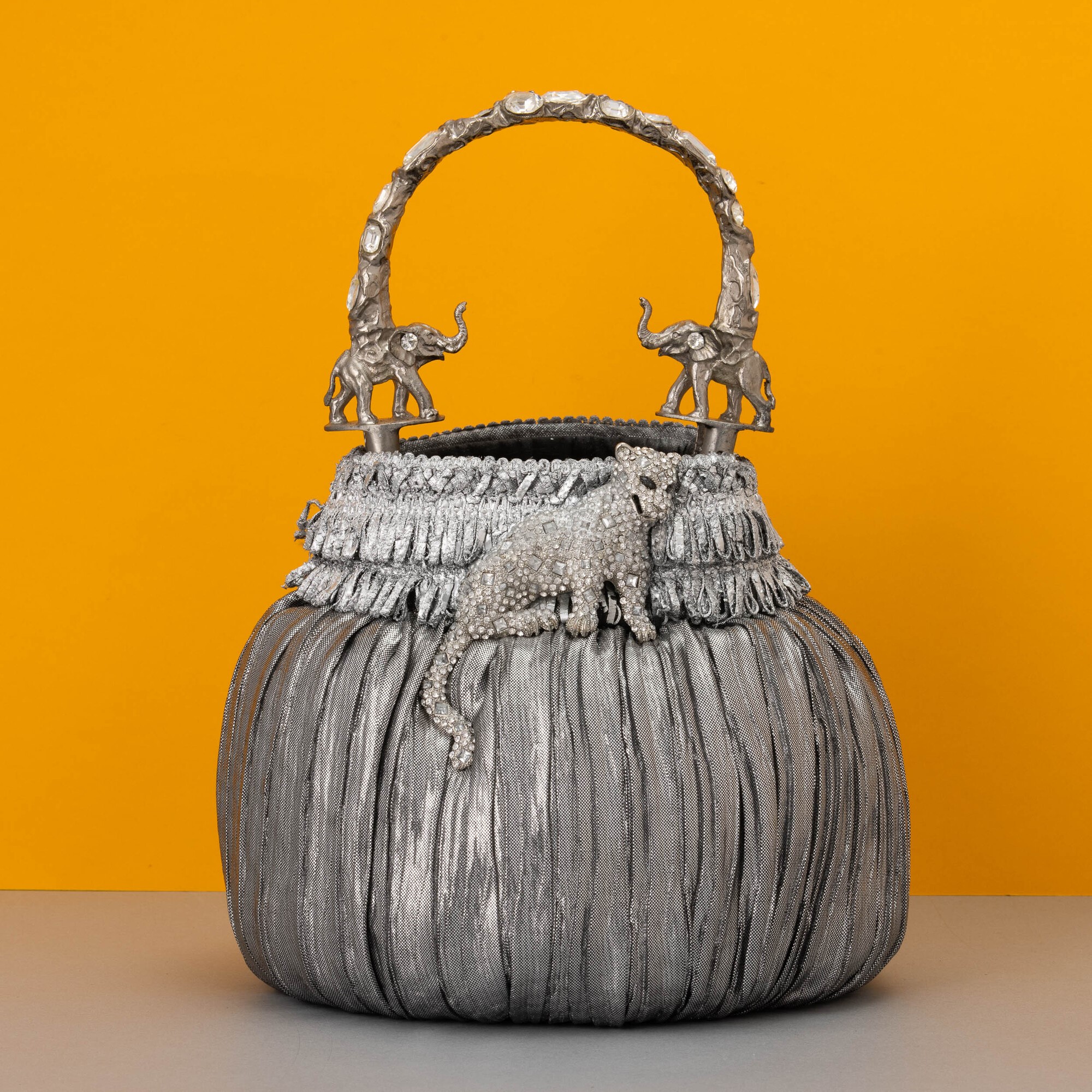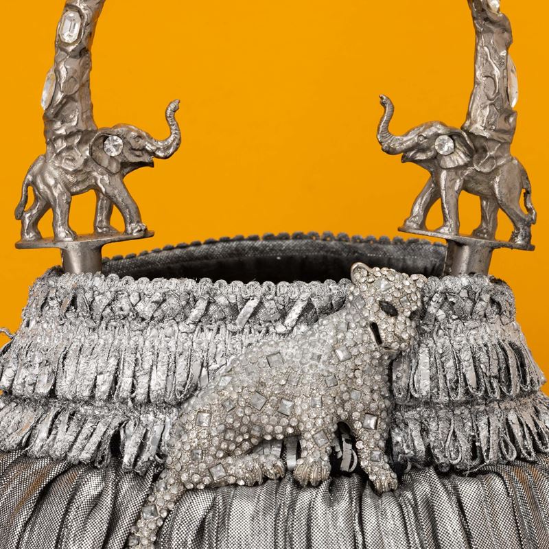 In tessuto con ghepardo e applicazioni preziose , manico in metallo con due elefanti e cristalli, con dustbag