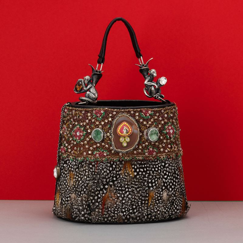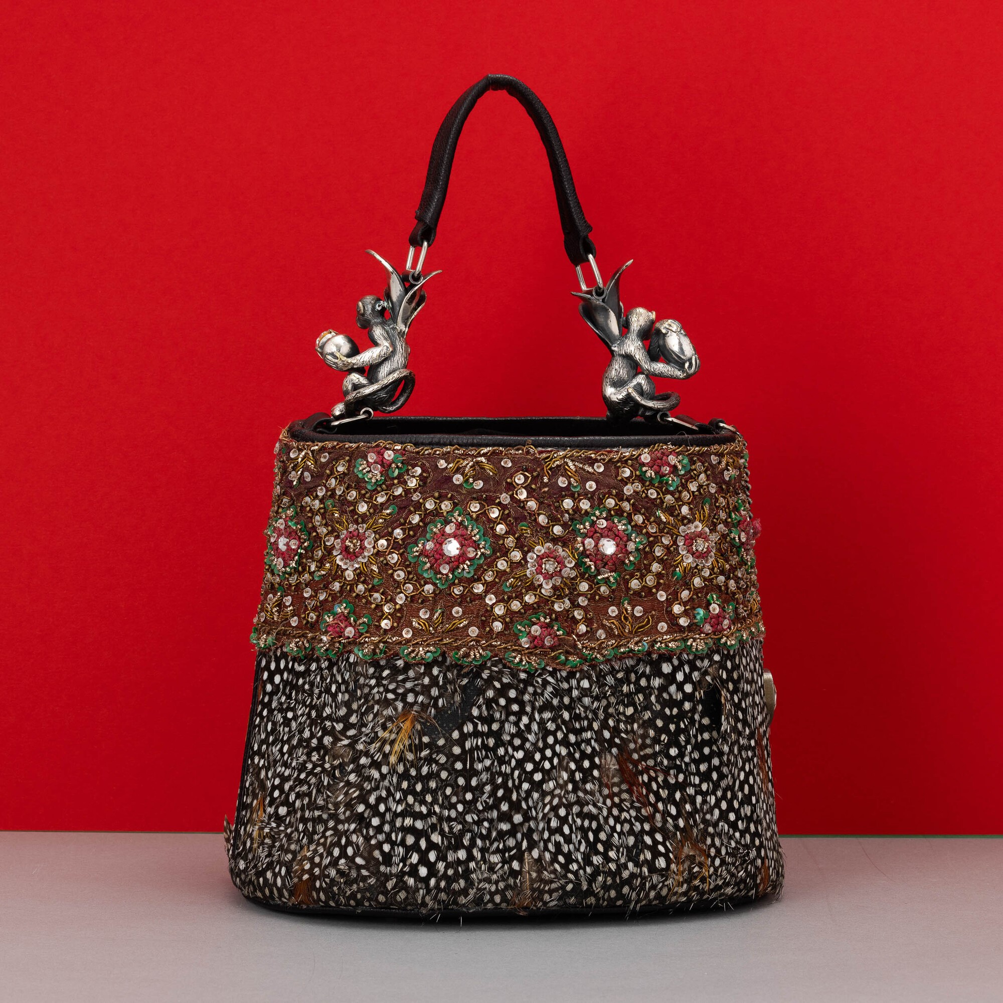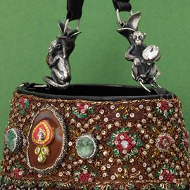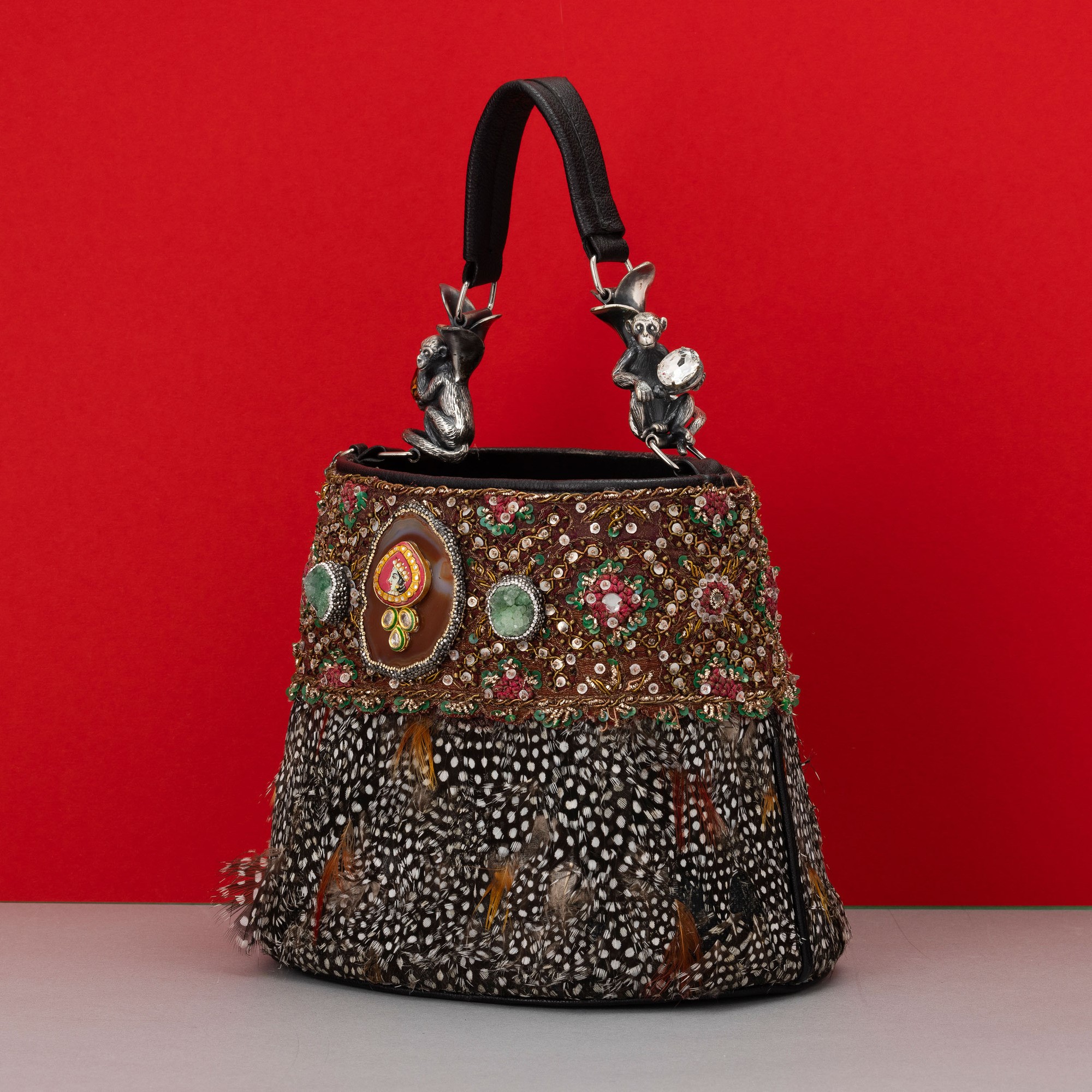 In tessuto con applicazioni preziose, manico in stoffa e metallo con scimmie cristalli con dustbag