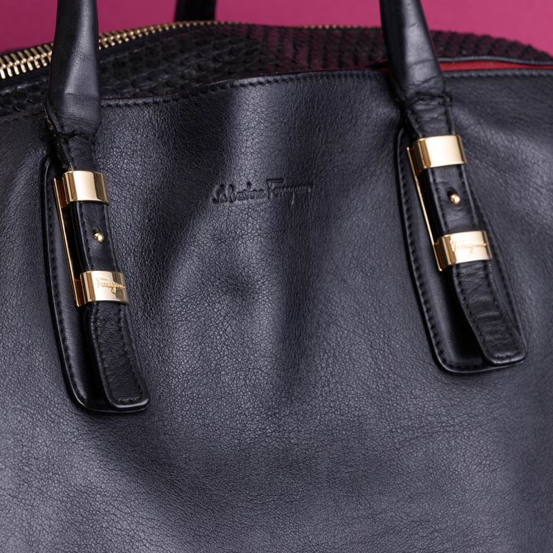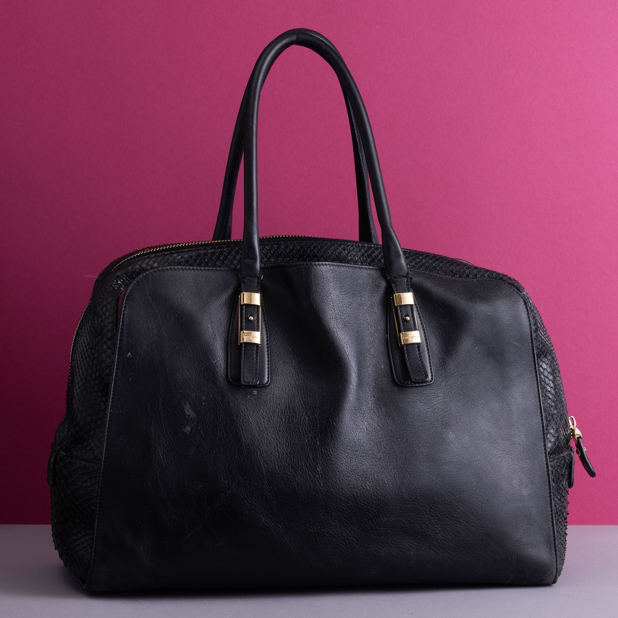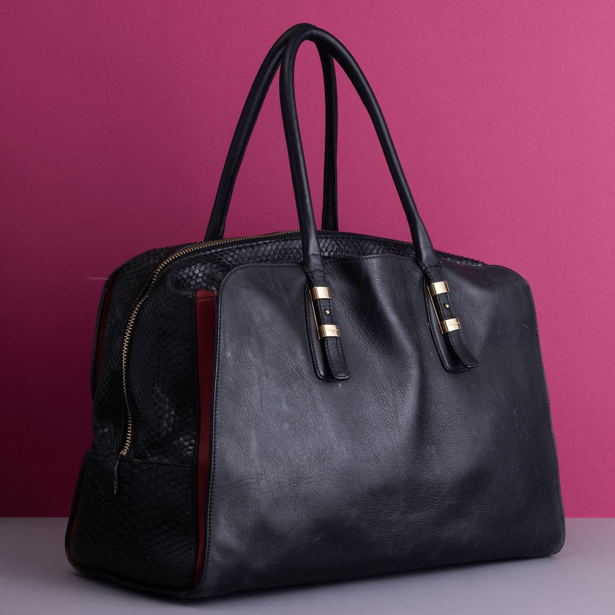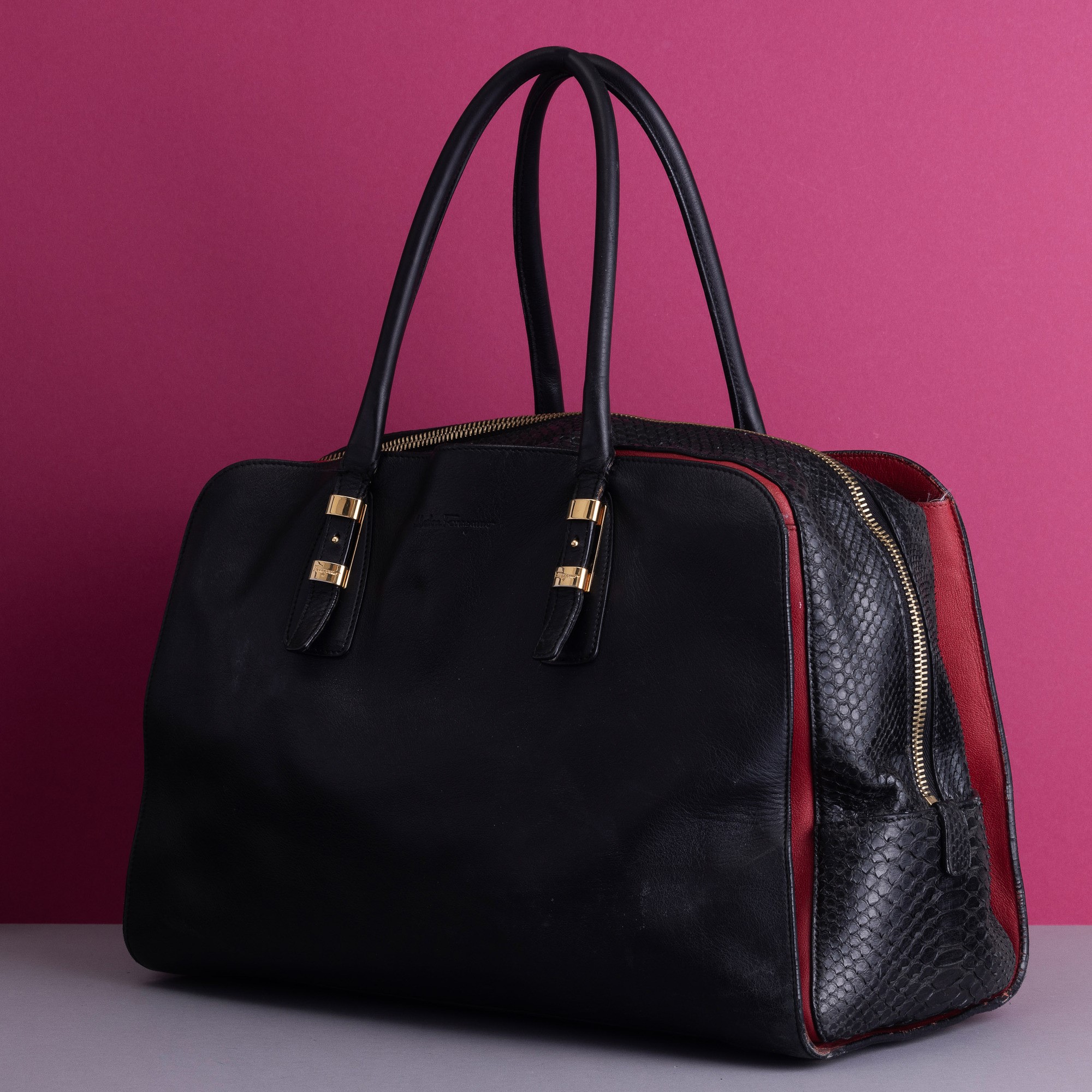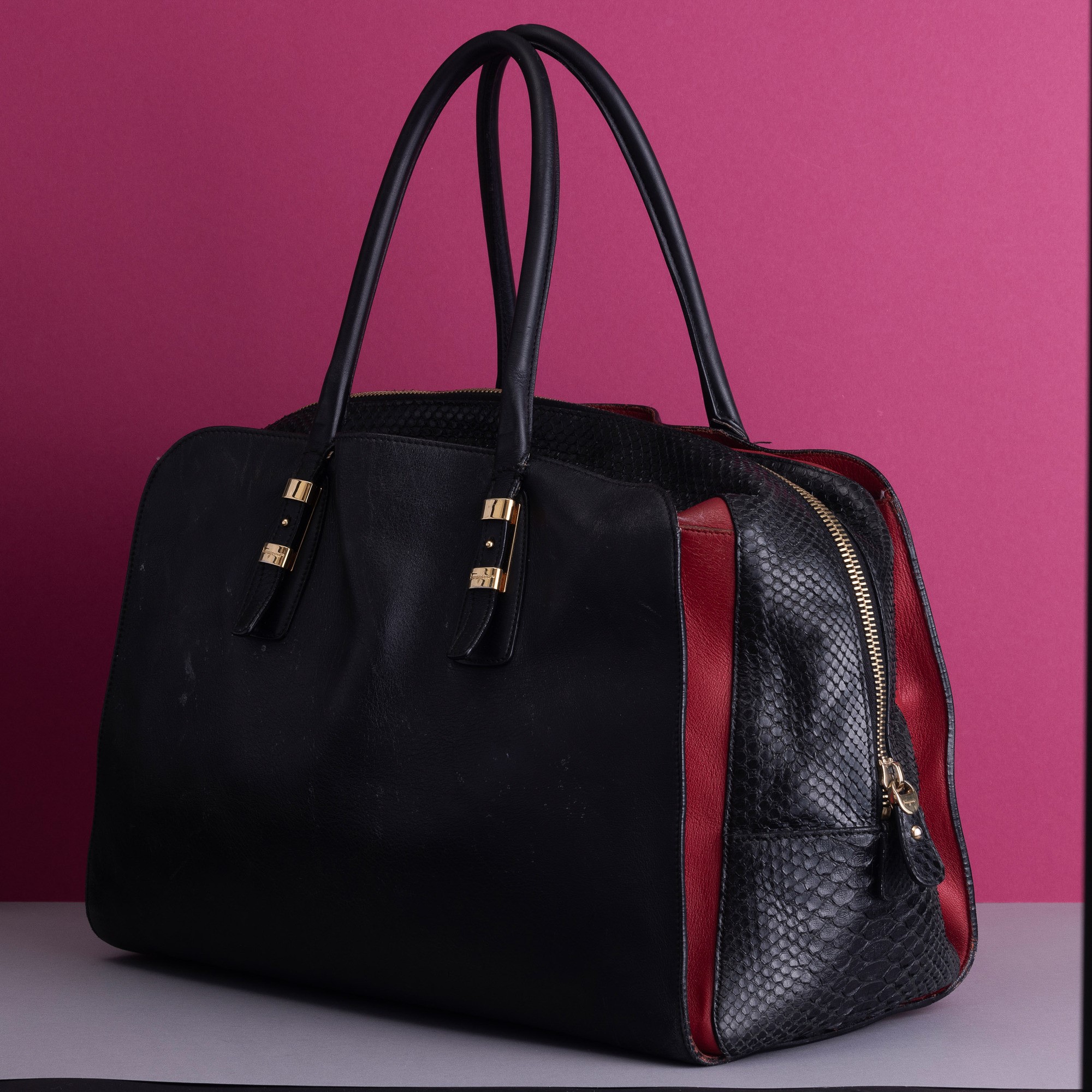 In pelle liscia e martellata nera e rossa, con dust bagg, segni di utilizzo ma in buone condizioni