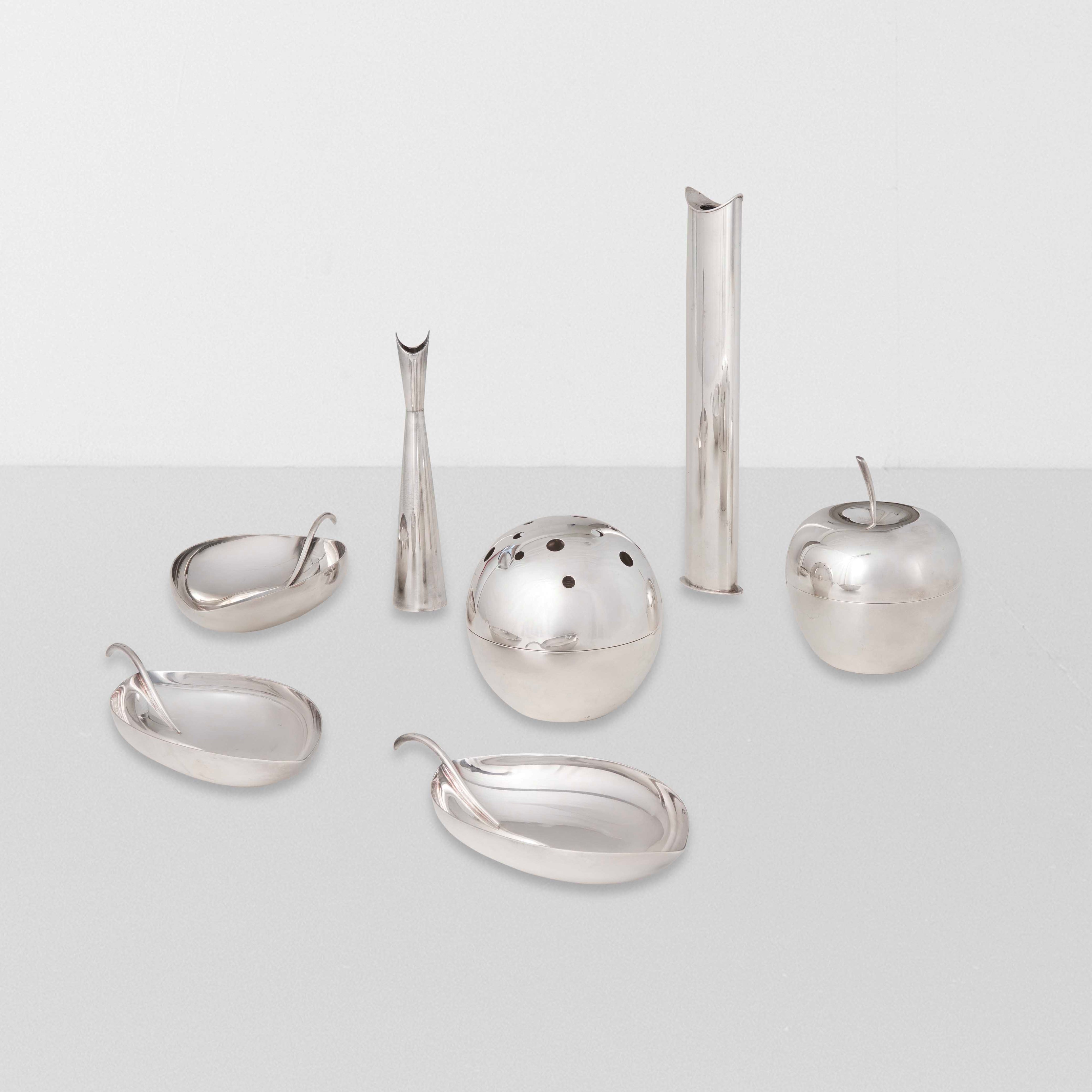 Vaso soliflore mod. Giselle, portafiori mod. Mars, scatola mod. Mela, vaso soliflore mod. Cardinal e tre svuotatasche a foglie.