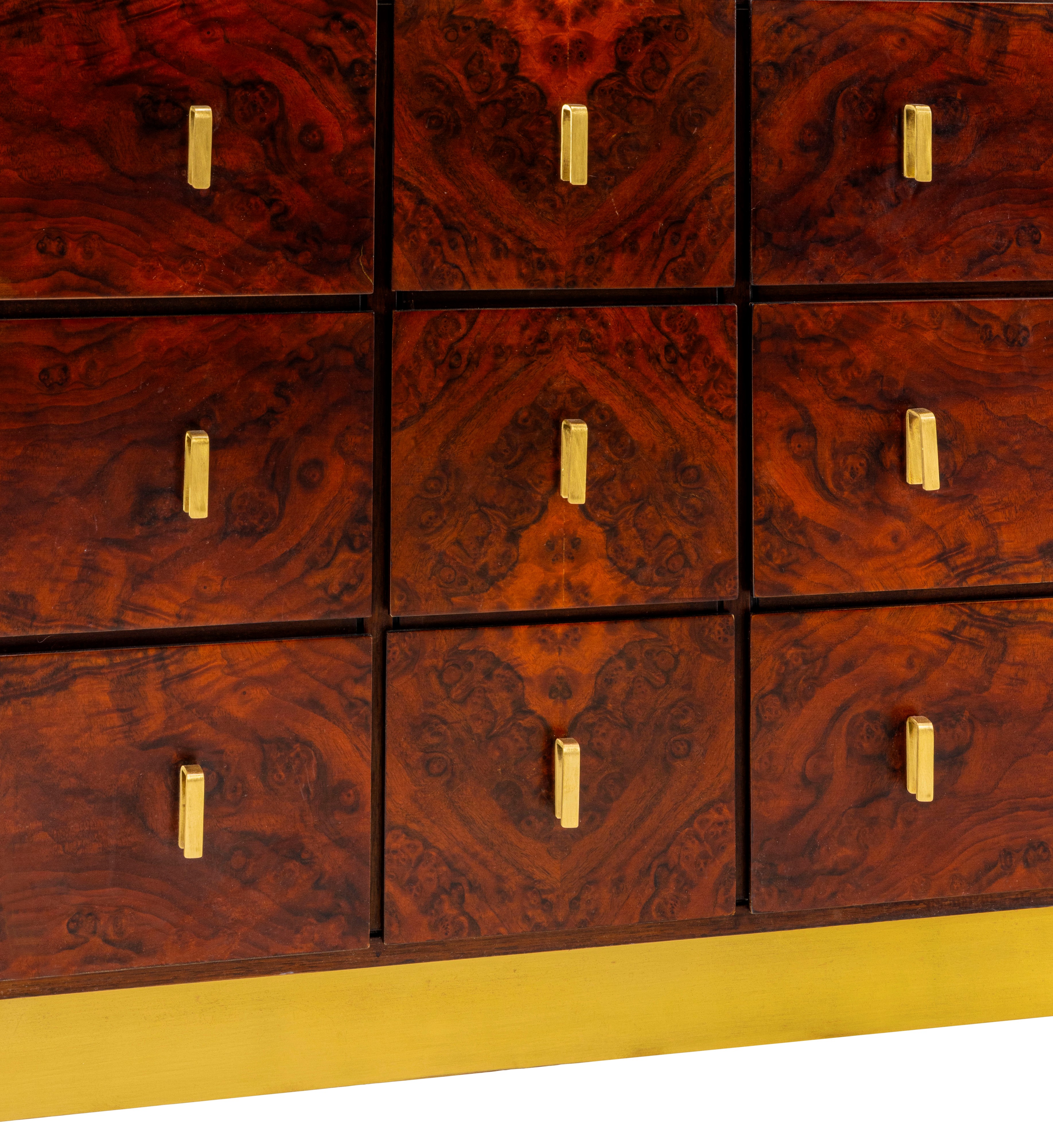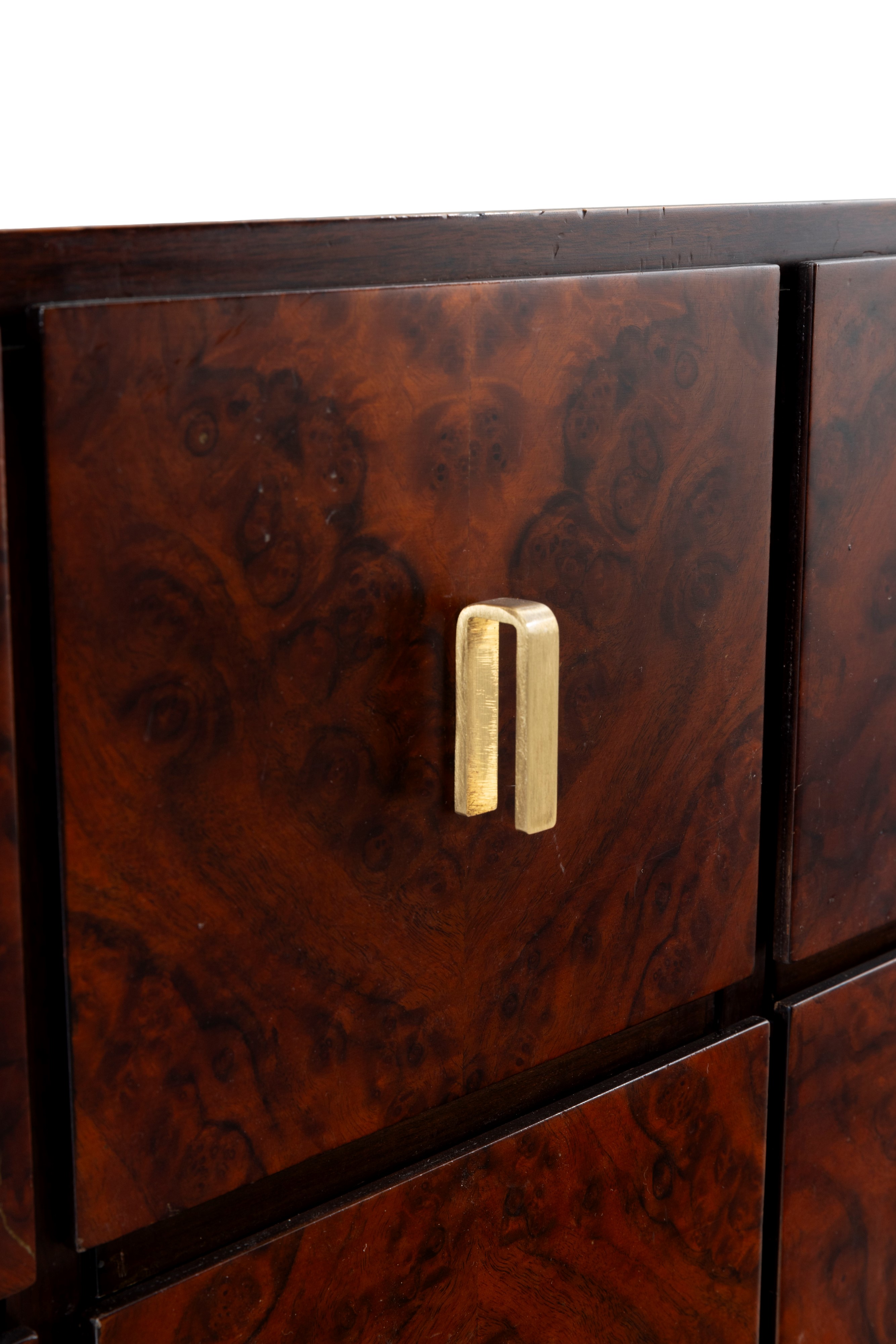 Struttura in radica di legno impiallacciato e maniglie in ottone. Base rivestita in ottone.