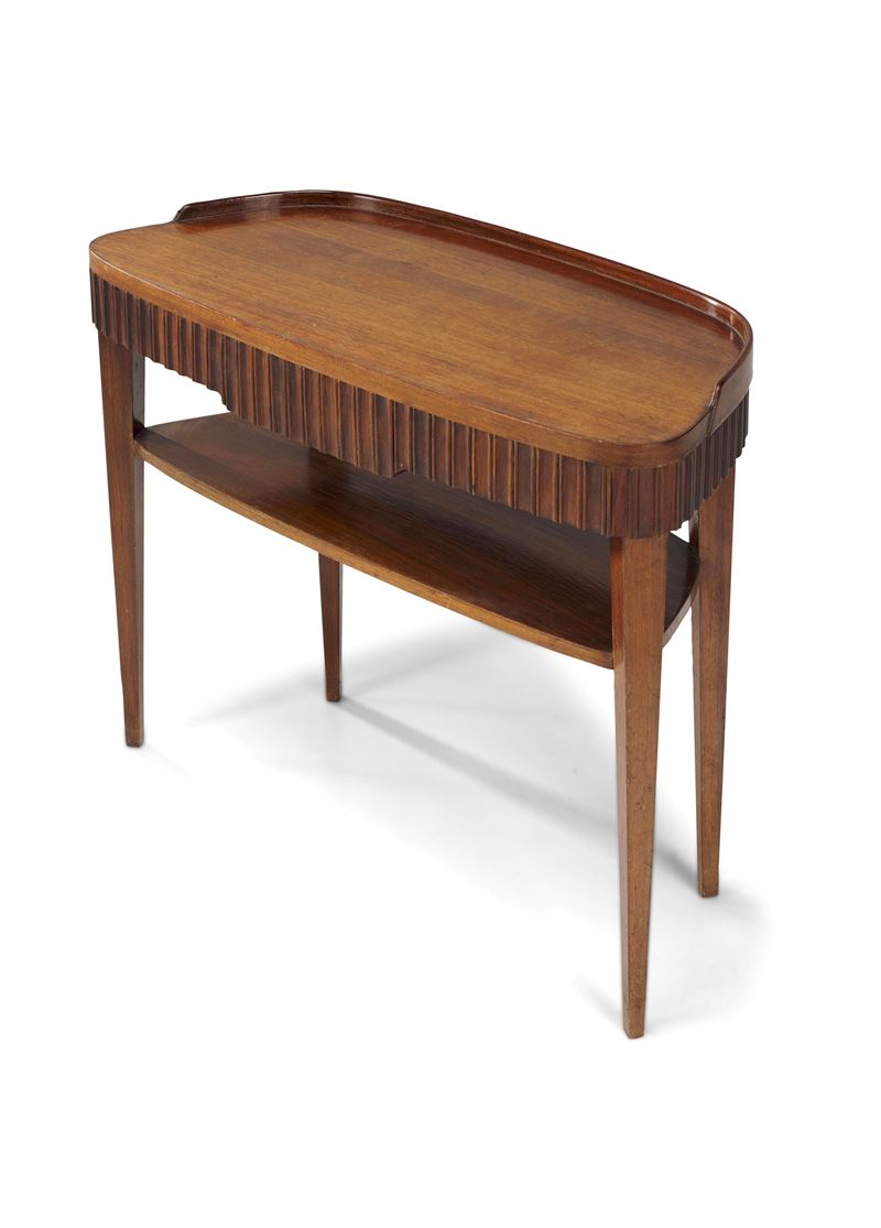 Struttura in legno con piano bordato a vassoio e fronte grissinato.