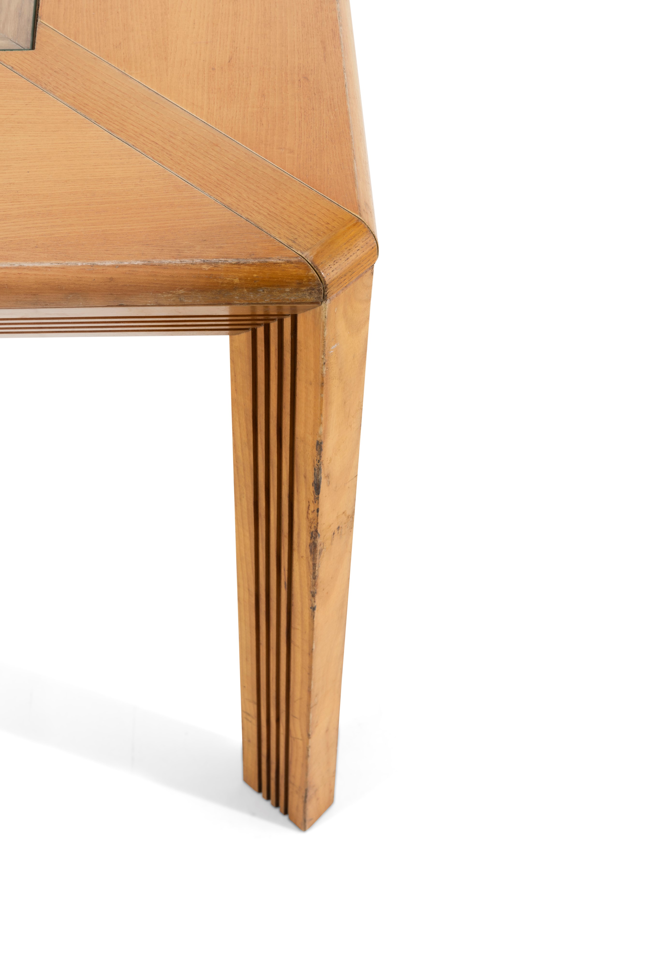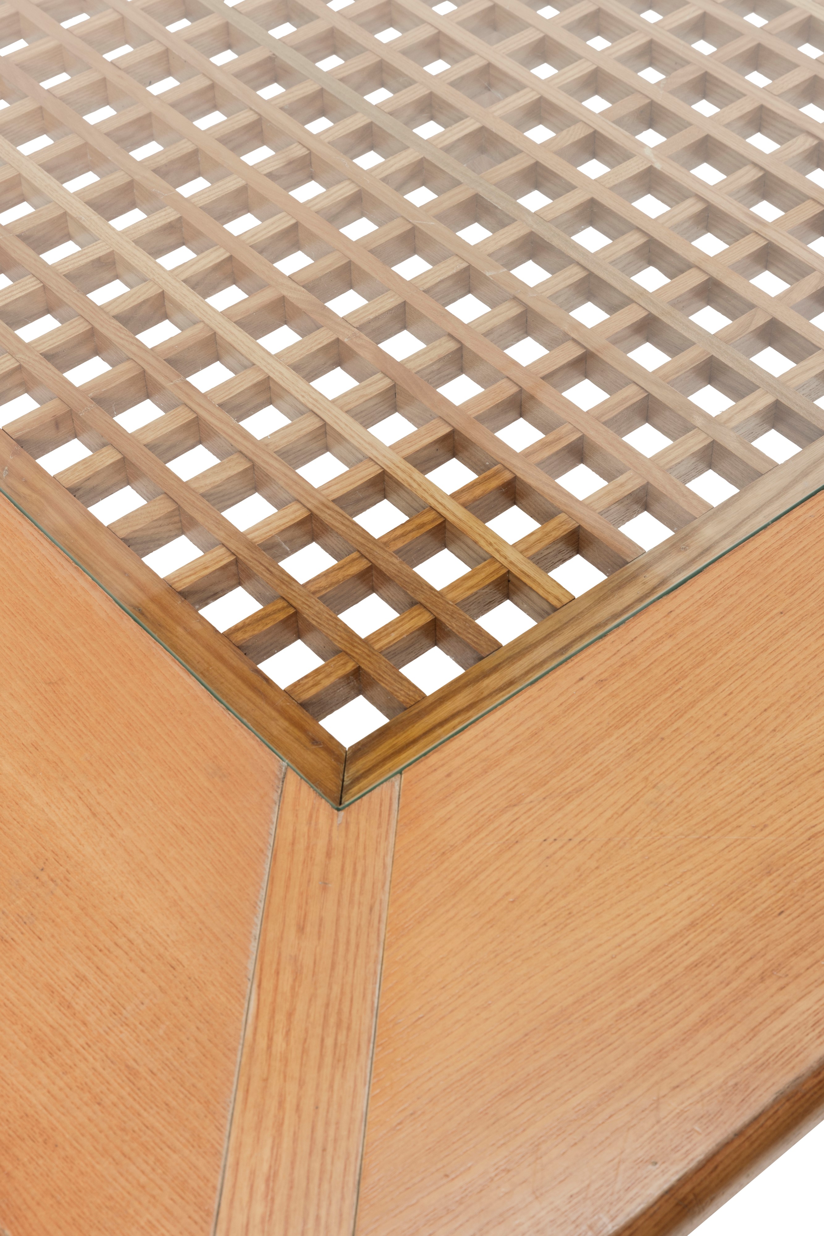 Struttura in legno intagliato con piano in vetro e decoro sottostante a listelli incrociati.