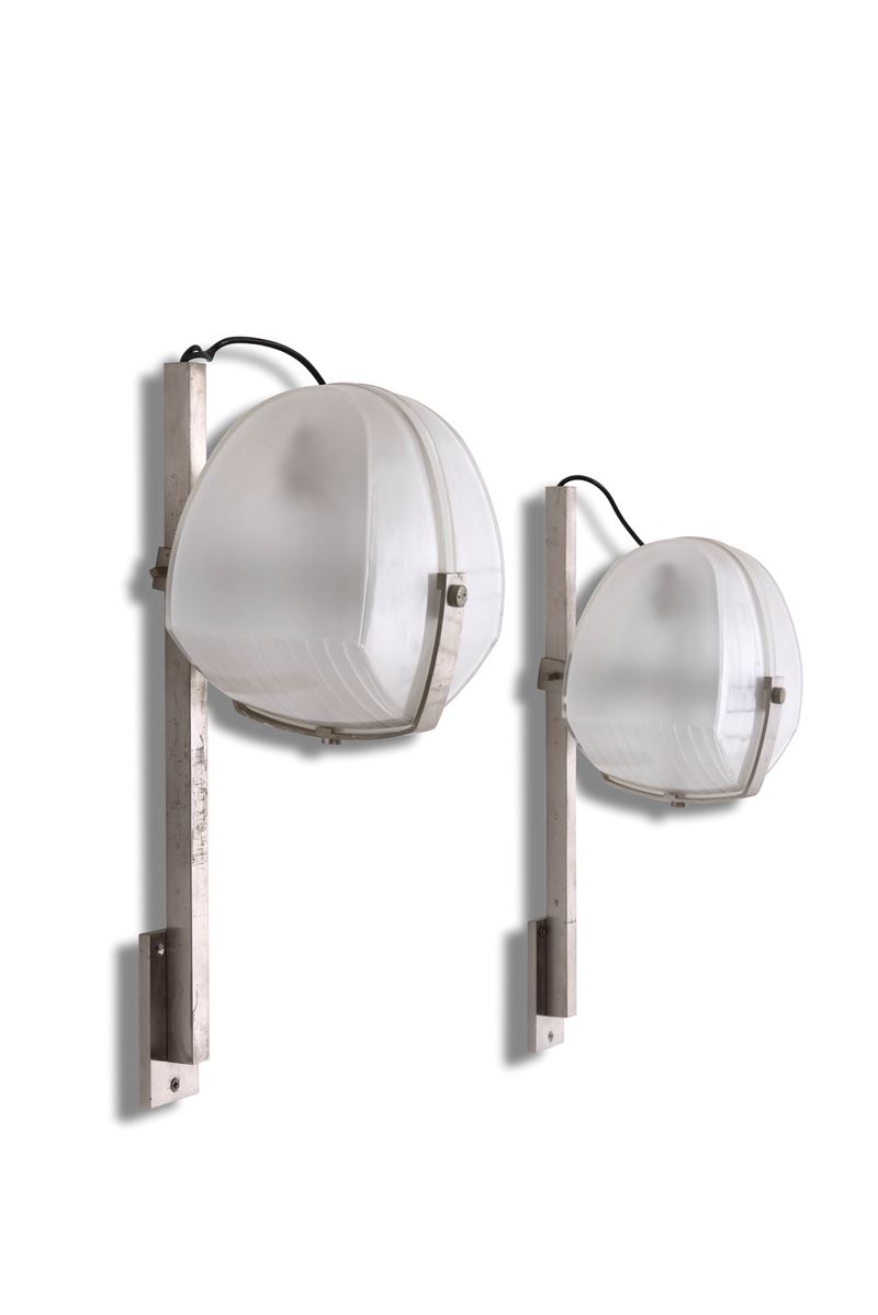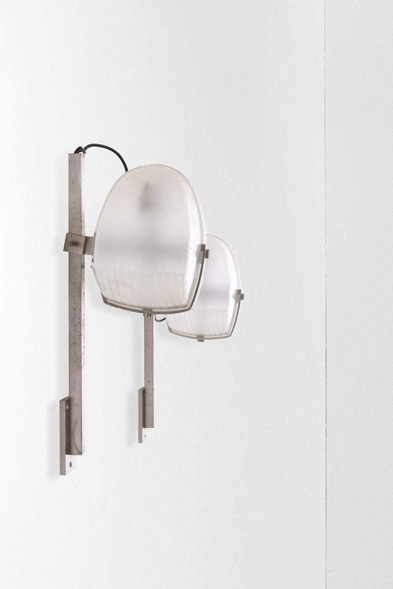 Struttura in ottone nichelato, diffusore regolabile in altezza in vetro stampato satinato.