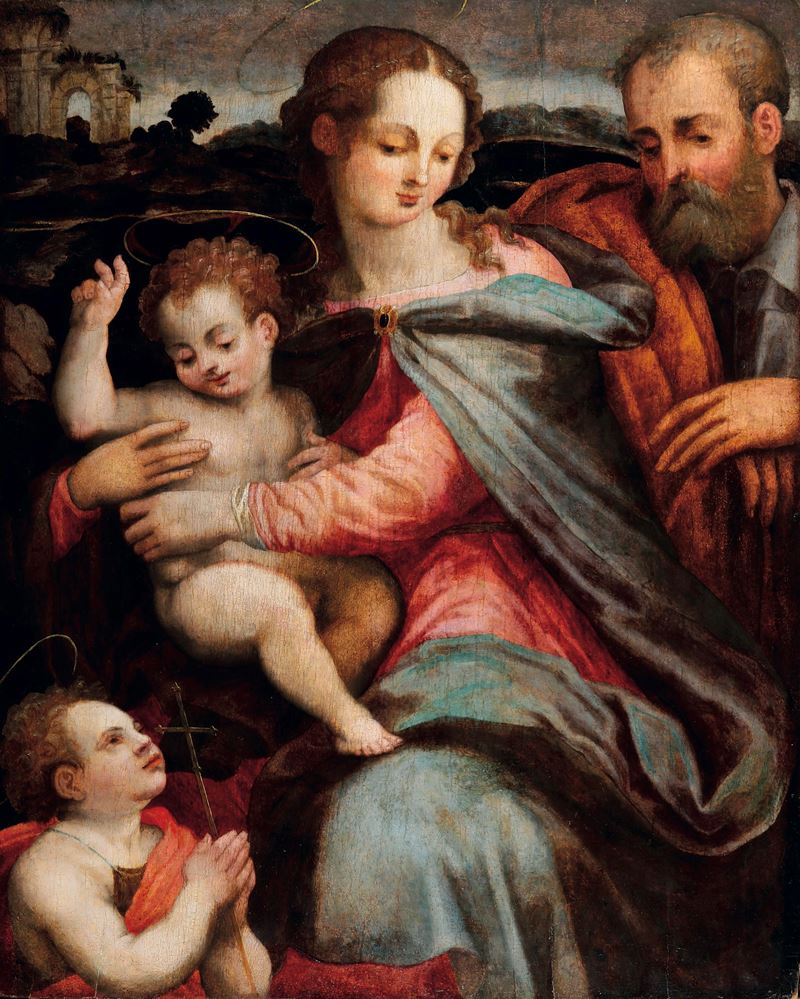 La Sacra Famiglia con San Giovannino qui presentata è un eccellente esempio della produzione di Michele Tosini, conosciuto anche come Michele di Ridolfo del Ghirlandaio, allievo prediletto di Ridolfo del Ghirlandaio, dal quale prese appunto il nome. Artista assai conteso nella Firenze della prima metà del Cinquecento da parte delle principali famiglie aristocratiche, si specializzò in particolar modo nella produzione di Sacre Famiglie, soggetto più volte replicato dal Tosini per far fronte alla grande richiesta di queste sue opere da parte della committenza. L’intimità familiare si fonde qui con un linguaggio formale ricco di pathos e spiritualità, elementi che sottolineano come queste tavole fossero destinate alla devozione privata. L'equilibrio compositivo, la raffinatezza del colore e il paesaggio “all’antica” sullo sfondo rappresentano le cifre stilistiche della produzione di Michele di Ridolfo, che si farà anche raffinato interprete delle invenzioni michelangiolesche, collaborando a stretto contatto con Giorgio Vasari.
