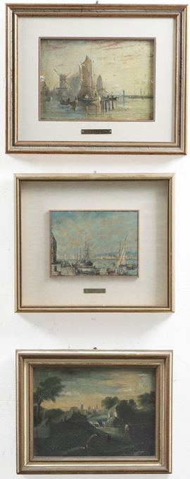 Una veduta di porto a firma L. Basile, un paesaggio con figure presumibilmente del XVIII-XIX secolo e una veduta marina da Turner