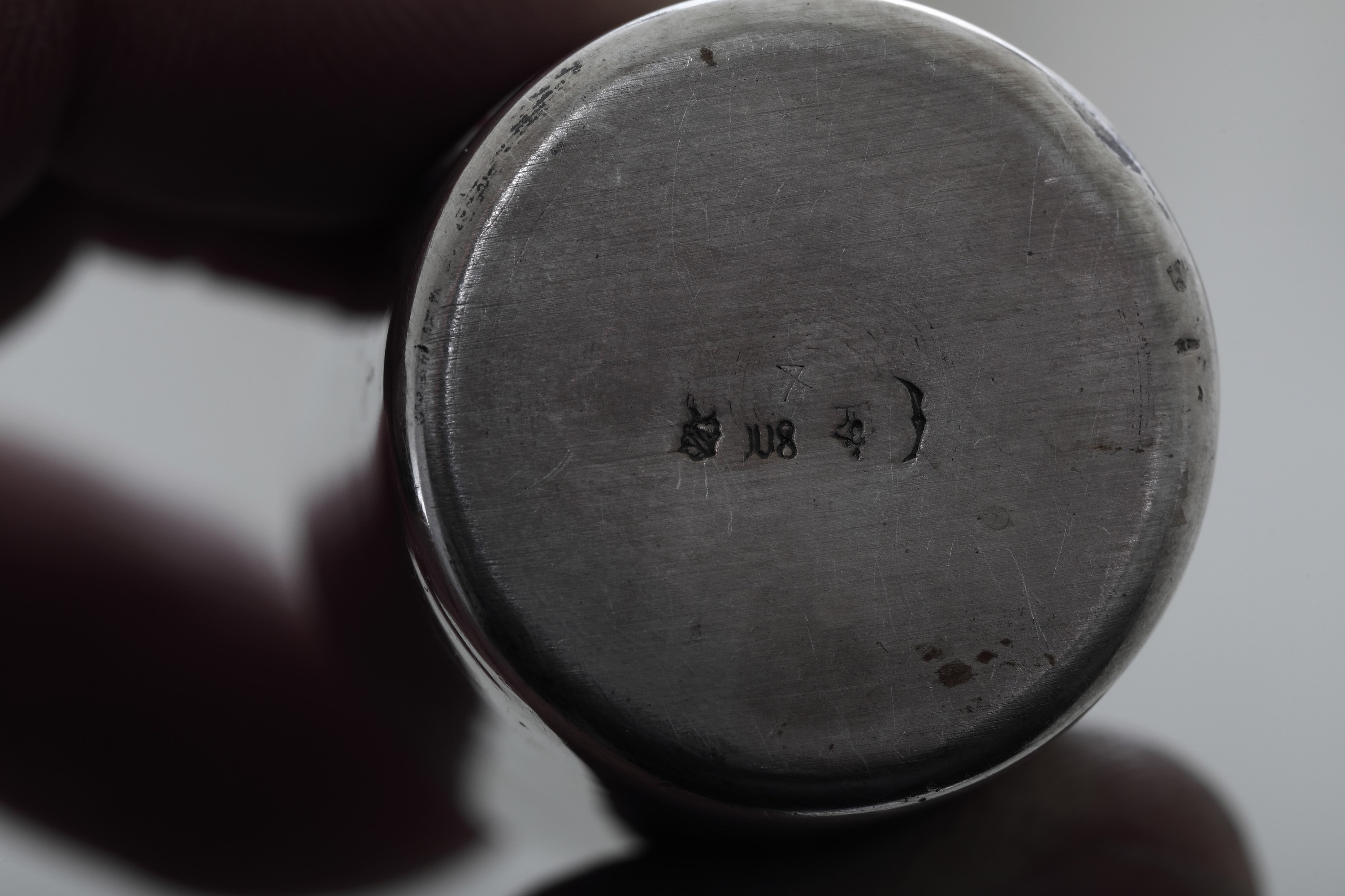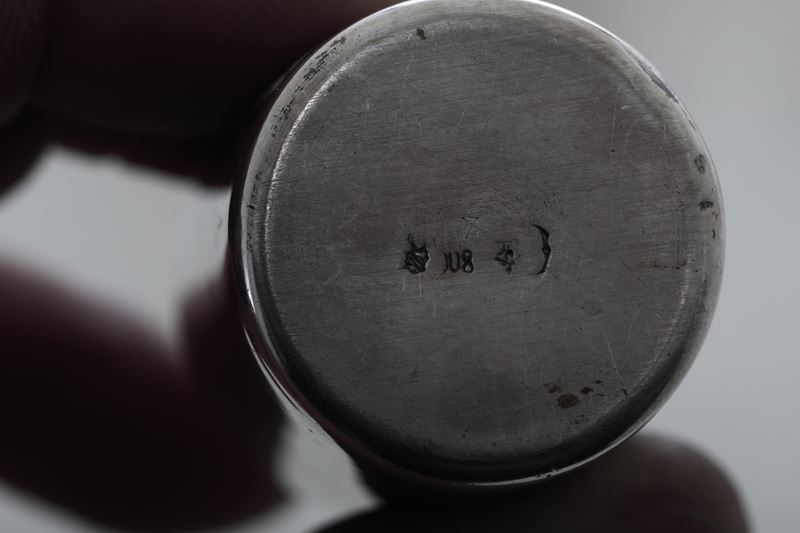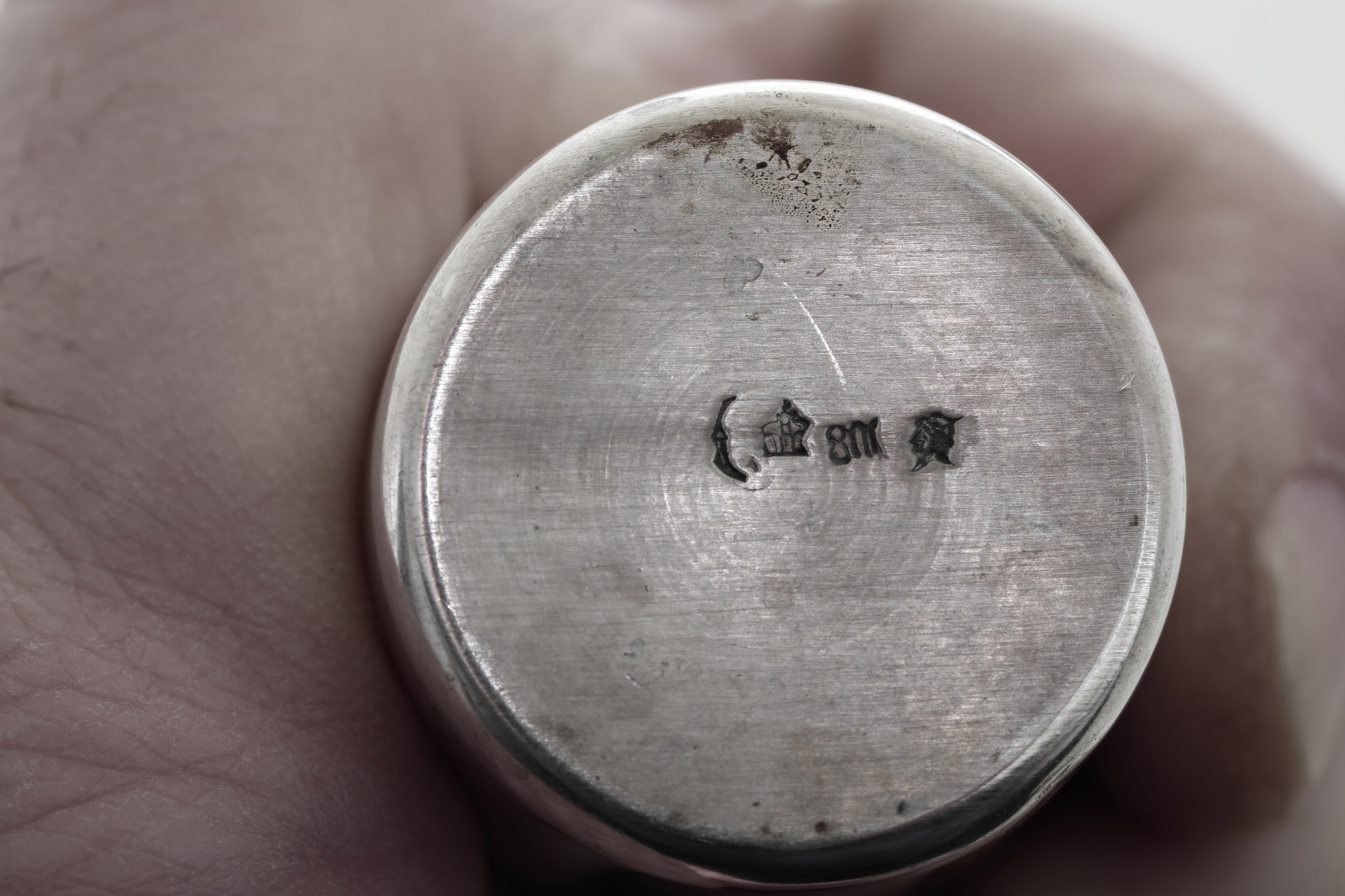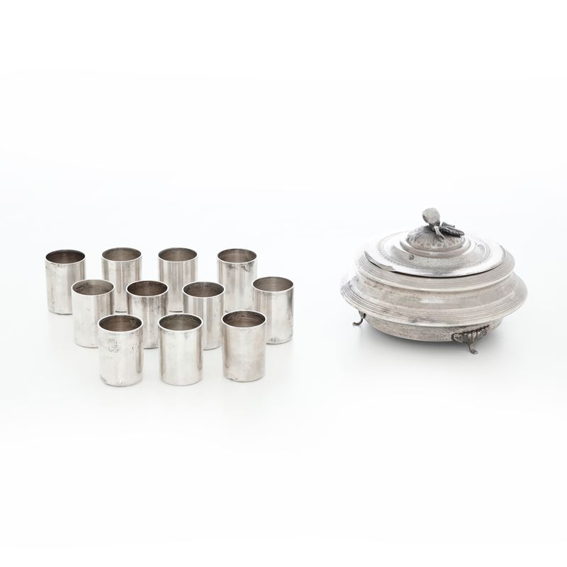 Lotto di 11 bicchierini e un supporto con coperchio in argento. Germania XX secolo