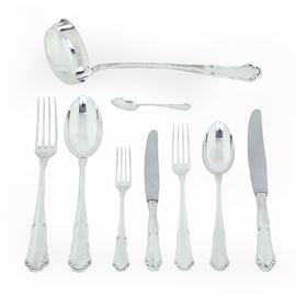 composto da: 12 forchette, 6 cucchiai, 6 coltelli, 6 forchette dolce, 6 coltelli dolce, 6 cucchiaini, tre posate da portata. In custodia