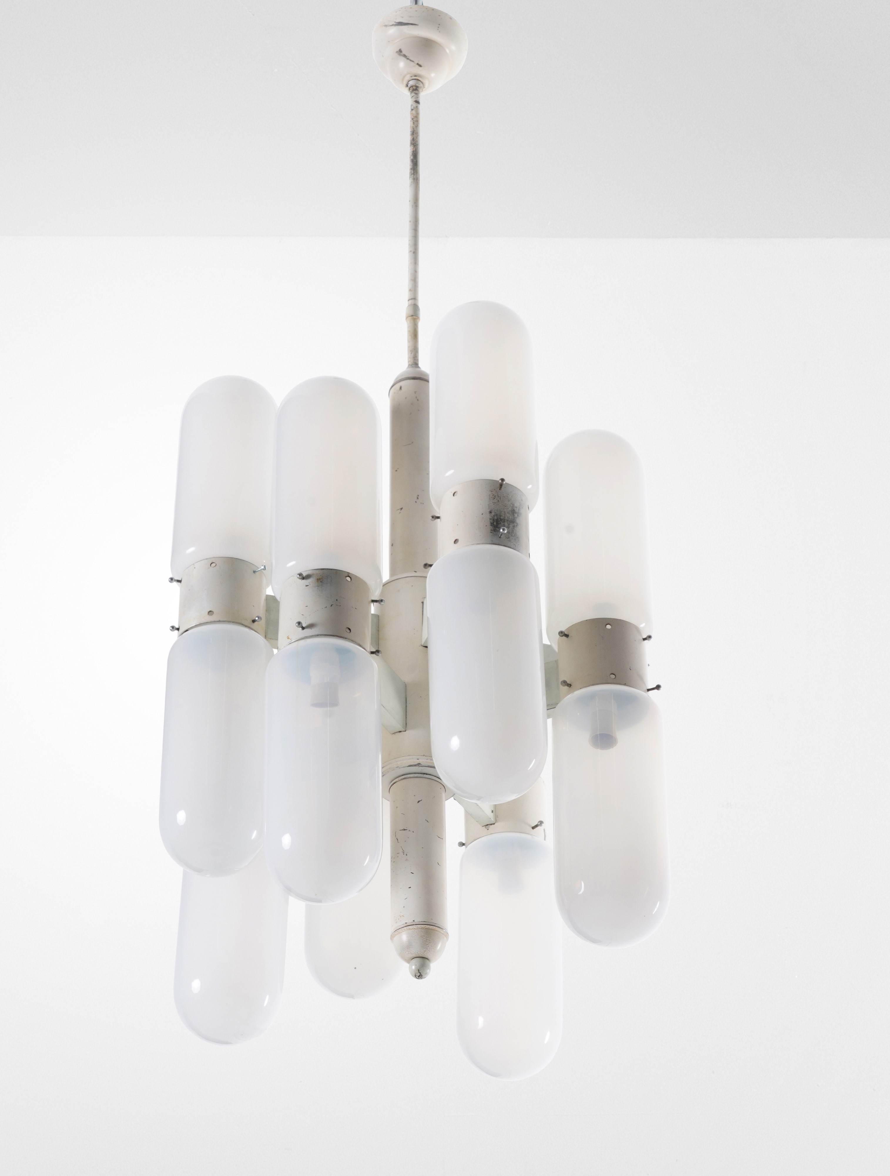 Struttura in acciaio spazzolato e alluminio pressofuso e diffusori in vetro opalino.