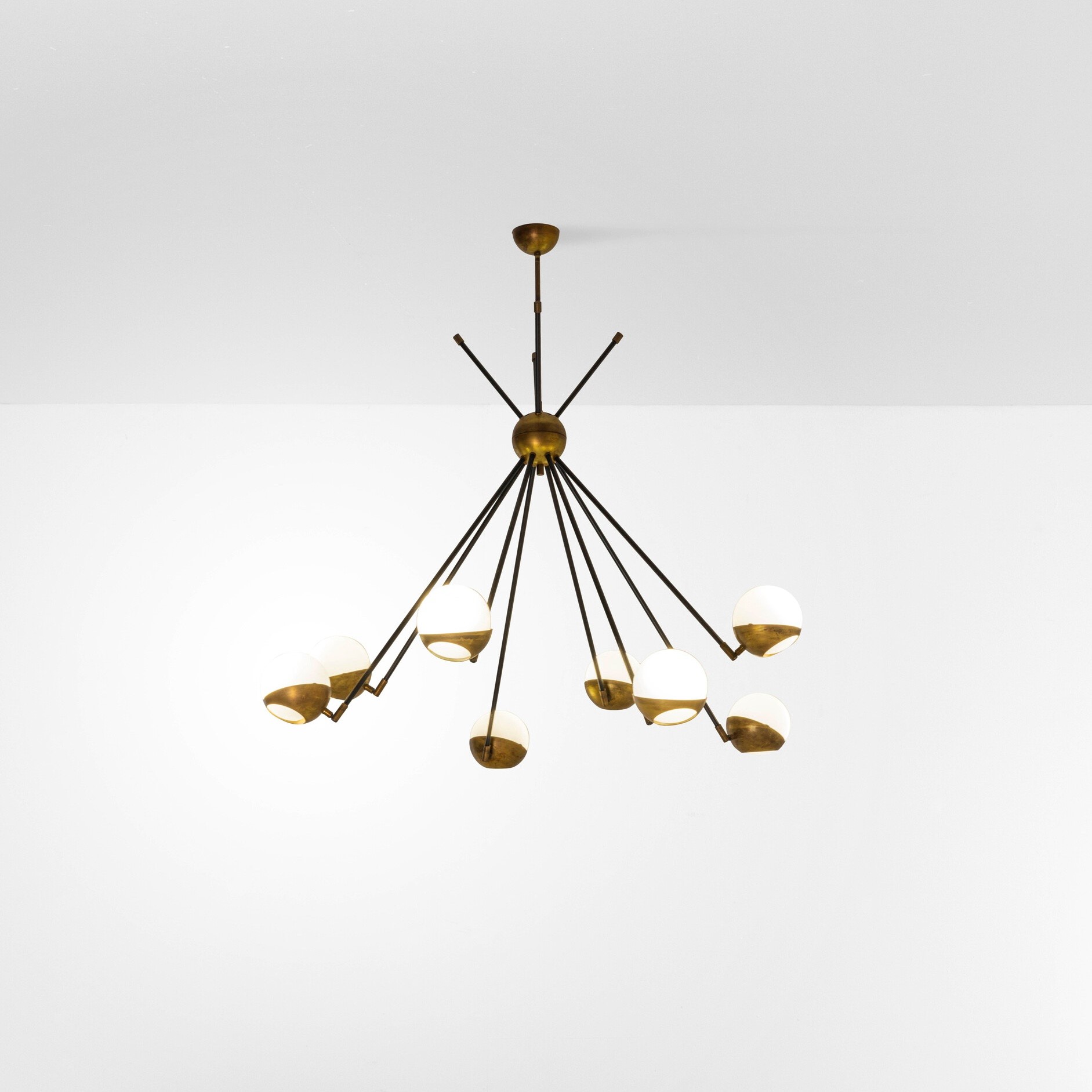 Struttura in metallo laccato e ottone, diffusori in vetro opalino bianco.