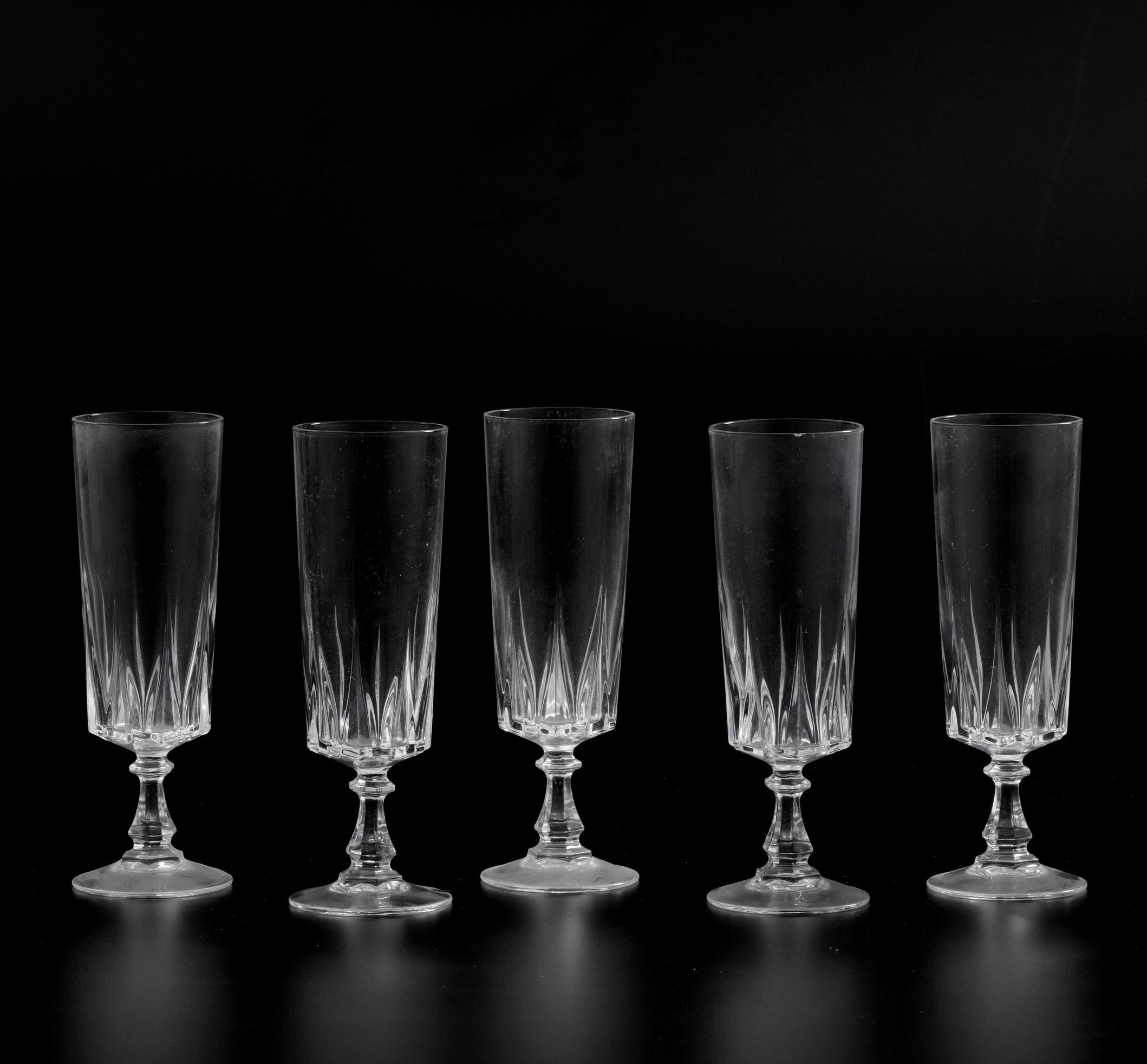 Cristallo. Marca: assente. Altezza cm 18. Conservazione: un’insignificante sbeccatura su una flûte.